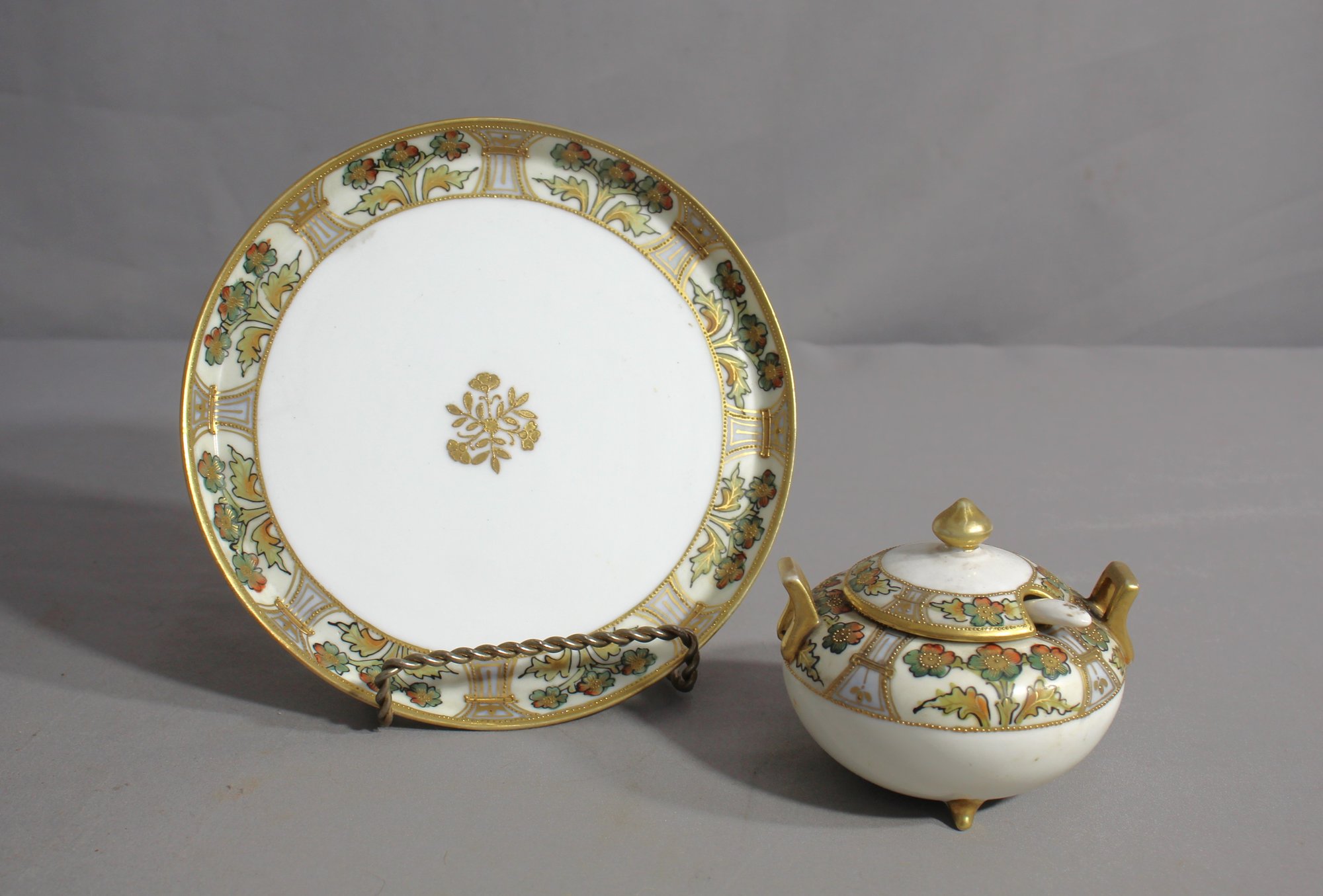 This delightful set is characterized by its delicate floral motif, rendered in a serene blue, accented with lush gold beading that enhances its exquisite profile. The sugar bowl stands elegantly on a beaded foot, crowned with a matching lid, while the plate boasts a harmonious design ,This set embodies the allure of Nippon porcelain, renowned for its beauty and quality