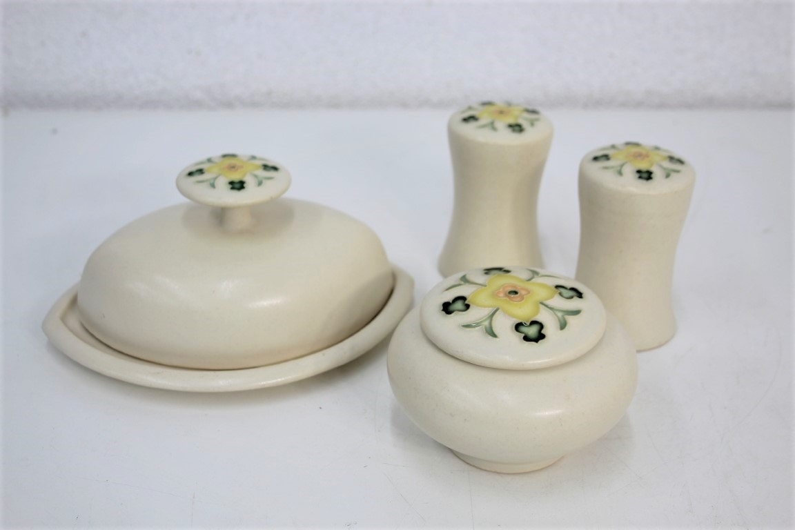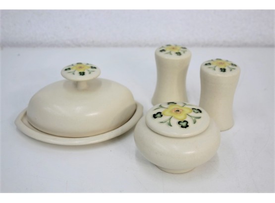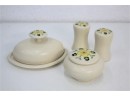 One Acre Ceramics Ivory Glaze And Wild Flower Pattern Salt & Pepper Set, Covered Jar, And Butter Plate