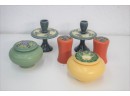 One Acre Ceramics Lot - 2 Covered Jars Peacock And Wild Flower Patterns, Candlestick, Orange Salt/Pepper Set