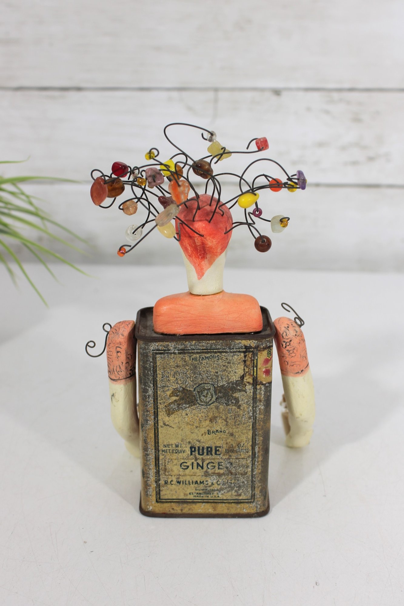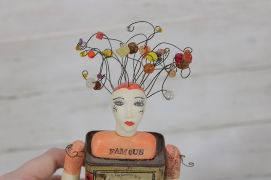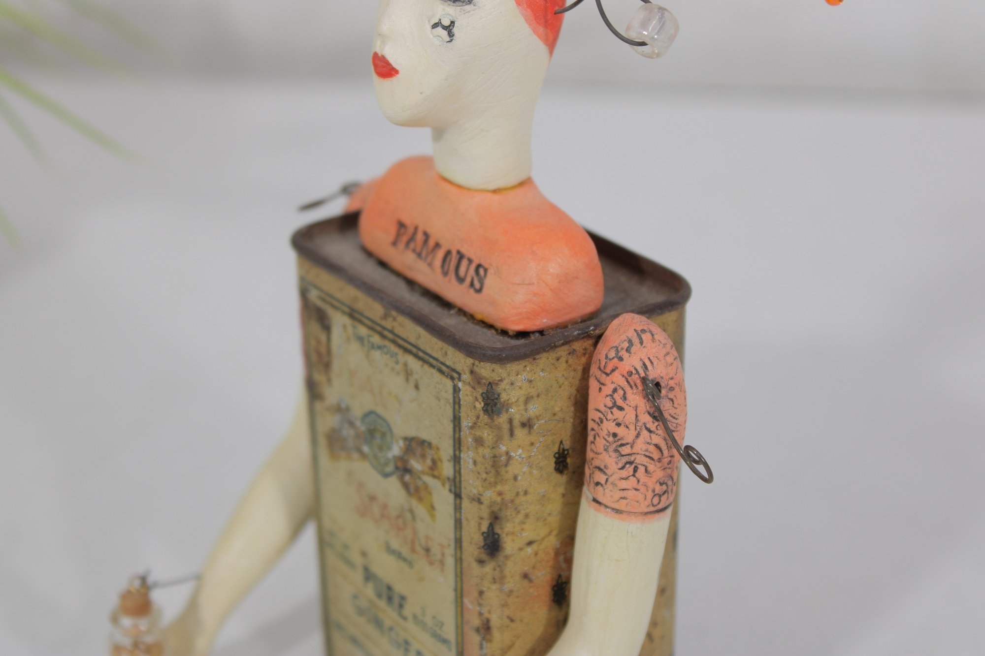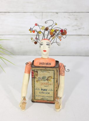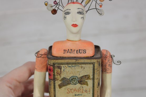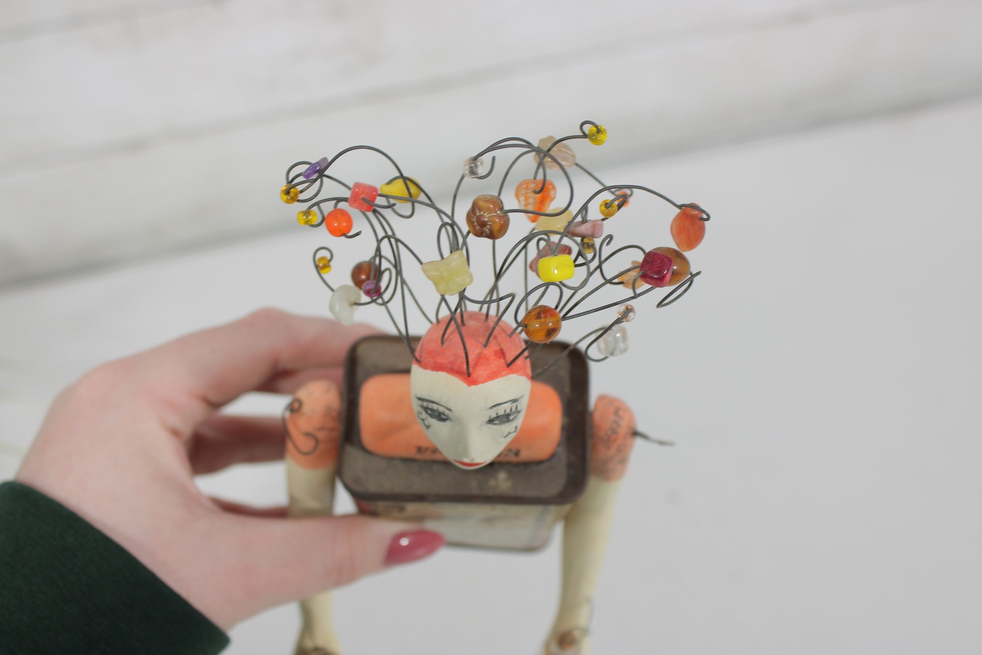 a one-of-a-kind mixed media folk art sculpture featuring a whimsical female figure design incorporating found objects and handcrafted elements. The piece blends sculpture, assemblage, and decorative art to create a unique artistic statement.