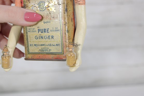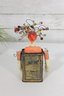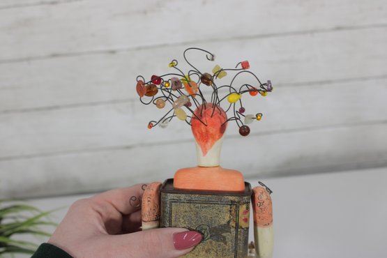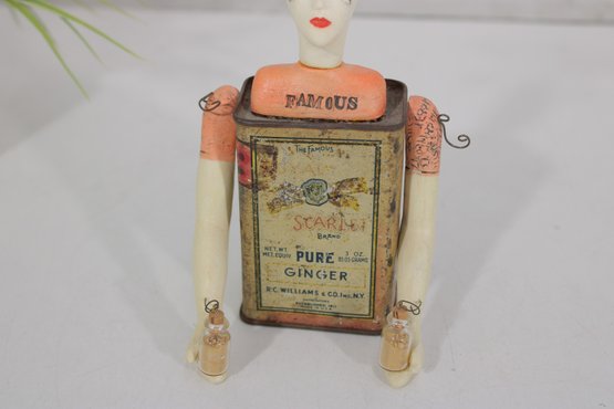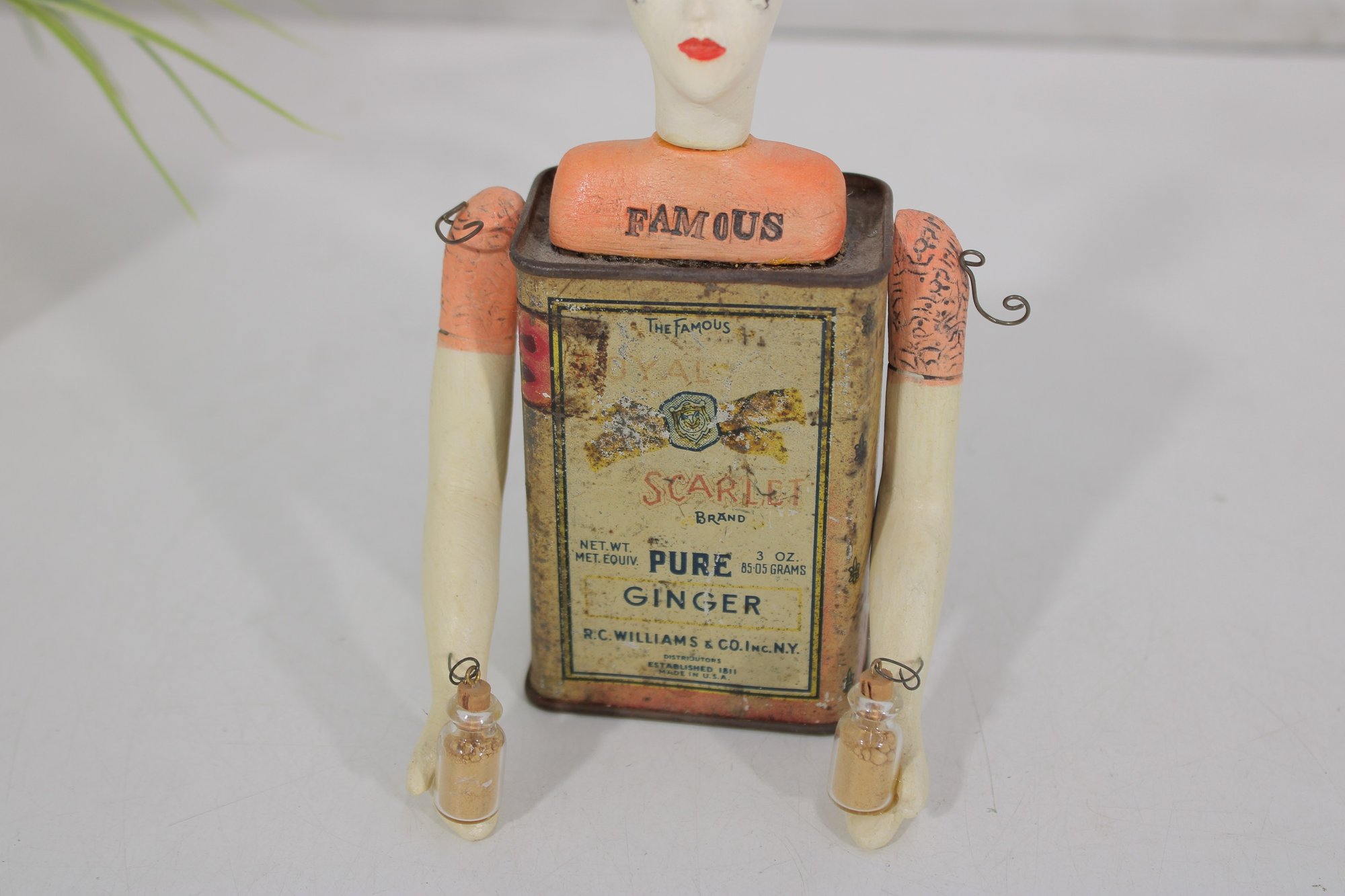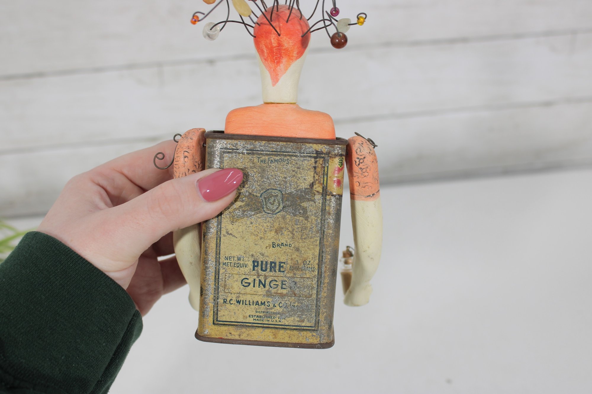 a one-of-a-kind mixed media folk art sculpture featuring a whimsical female figure design incorporating found objects and handcrafted elements. The piece blends sculpture, assemblage, and decorative art to create a unique artistic statement.
