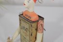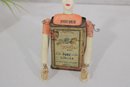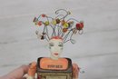 The figure features a stylized head and torso mounted on a rectangular body displaying a vintage-style label. The head is adorned with an elaborate wire and bead headpiece, creating a dramatic and colorful crown-like effect. The arms extend outward and hold small decorative elements, adding to the expressive personality of the piece.