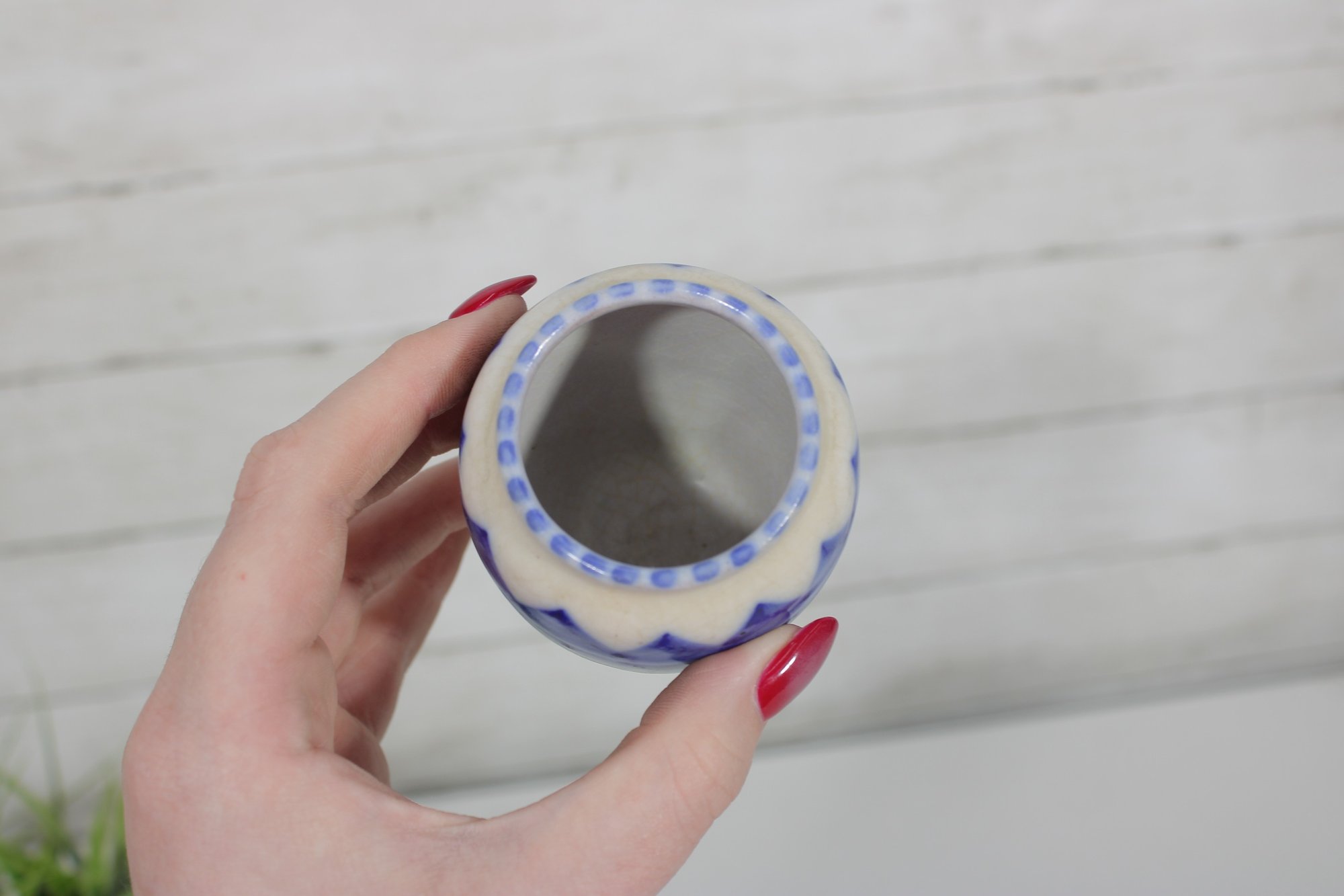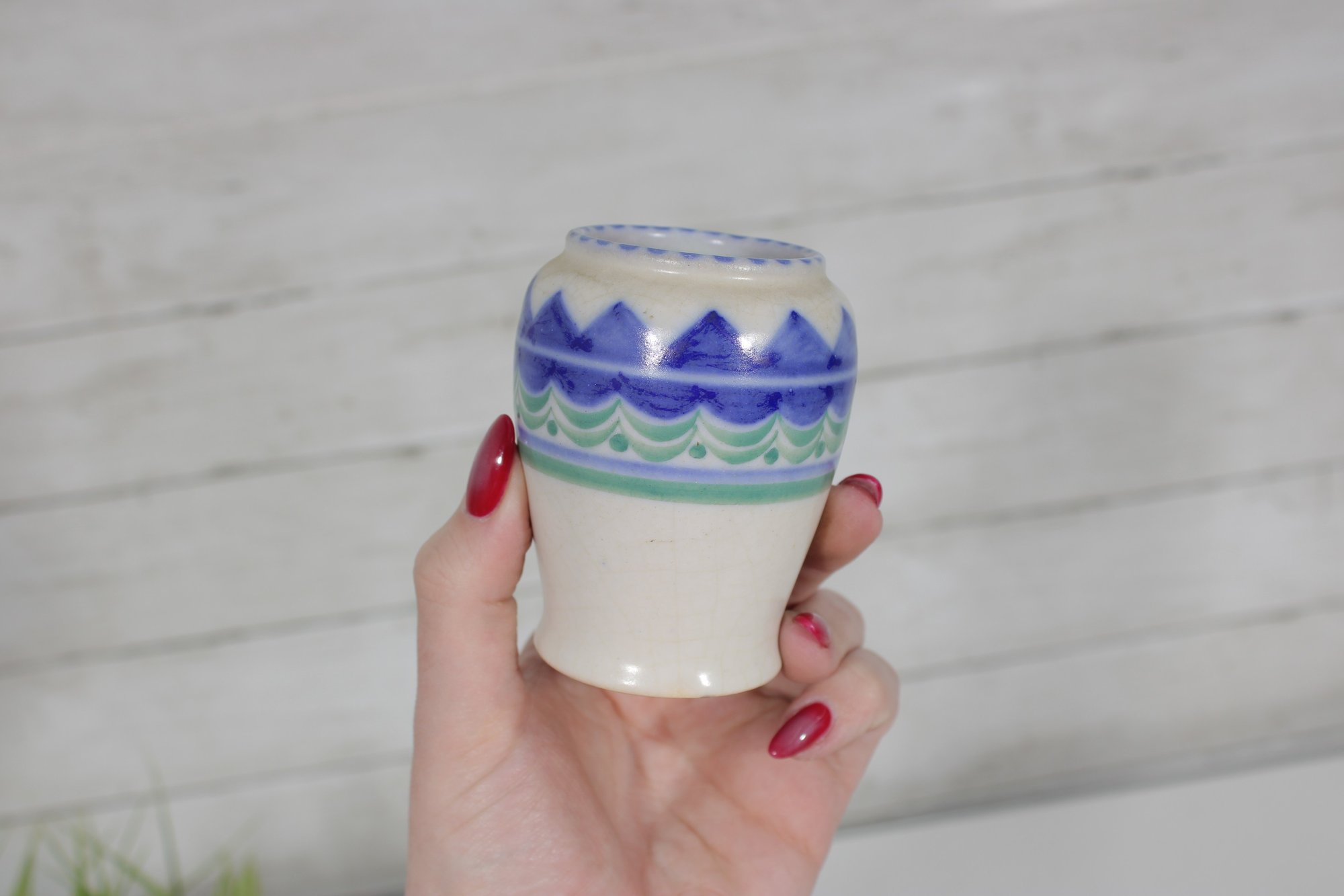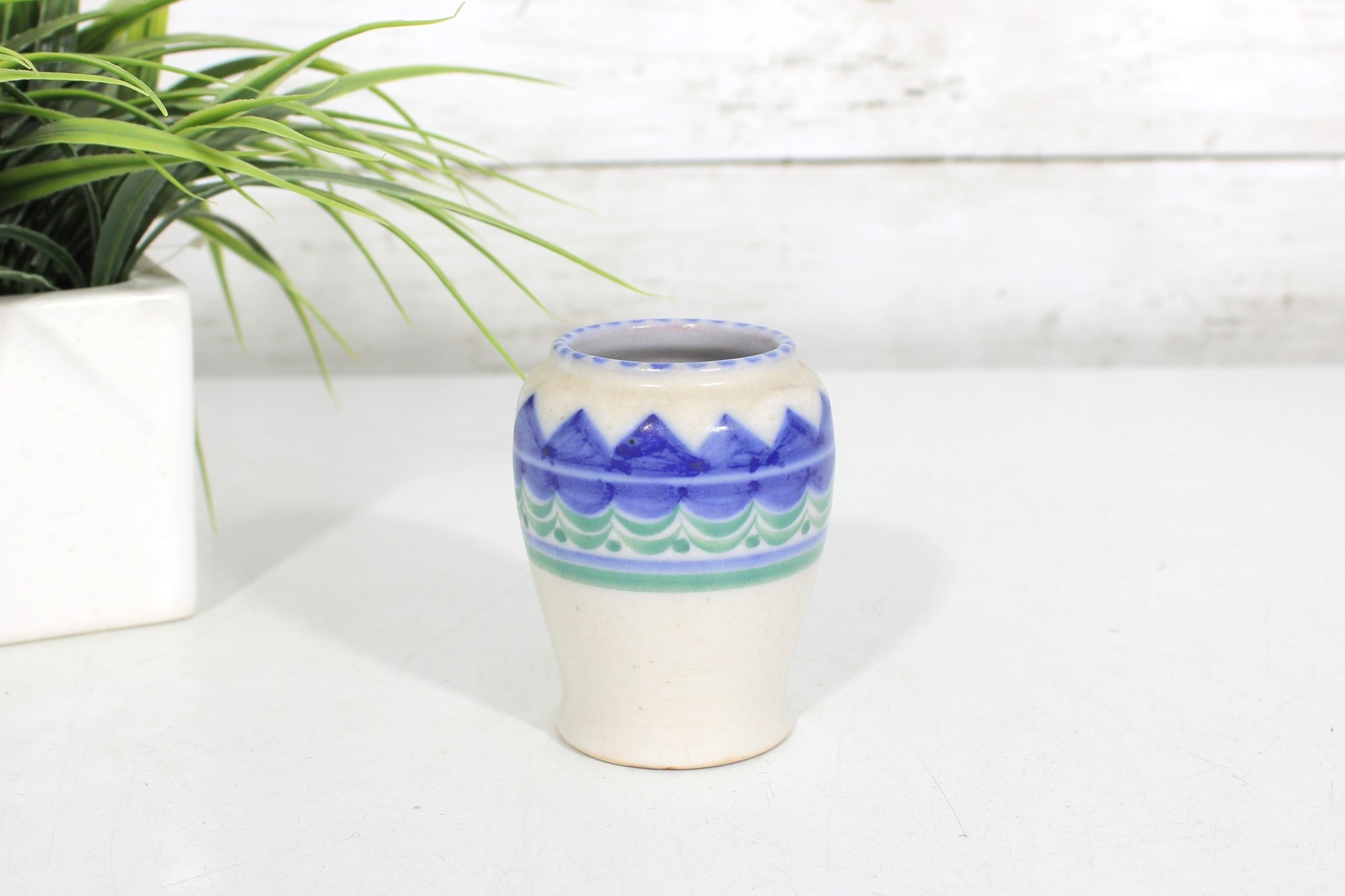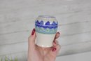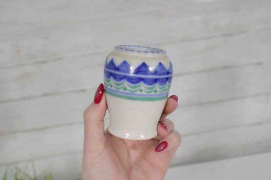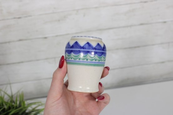 vintage Poole Pottery mini vase, standing approximately 3.5 inches tall. This piece features a classic Poole design with a clean, rounded form and a decorative band of hand-painted geometric patterns in shades of blue and green.