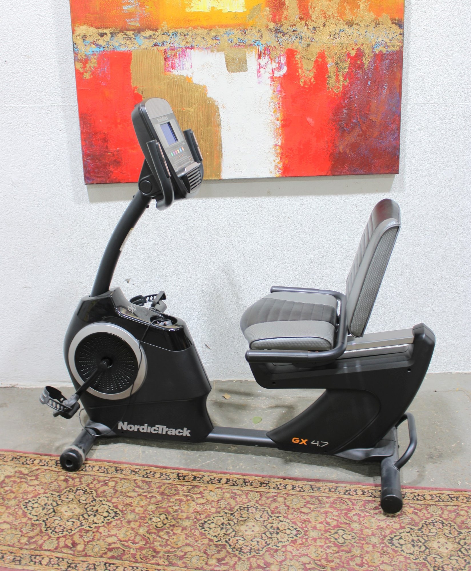 a NordicTrack GX 4.7 recumbent exercise bike, designed to provide comfortable, low-impact cardio workouts at home. The recumbent design features a supportive seat with backrest, making it ideal for longer workout sessions while reducing strain on the back and joints.
