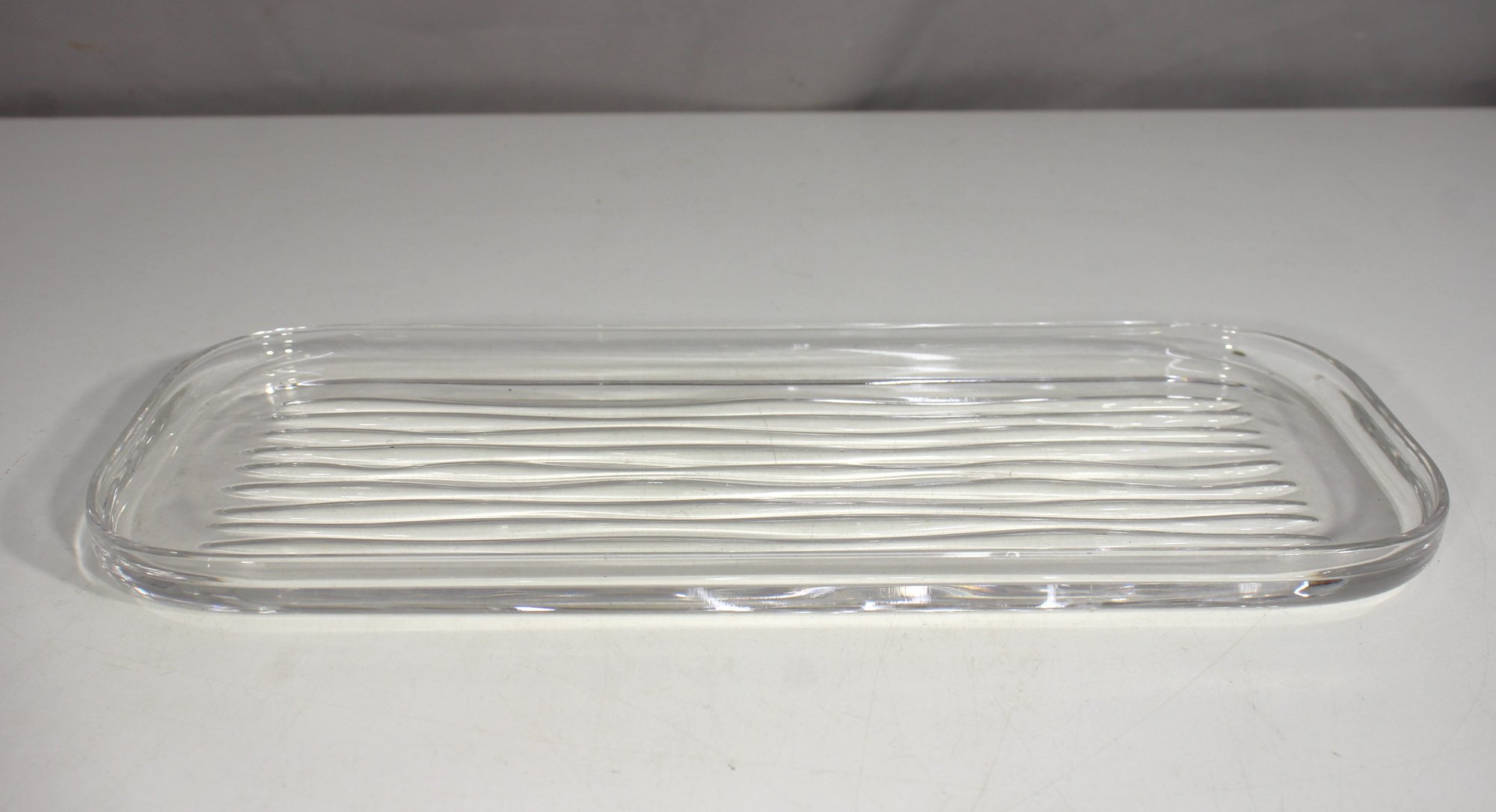 Bring minimalist sophistication to your table or display with this signed Nordmann modernist glass tray. Measuring 13 inches long by 6 inches wide, this sleek piece is crafted from thick, clear glass with an elegant ripple texture that adds dimension and catches the light beautifully.