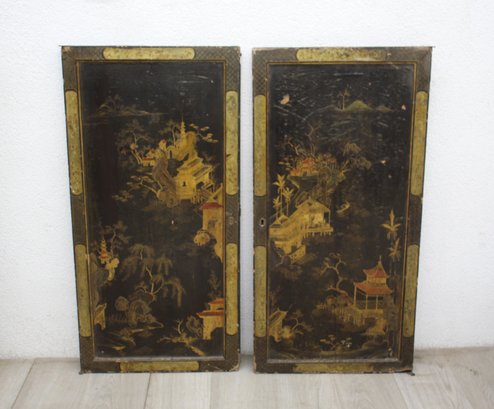 pair of antique Oriental door panels, these exquisitely hand-painted artworks capture the essence of Eastern artistry. Standing at 37.5 inches in height and 18.5 inches in width, each panel is a gateway to the past, depicting serene landscapes of architectural marvels amidst lush foliage, under the watchful gaze of starry skies.