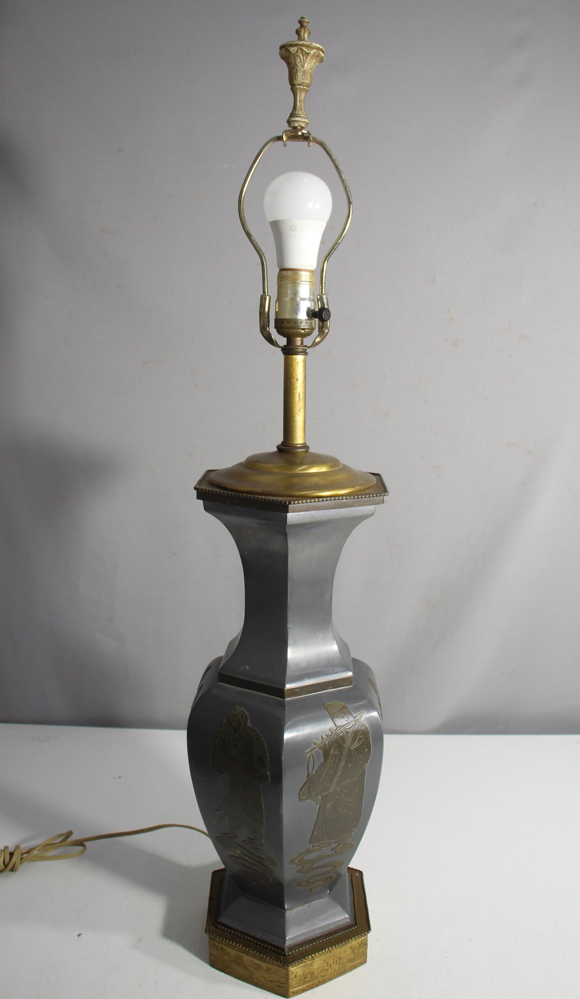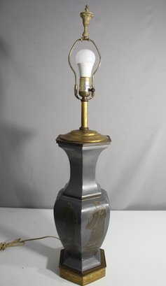 oriental-themed table lamp featuring intricate brass details on the base and sides. The lamp showcases traditional figures and symbols etched in gold tones against a sleek, metallic finish. Topped with a classic brass finial, this lamp combines artistry with functionality, bringing a touch of Eastern elegance to any room.