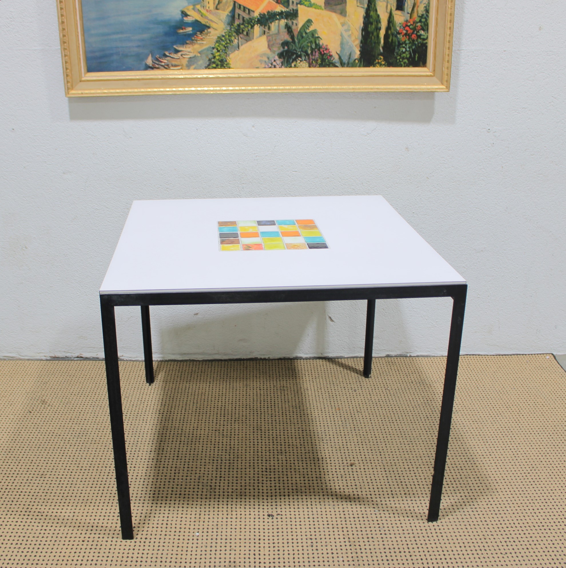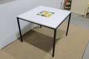 here is an original 1960s Knoll mid-century modern table, retaining its original Knoll label. This clean-lined modernist piece features a white laminate top with a colorful inset tile mosaic at the center, supported by sleek black metal legs.