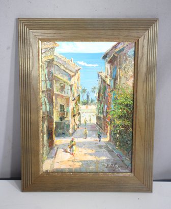 Beautiful original oil painting on canvas by E. Alguacil, depicting a charming sunlit street in Villajoyosa, Spain, painted in 1999. This piece captures a vibrant European village scene with bold brushstrokes, rich texture, and a warm Mediterranean atmosphere.