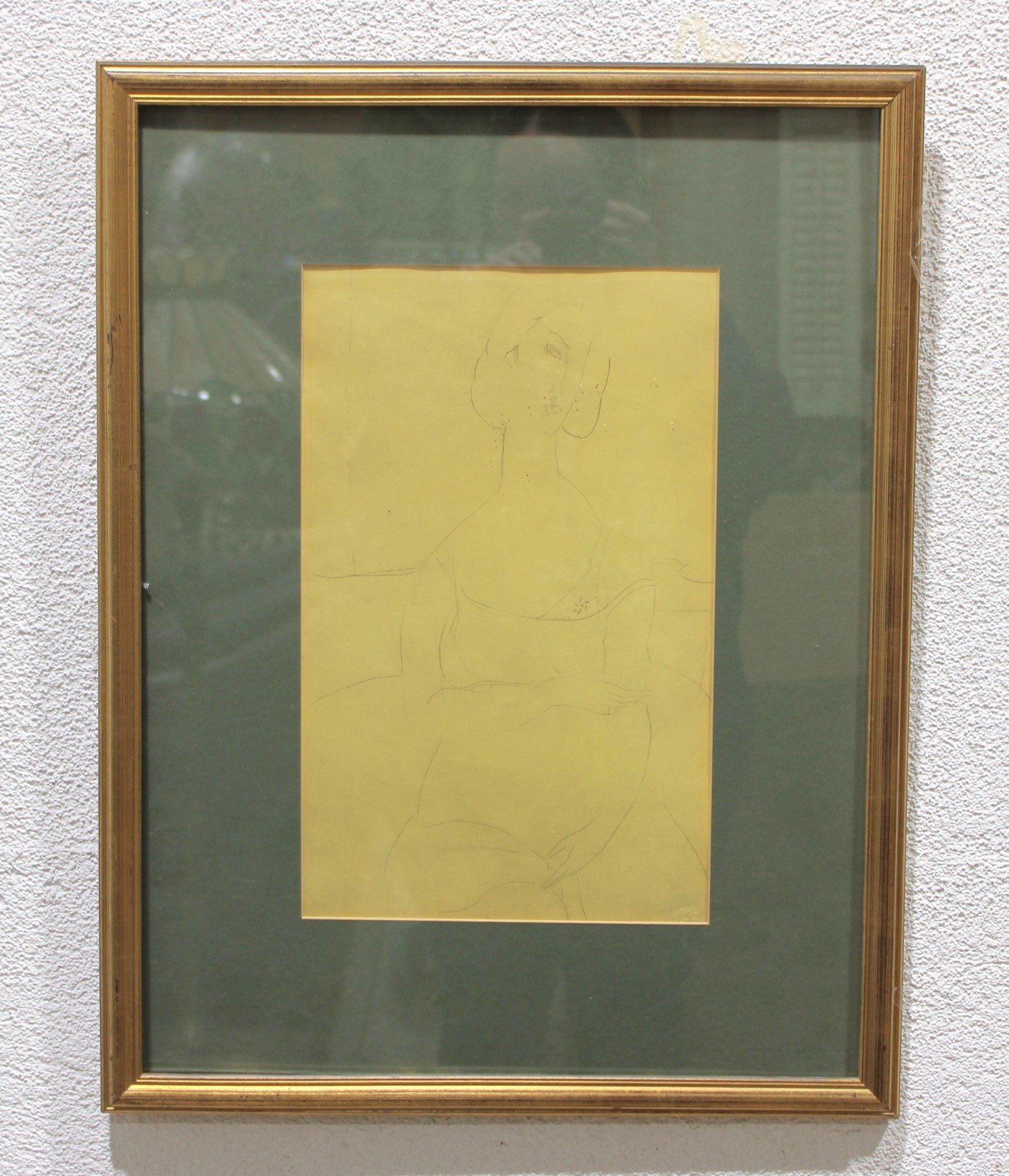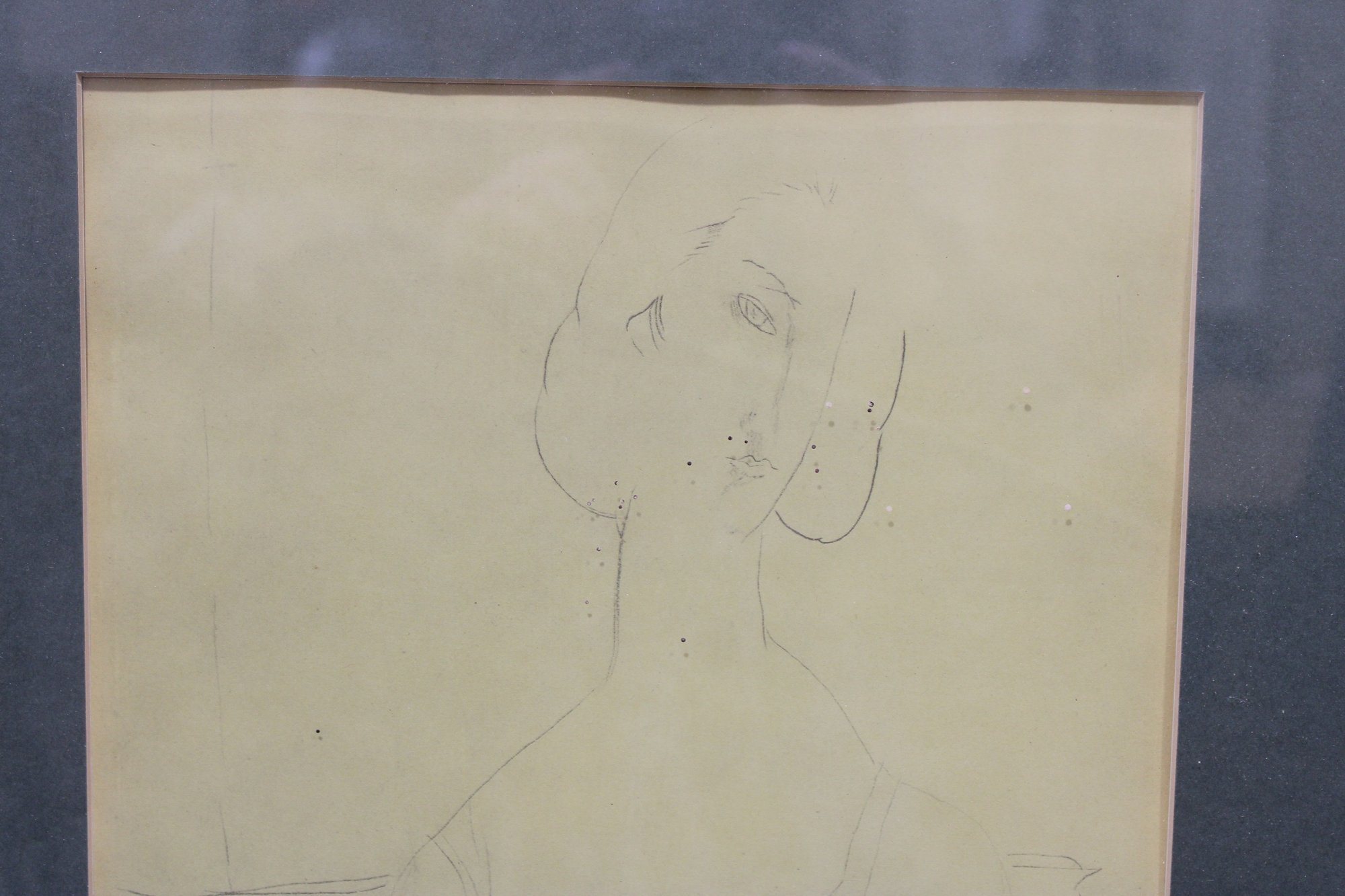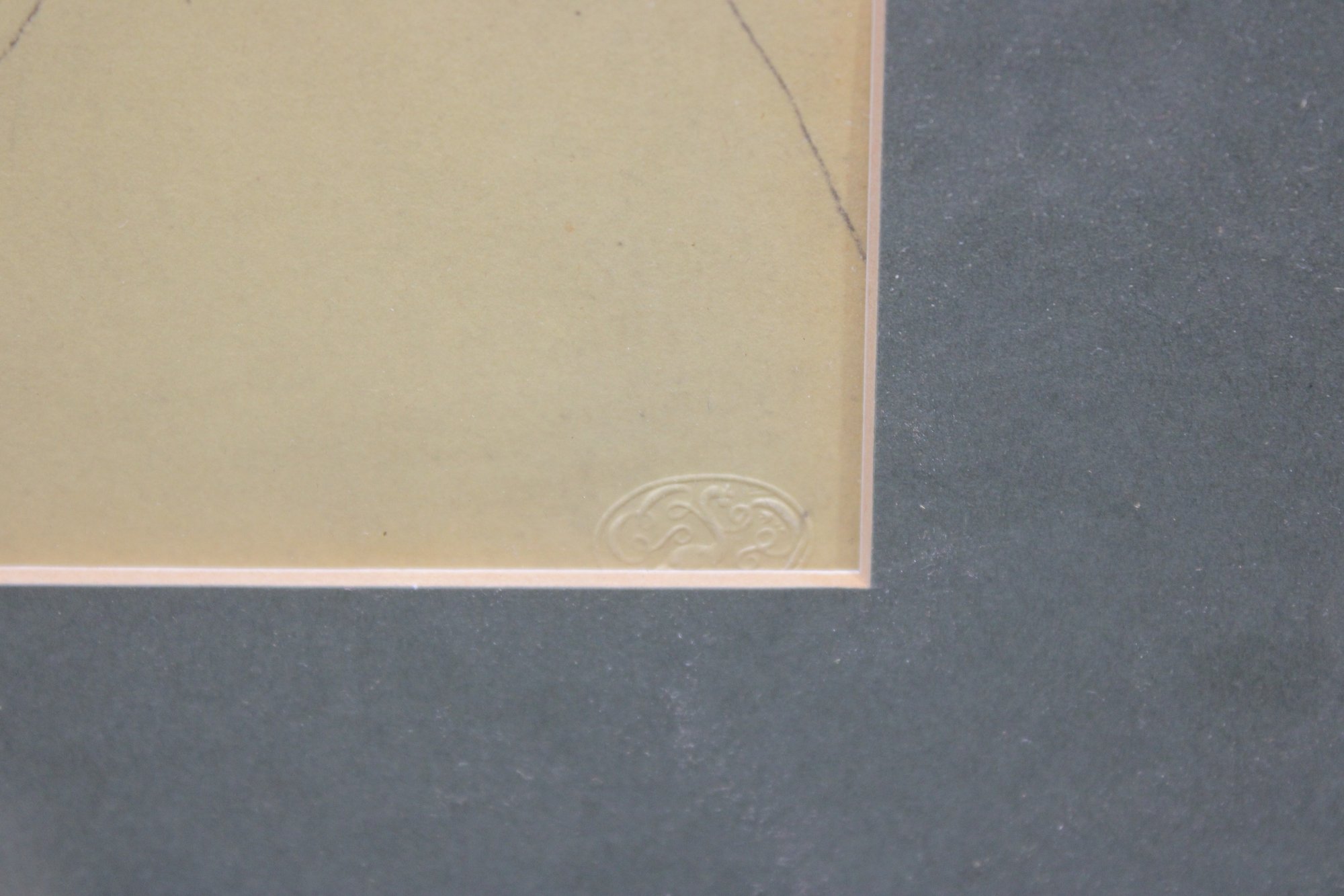 The drawing appears to bear a small artist’s mark or stamp in the lower corner (unidentified) and is presented under glass in a simple gilt frame with contrasting matting. The understated presentation allows the drawing itself to remain the focal point.