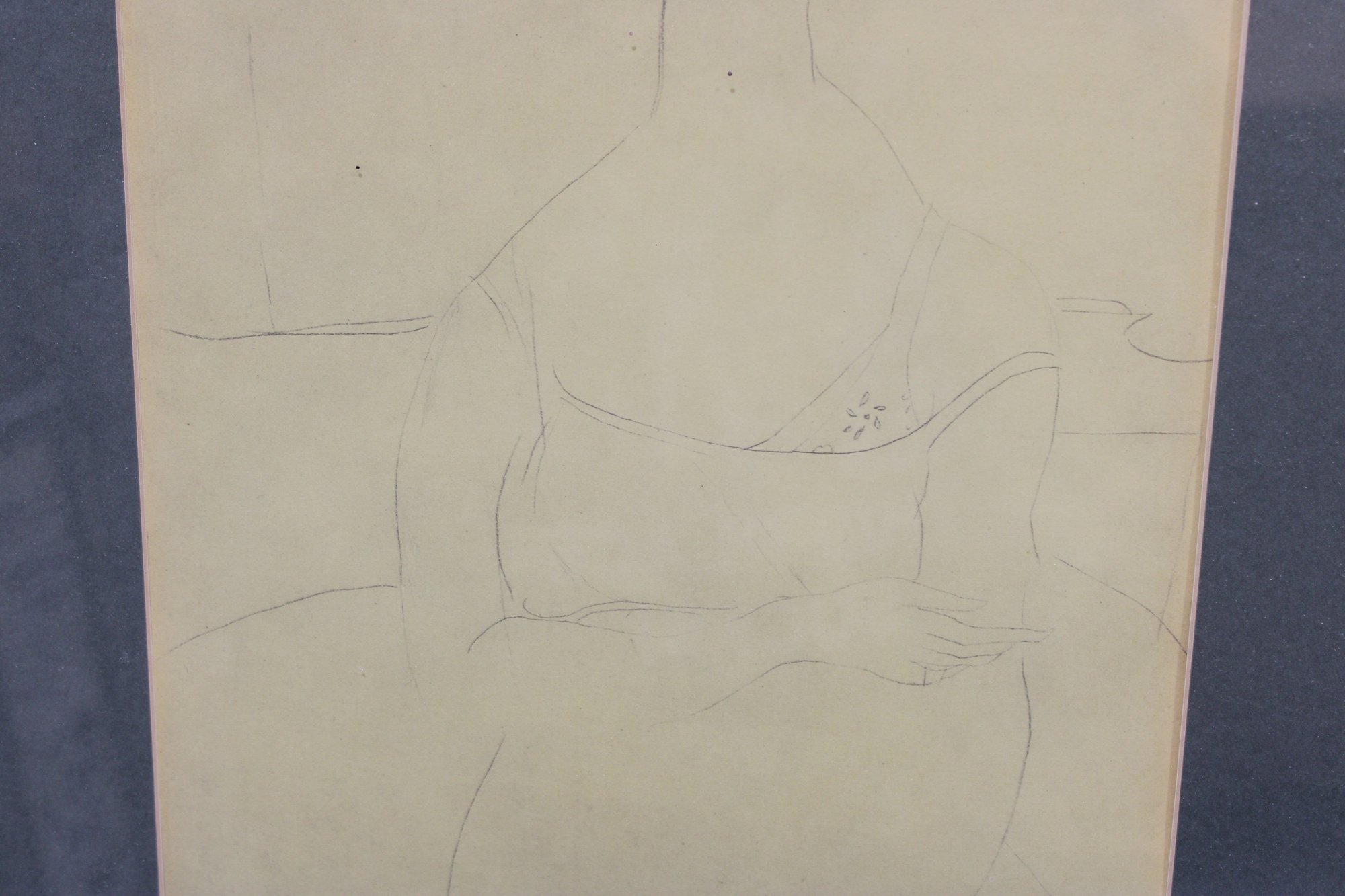 an original figurative pencil drawing depicting a seated female figure, rendered with light, confident linework and a minimalist approach. The composition focuses on form and posture rather than detail, giving the drawing a quiet, modern sensibility often associated with mid-20th-century figure studies.
