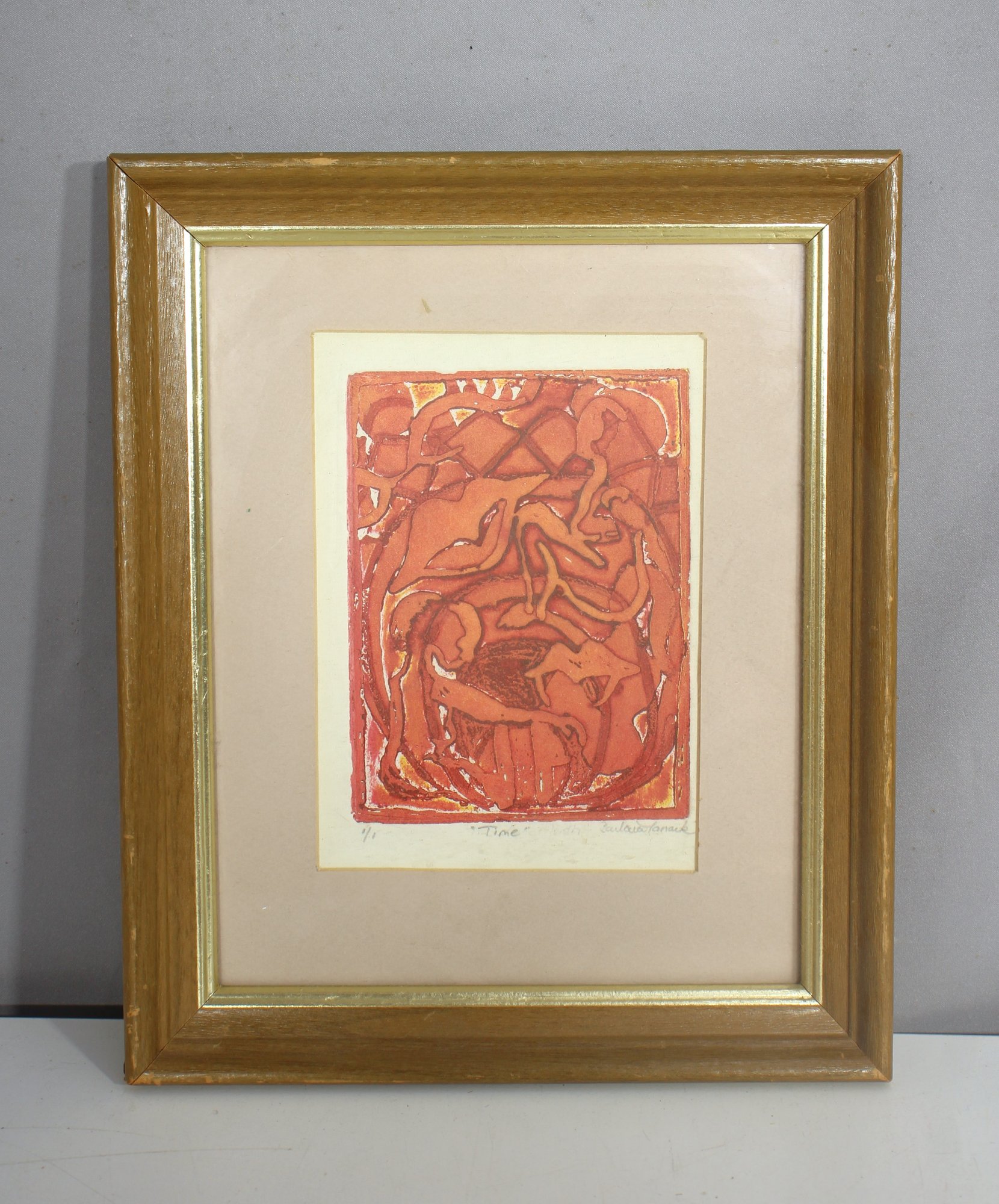 This original signed print titled “Time” is a stunning example of abstract expressionist art. Created using vivid red and orange hues, the piece depicts a dynamic, surreal composition of intertwined human figures, evoking themes of movement, transformation, and emotion.