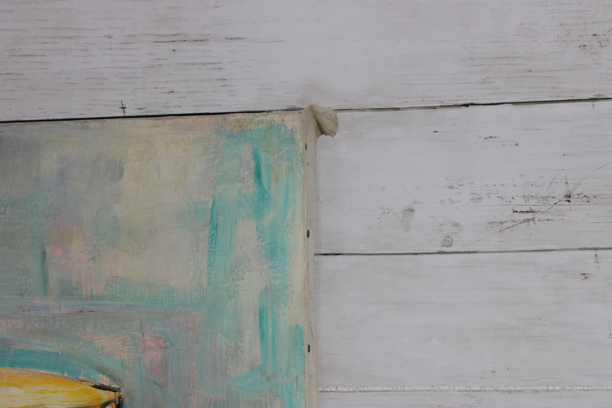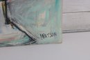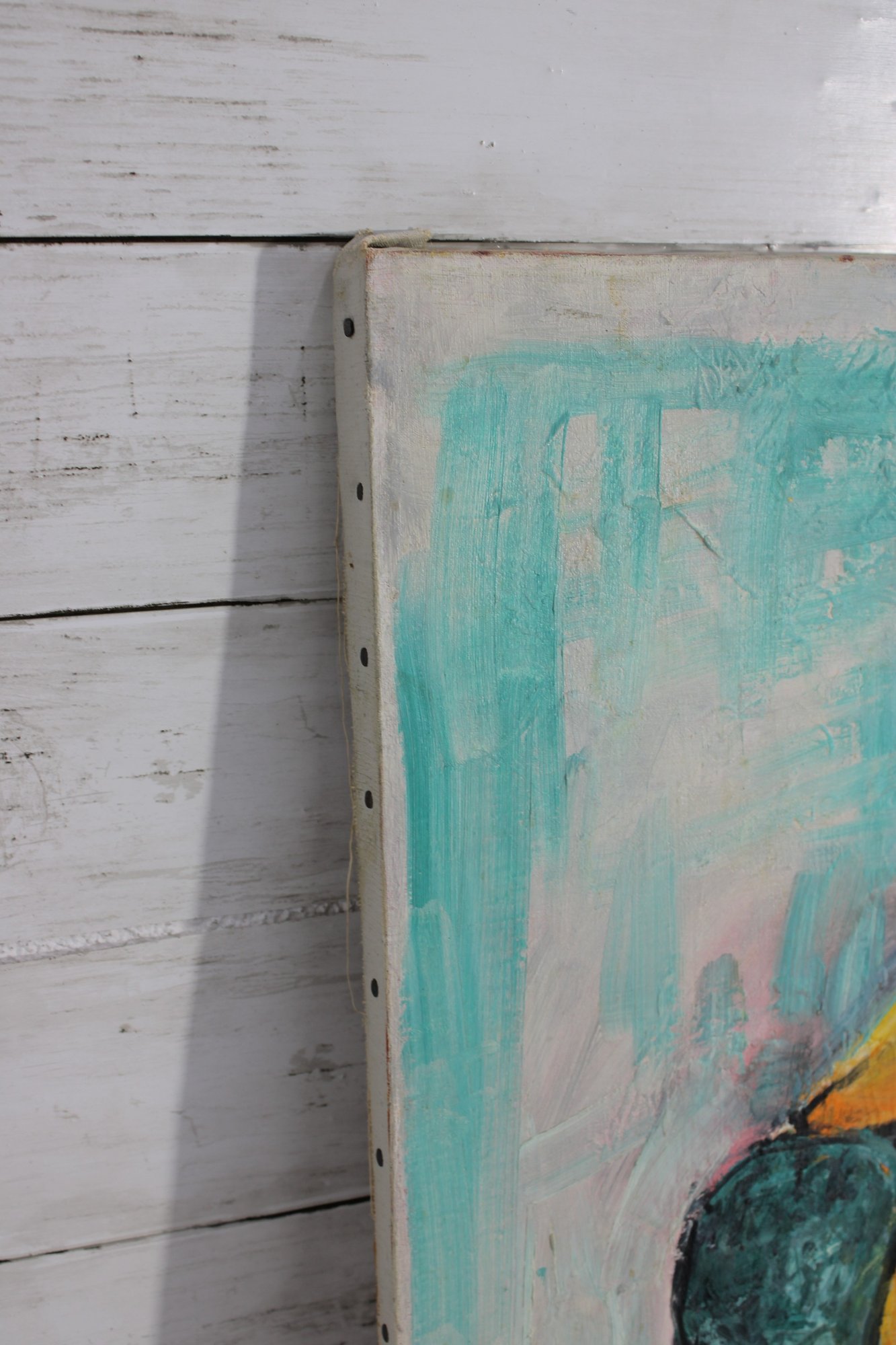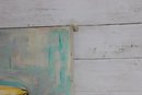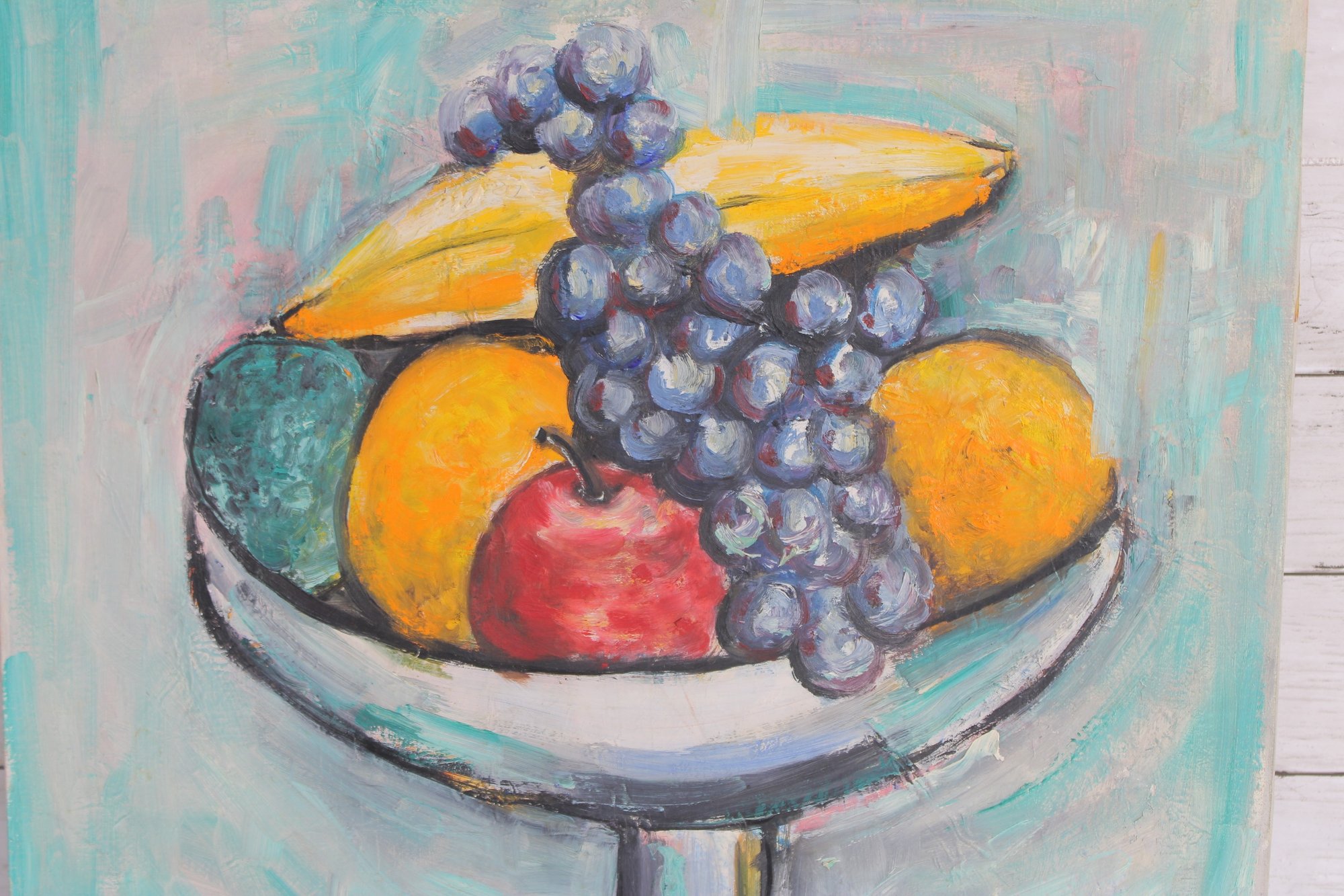 The painting is executed in expressive brushstrokes with a soft, modern color palette of aqua, teal, and pastel tones. The textured background contrasts beautifully with the rich purples and warm yellows of the fruit, giving the piece a fresh yet timeless feel.