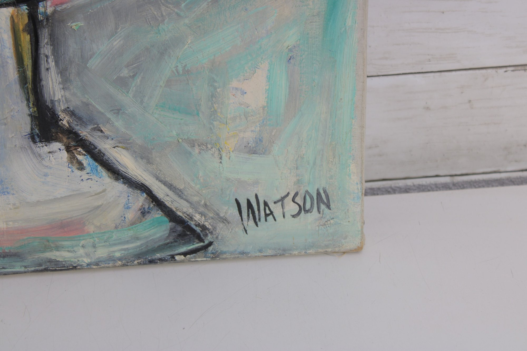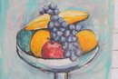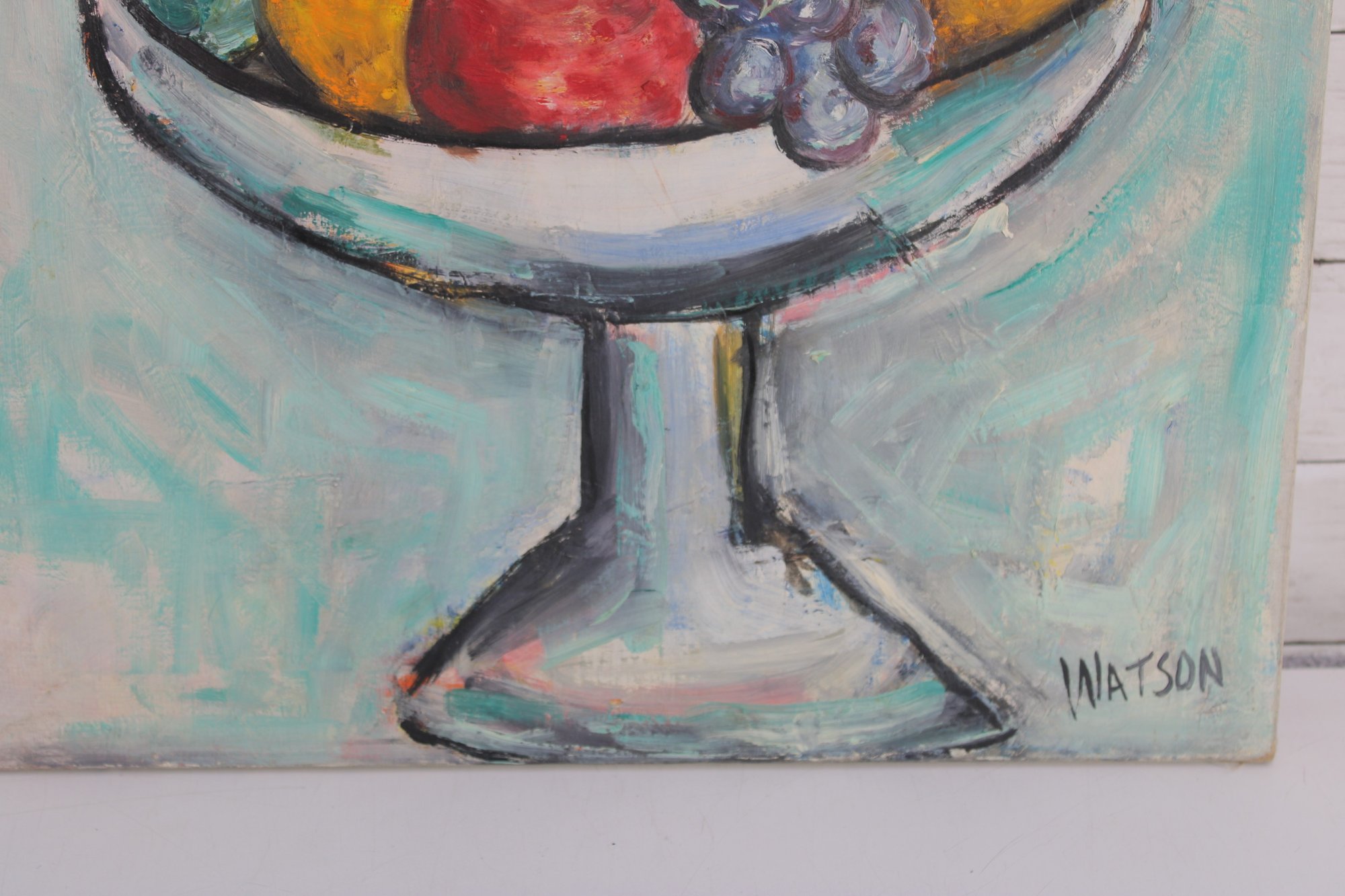 an original still life oil painting on canvas, signed WATSON in the lower right corner. This vibrant composition features a classic fruit arrangement displayed in a pedestal compote bowl, including grapes, bananas, oranges, and a red apple.