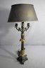 This auction features an exquisitely designed candelabra lamp, a fine example of antique-style craftsmanship. The lamp stands tall and distinguished, showcasing a central column adorned with classical motifs, flanked by graceful curved arms that culminate in candle-like fixtures. The blend of dark and gold tones on the metalwork adds depth and contrast, highlighting intricate details such as acanthus leaves and floral accents.