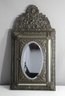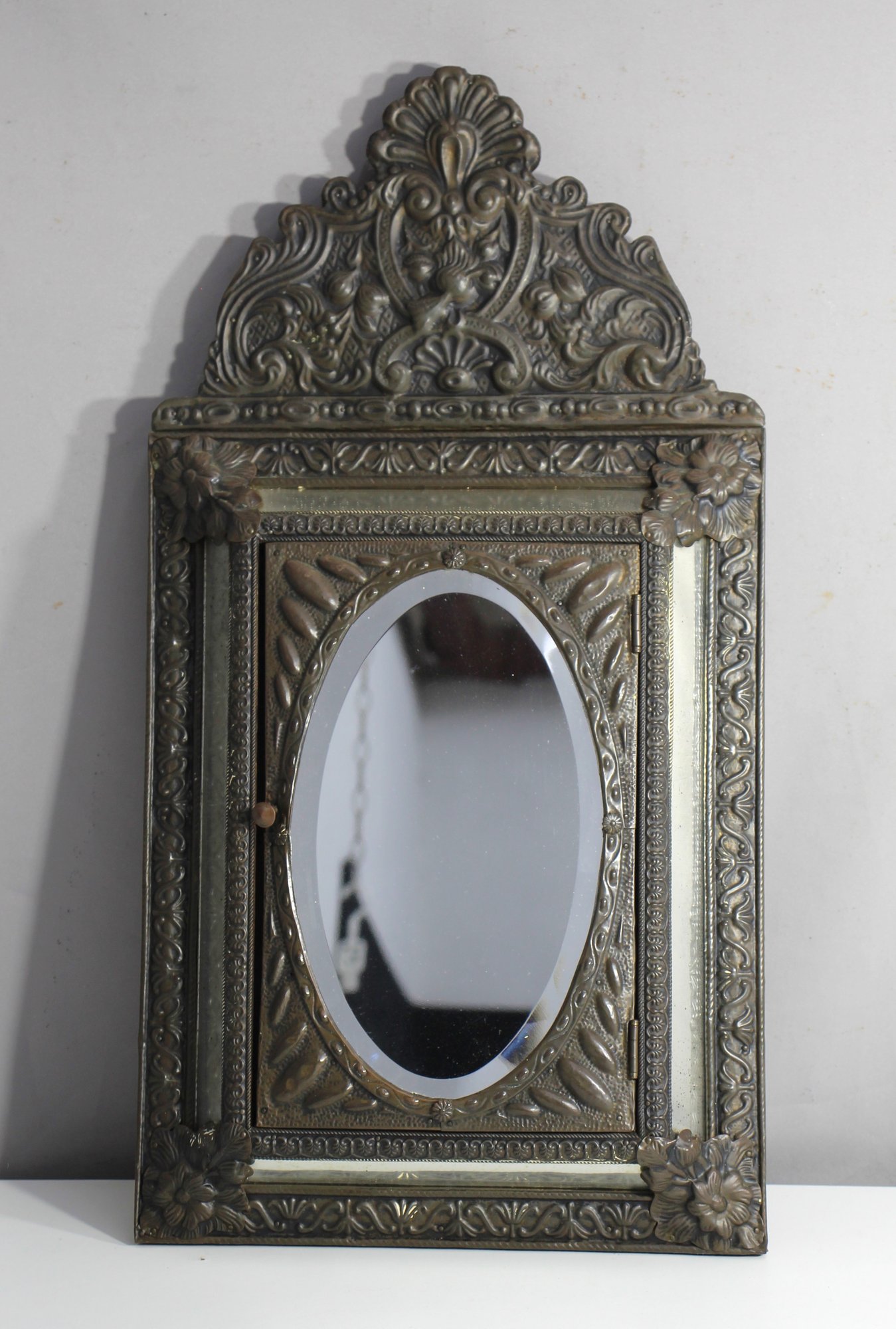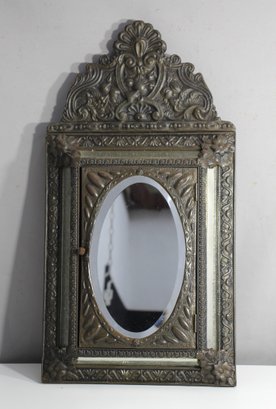 This beautifully crafted antique wall-mounted brush holder features a richly detailed, decorative metal frame with an arched top and intricate floral and scroll motifs. The central oval mirror is encased in a textured metal frame and opens to reveal a compartment lined with a golden finish, holding two vintage brushes with original bristles. A stunning piece that adds charm and historical character, perfect for vintage decor enthusiasts or collectors.