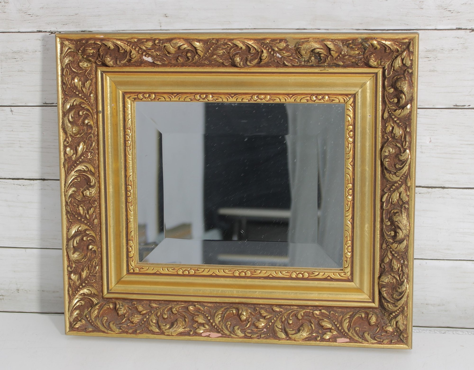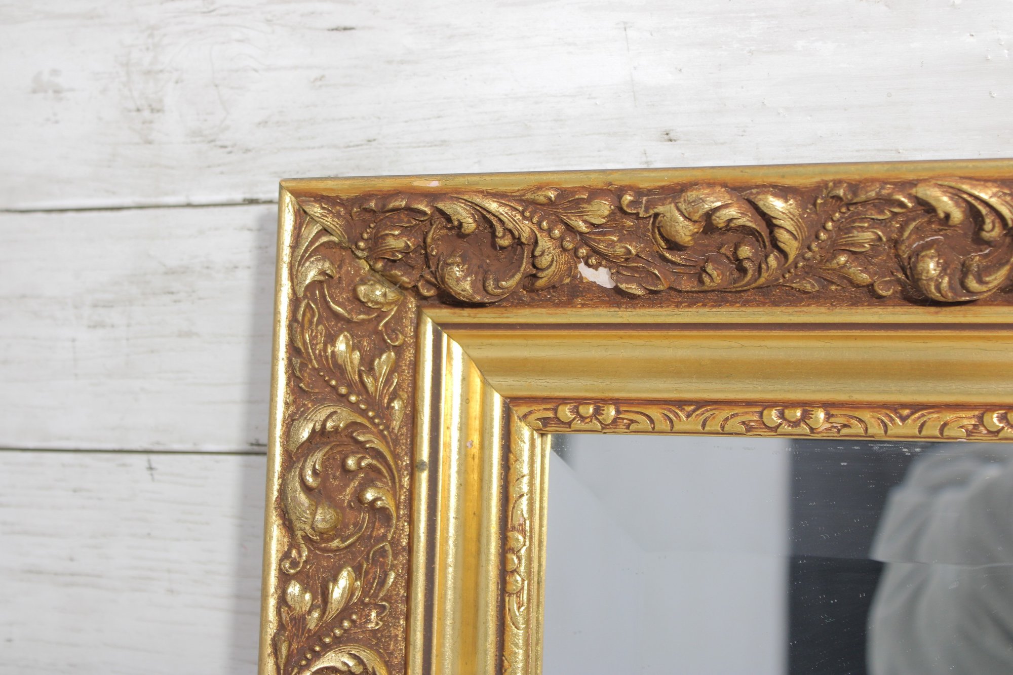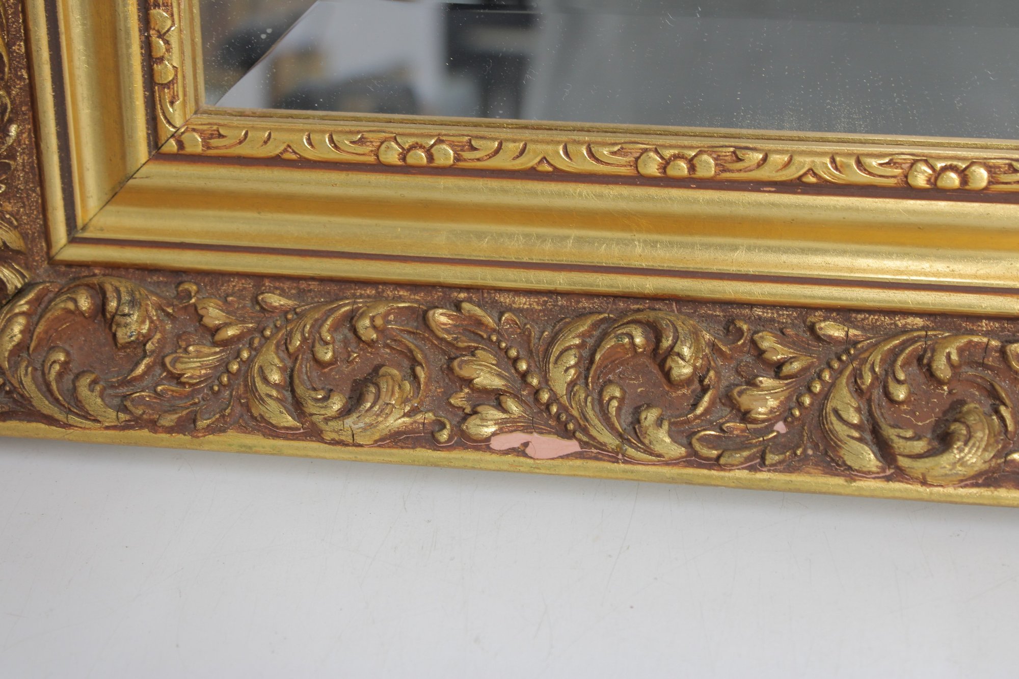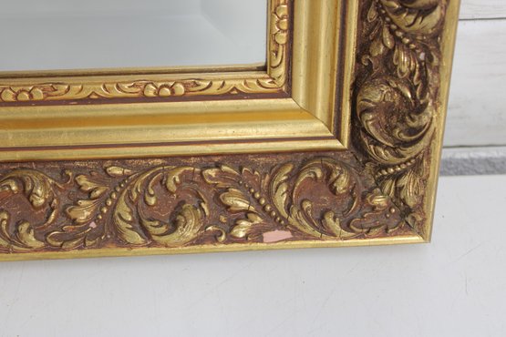 a beautiful ornate framed wall mirror, featuring a richly detailed gold-tone frame with raised scroll and floral motifs. The layered frame design gives it a classic Baroque or Rococo-inspired look, making it an eye-catching decorative piece.