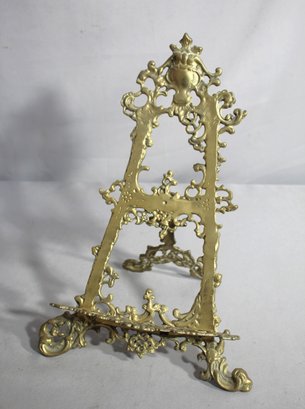 This decorative piece is artfully adorned with elaborate scrollwork, acanthus leaves, and a classical floral finial, all executed with the precision and flair characteristic of Victorian design. The lustrous golden brass has aged gracefully, offering a warm, antique patina that enhances its intricate details. This stand is not only a stunning decorative item but also a functional piece, ideal for displaying cherished paintings, framed photographs, or mirrors.