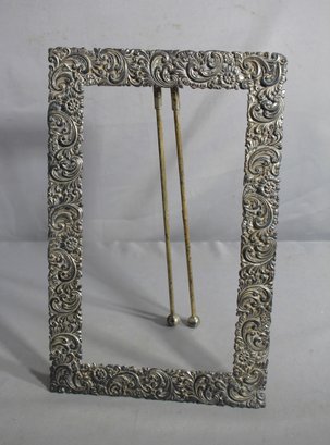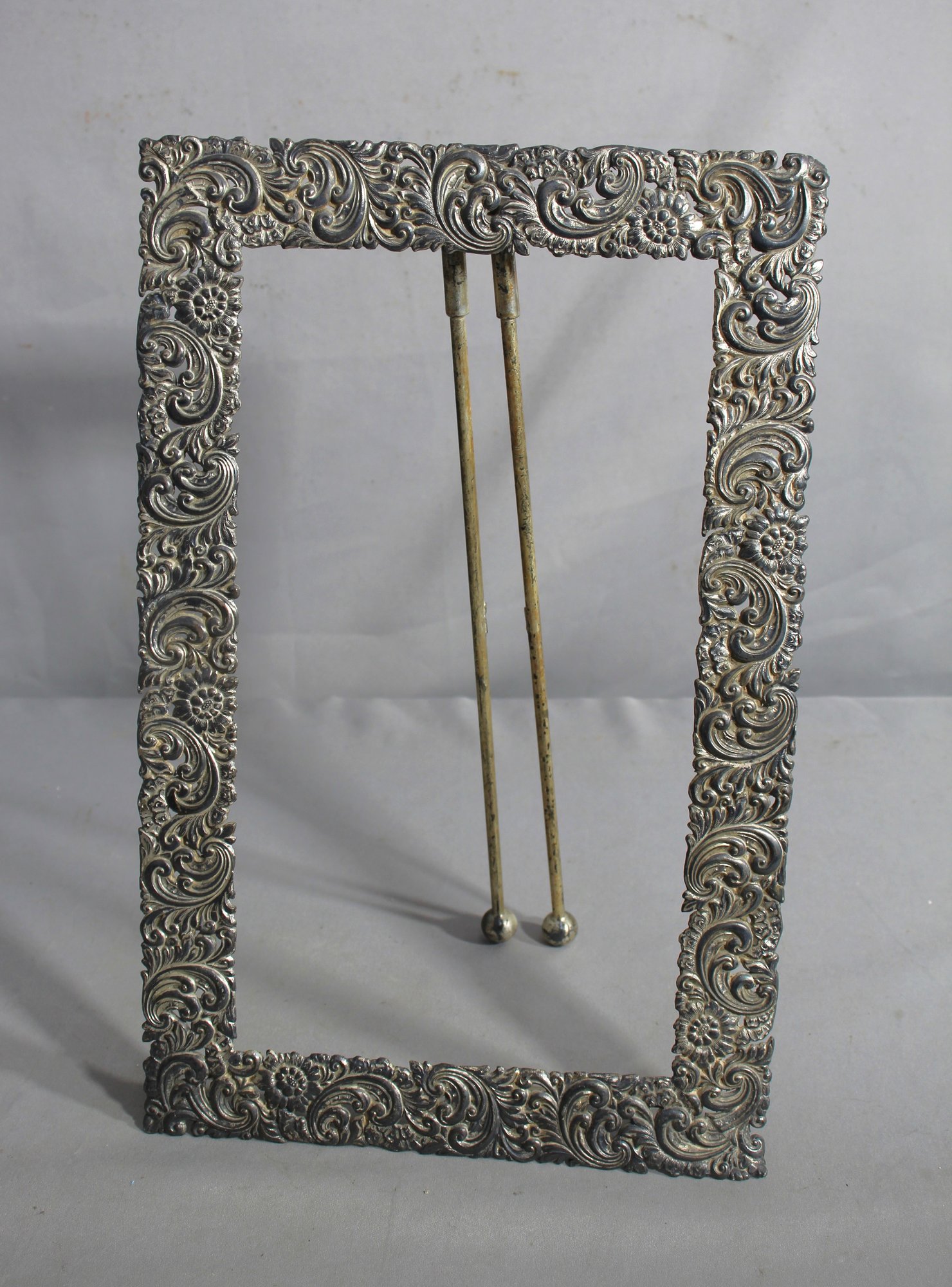 vintage metal easel picture frame that exudes Victorian charm and elegance. The silver-tone metal is intricately crafted with swirling patterns and floral motifs, creating a luxurious border that is both captivating and sophisticated.