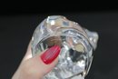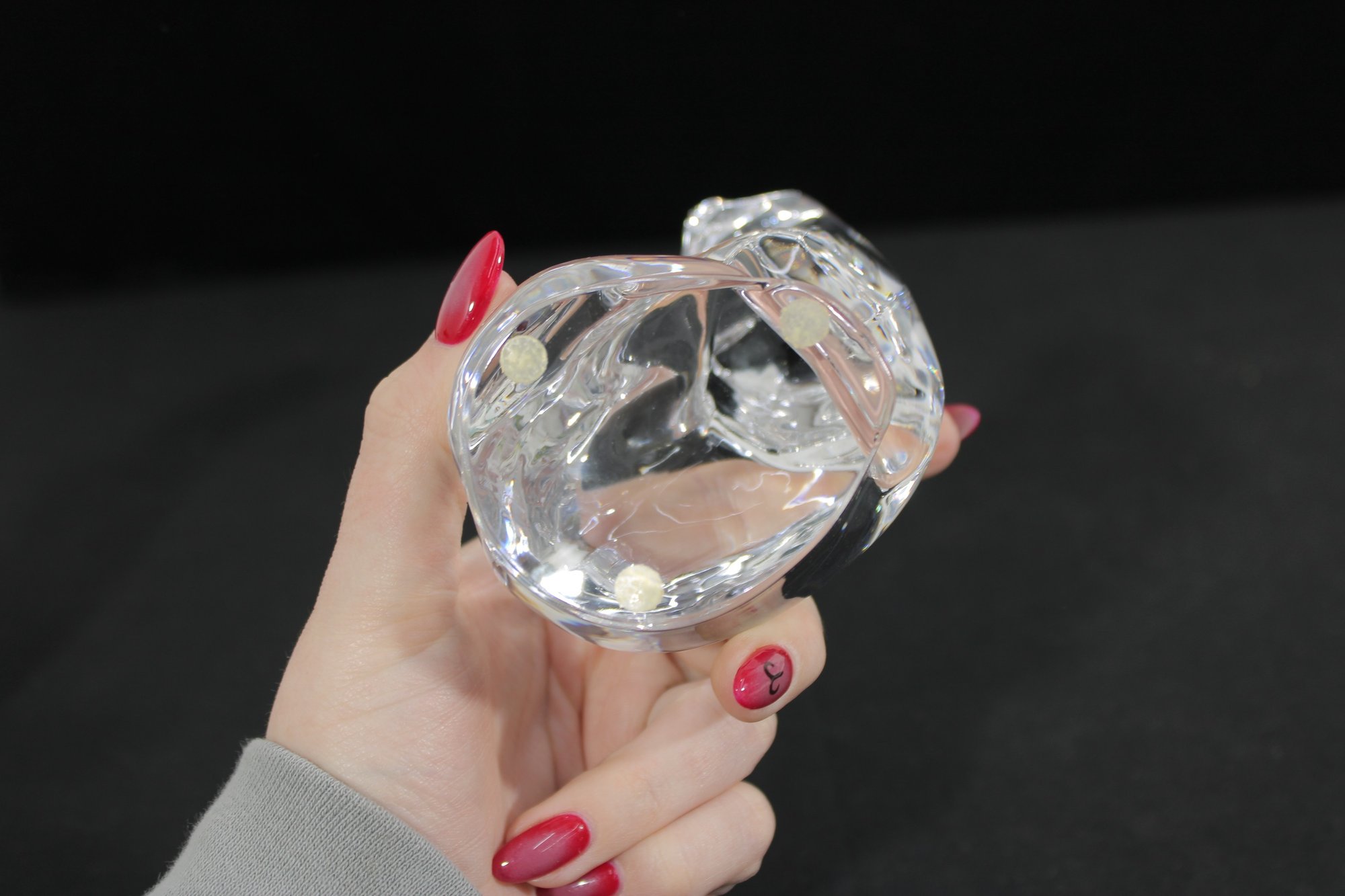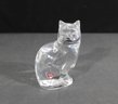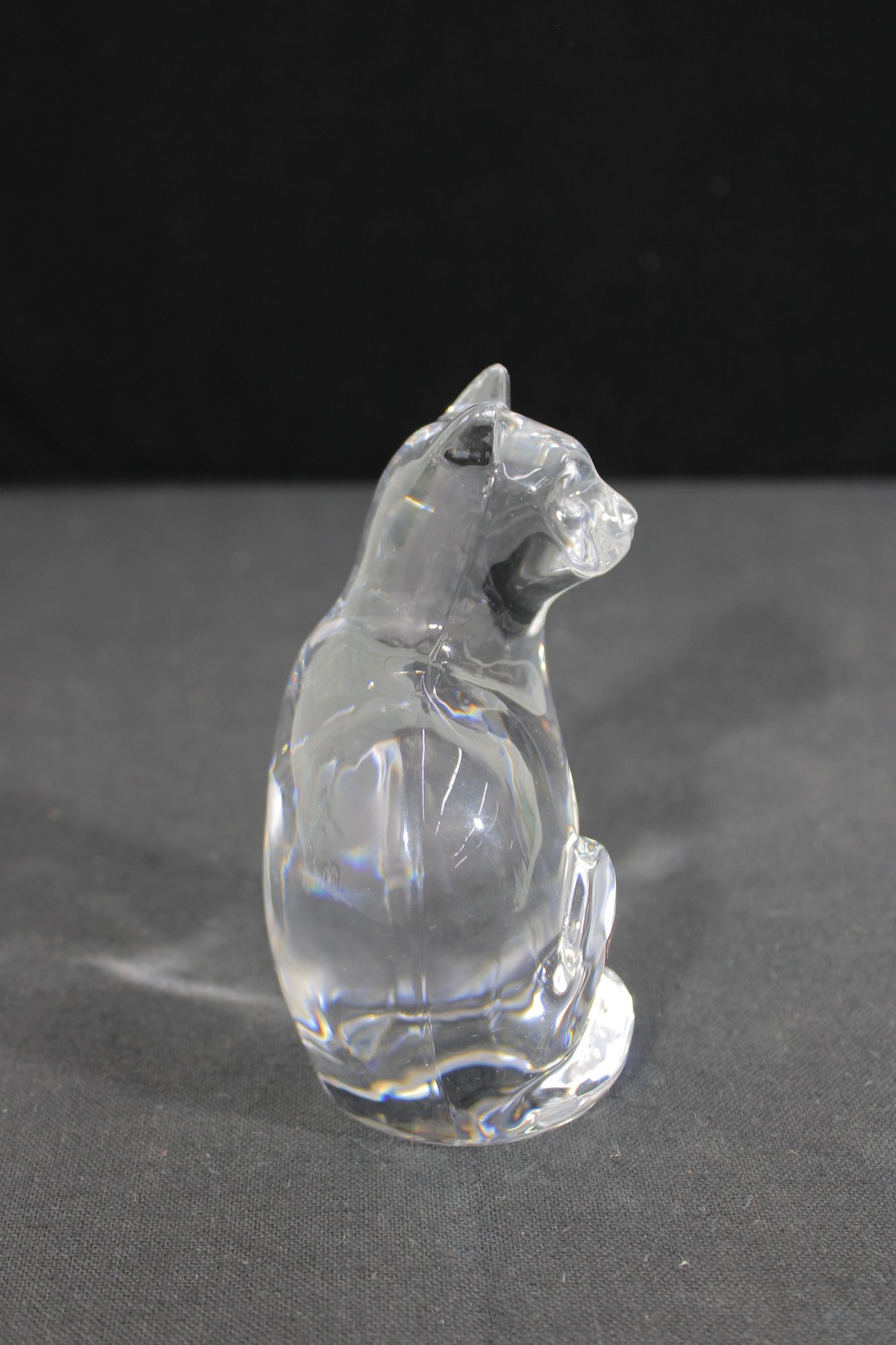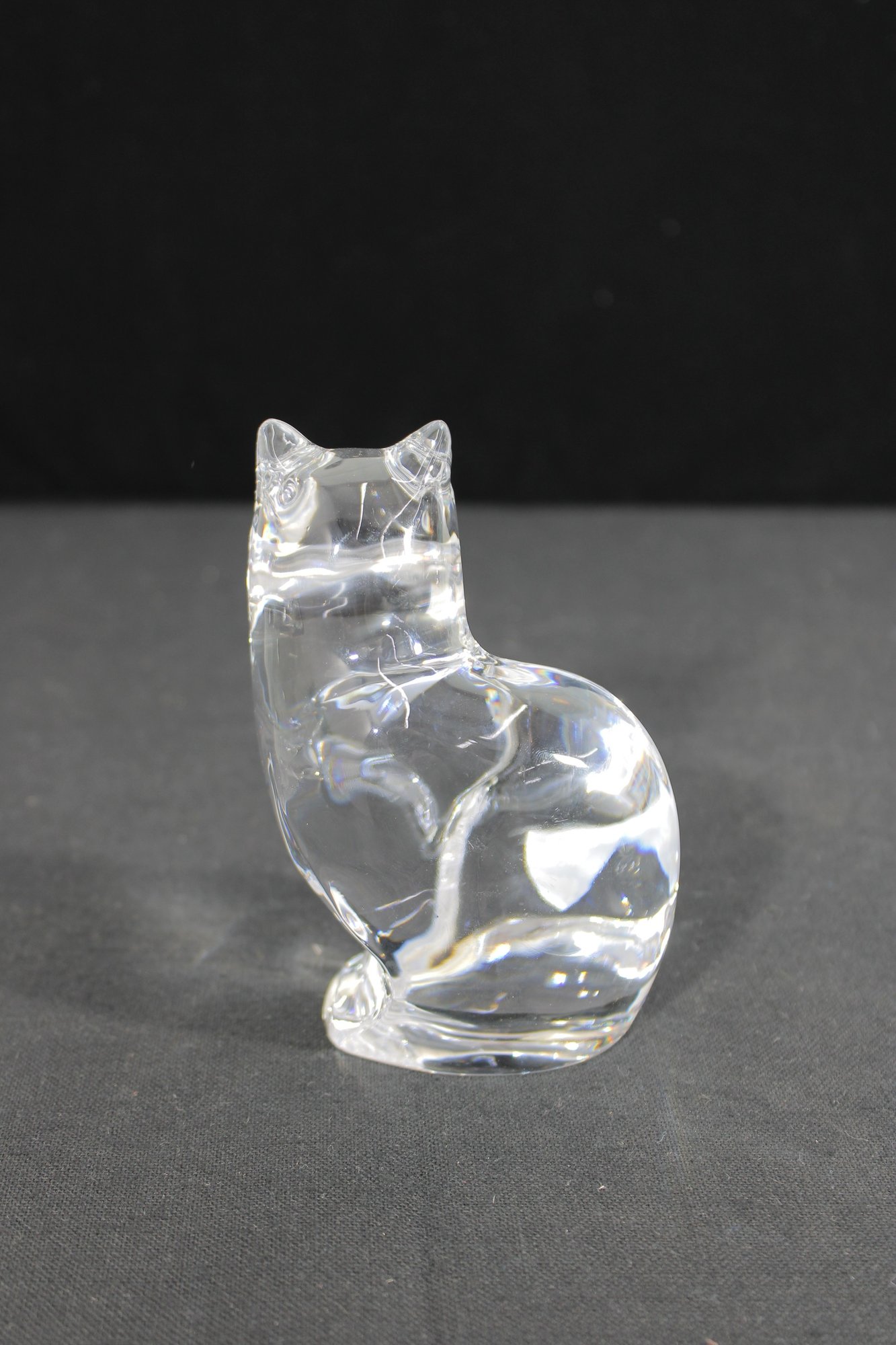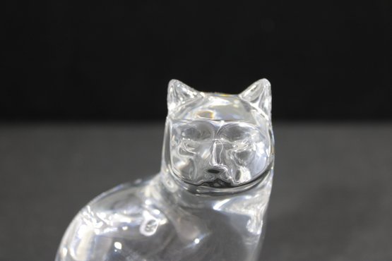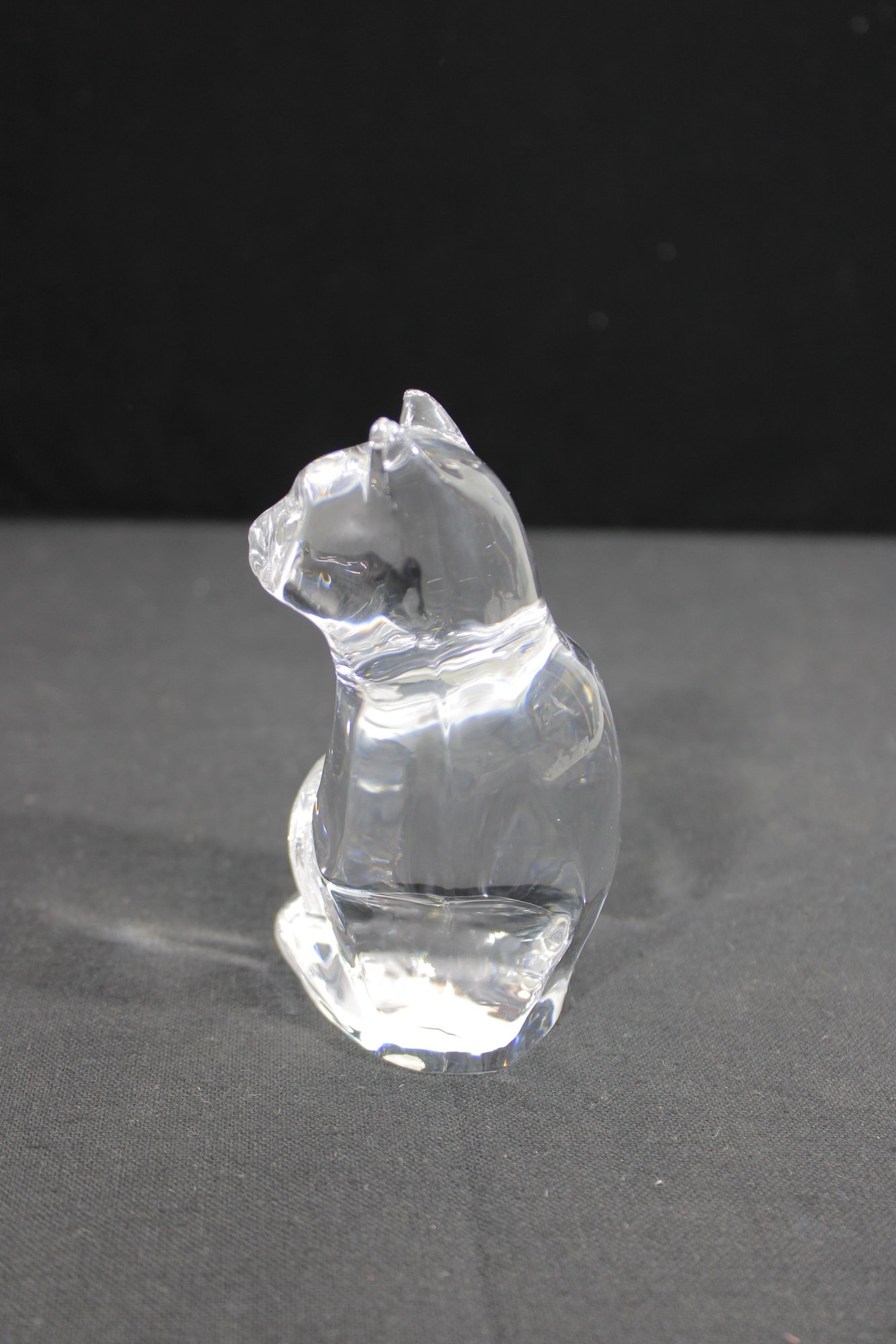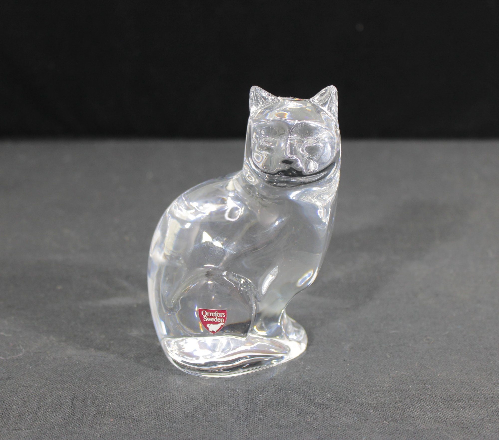 Orrefors crystal cat figurine, beautifully crafted in clear art glass with smooth, flowing lines and a minimalist Scandinavian design. This charming piece captures the graceful posture of a seated cat, with subtle facial detailing and a polished, luminous finish.