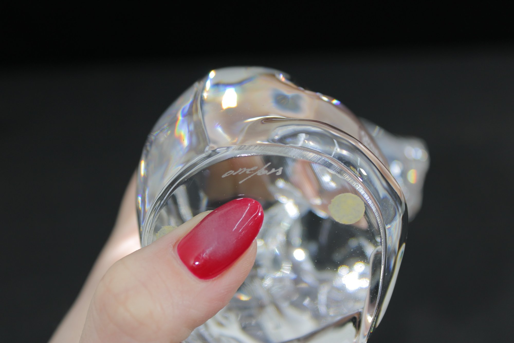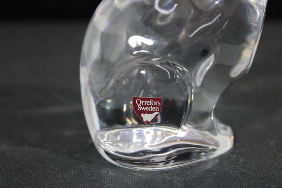 The figurine retains its original Orrefors Sweden label and is signed on the base, confirming authenticity.