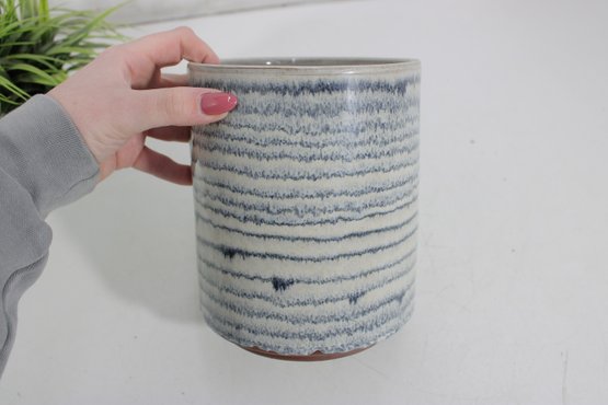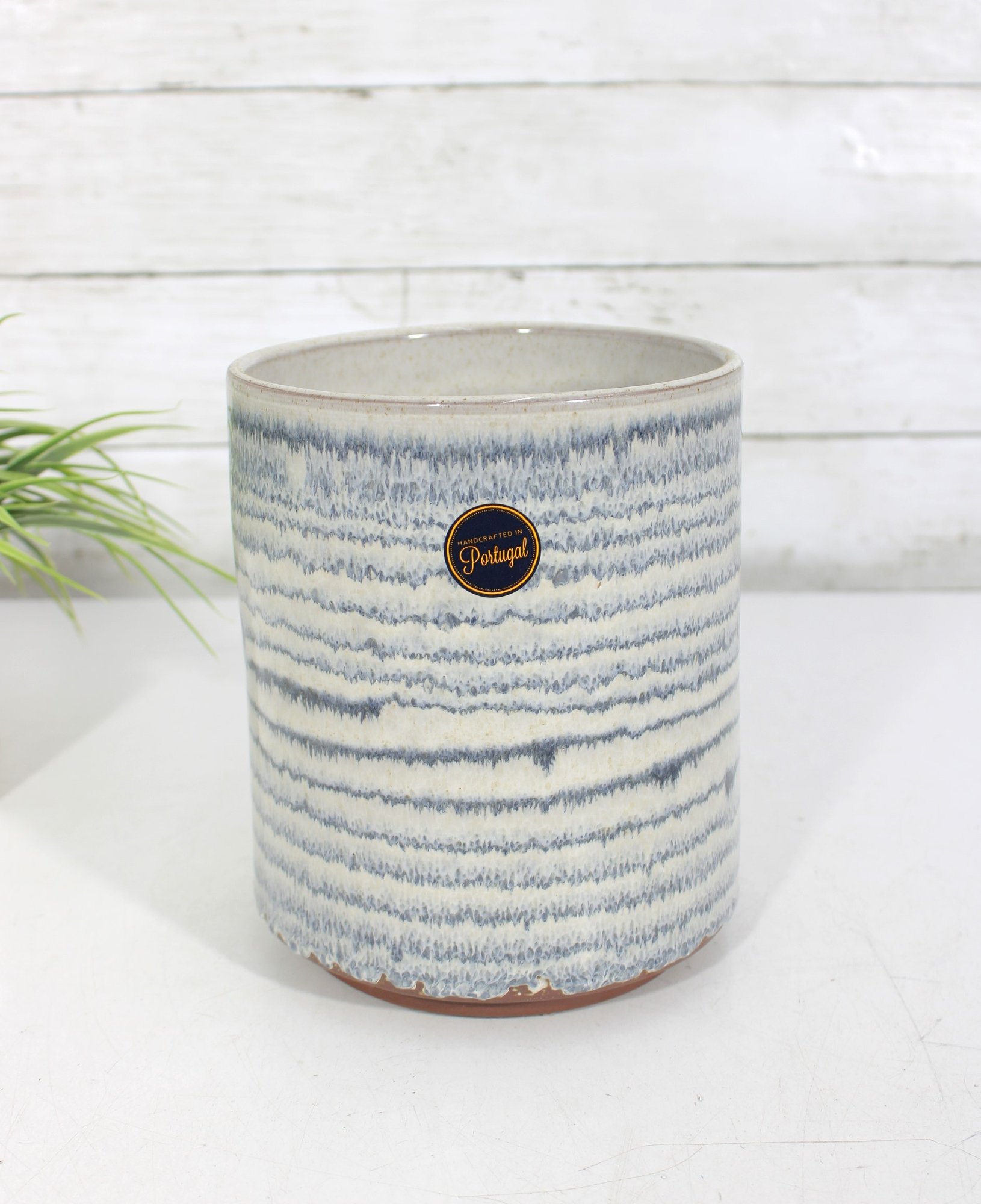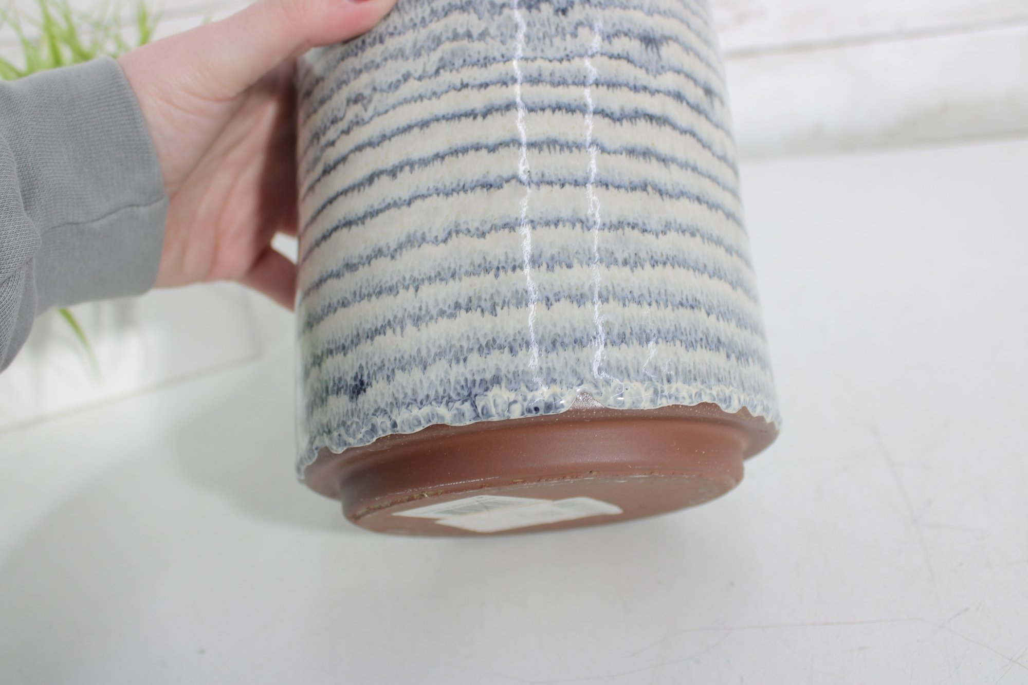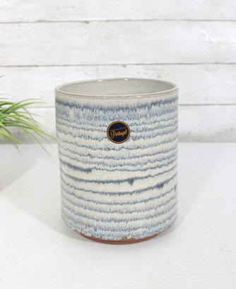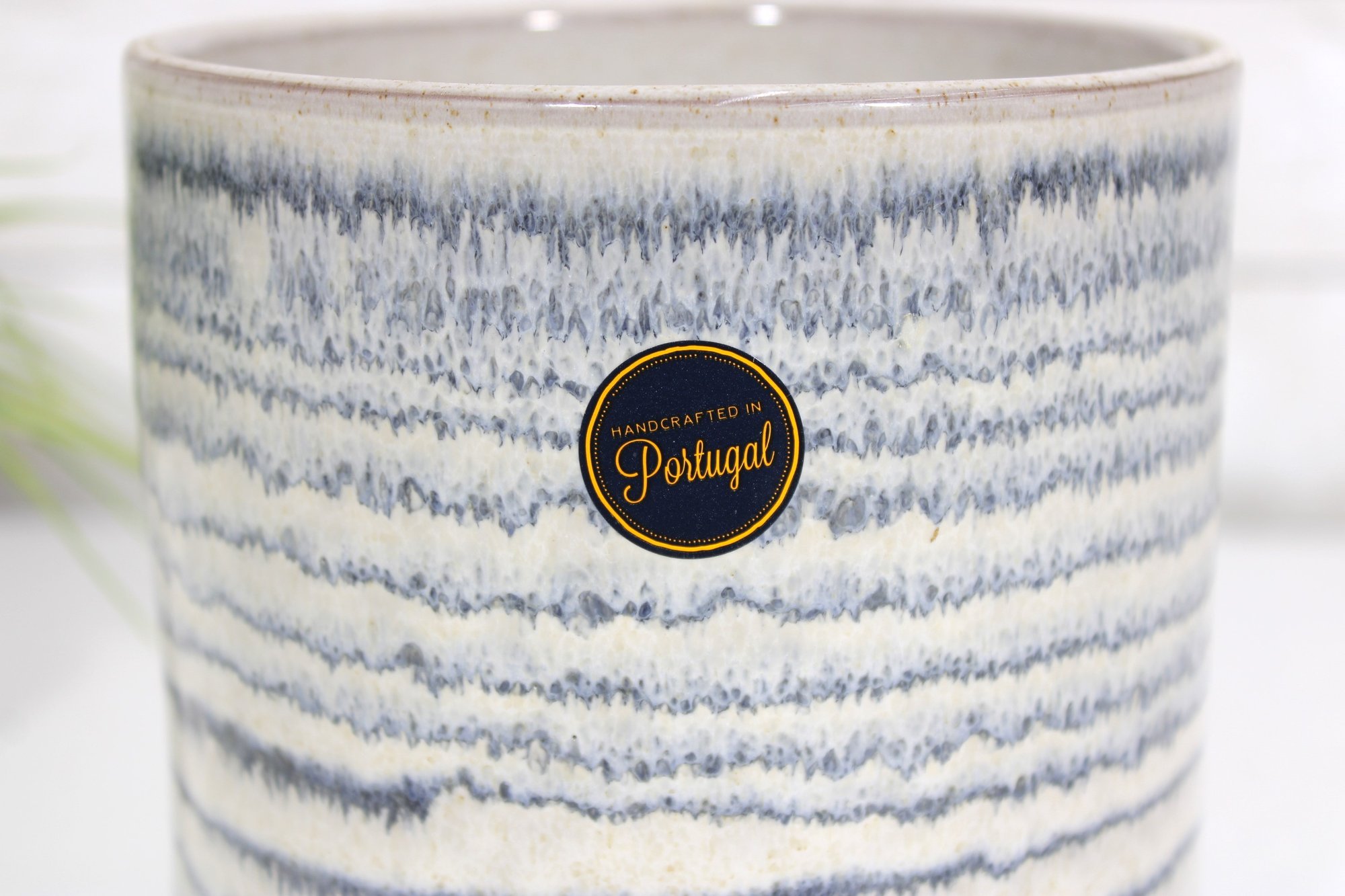 Attractive stoneware planter featuring a blue and white striped pattern with a textured, hand-crafted look. Made in Portugal for HomeGoods, this piece has a modern coastal feel with subtle variations in the glaze that add depth and character.