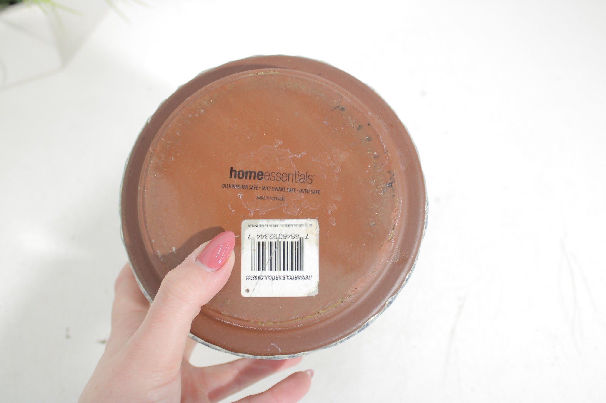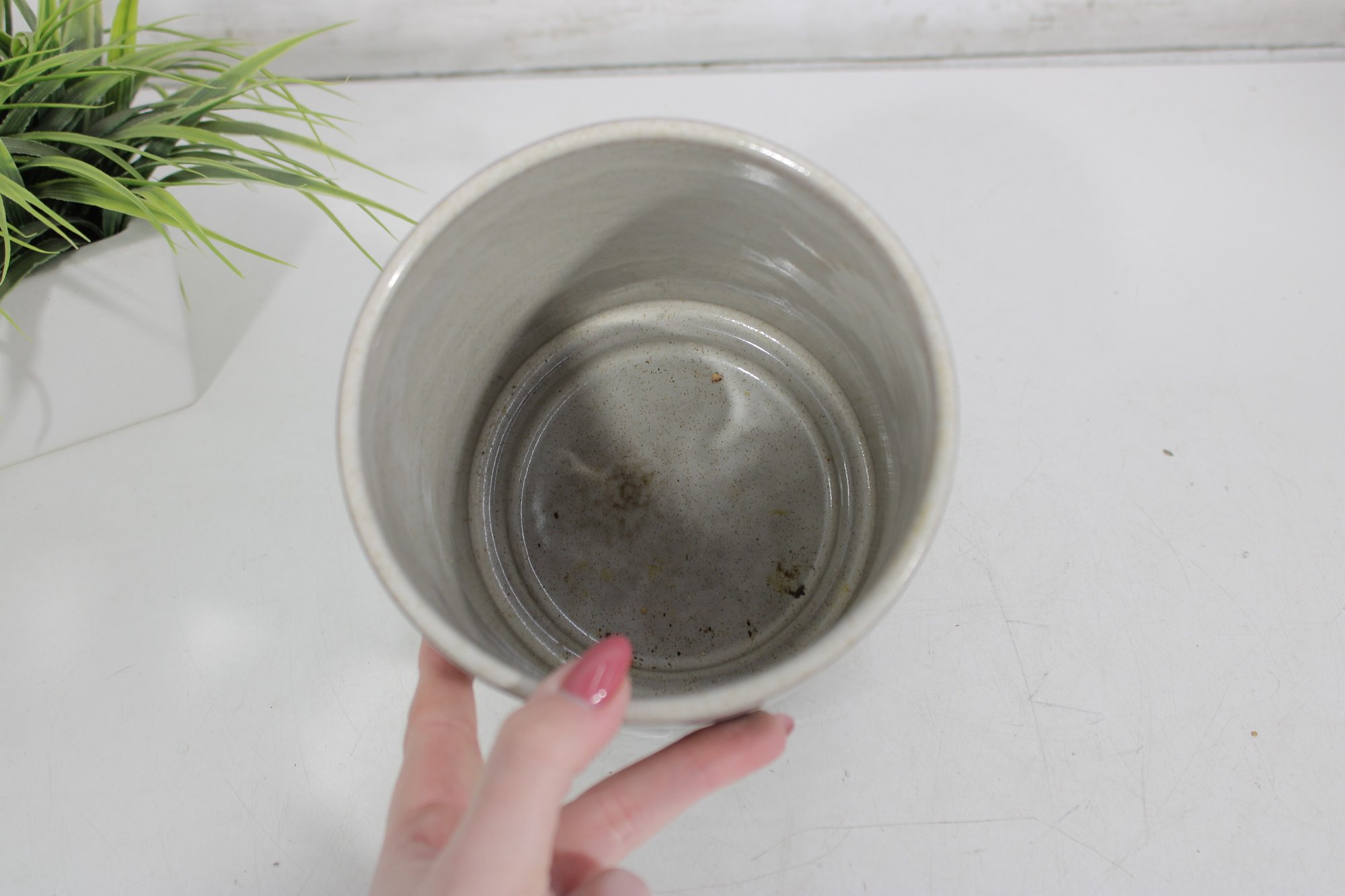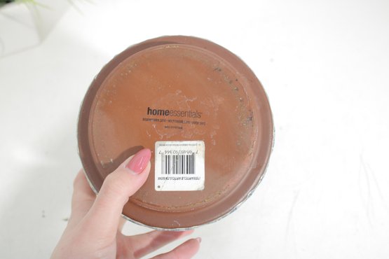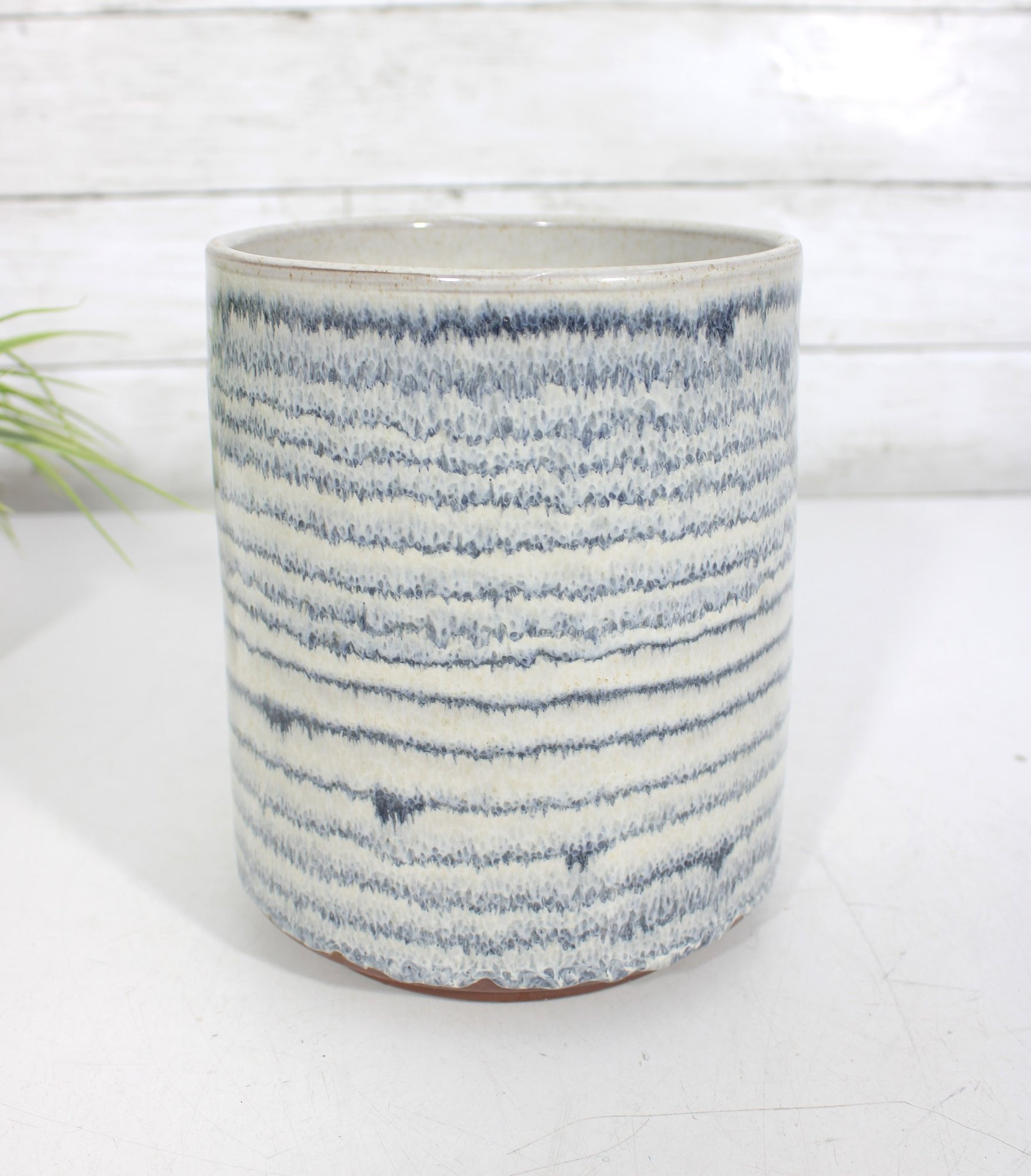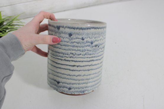 Attractive stoneware planter featuring a blue and white striped pattern with a textured, hand-crafted look. Made in Portugal for HomeGoods, this piece has a modern coastal feel with subtle variations in the glaze that add depth and character.
