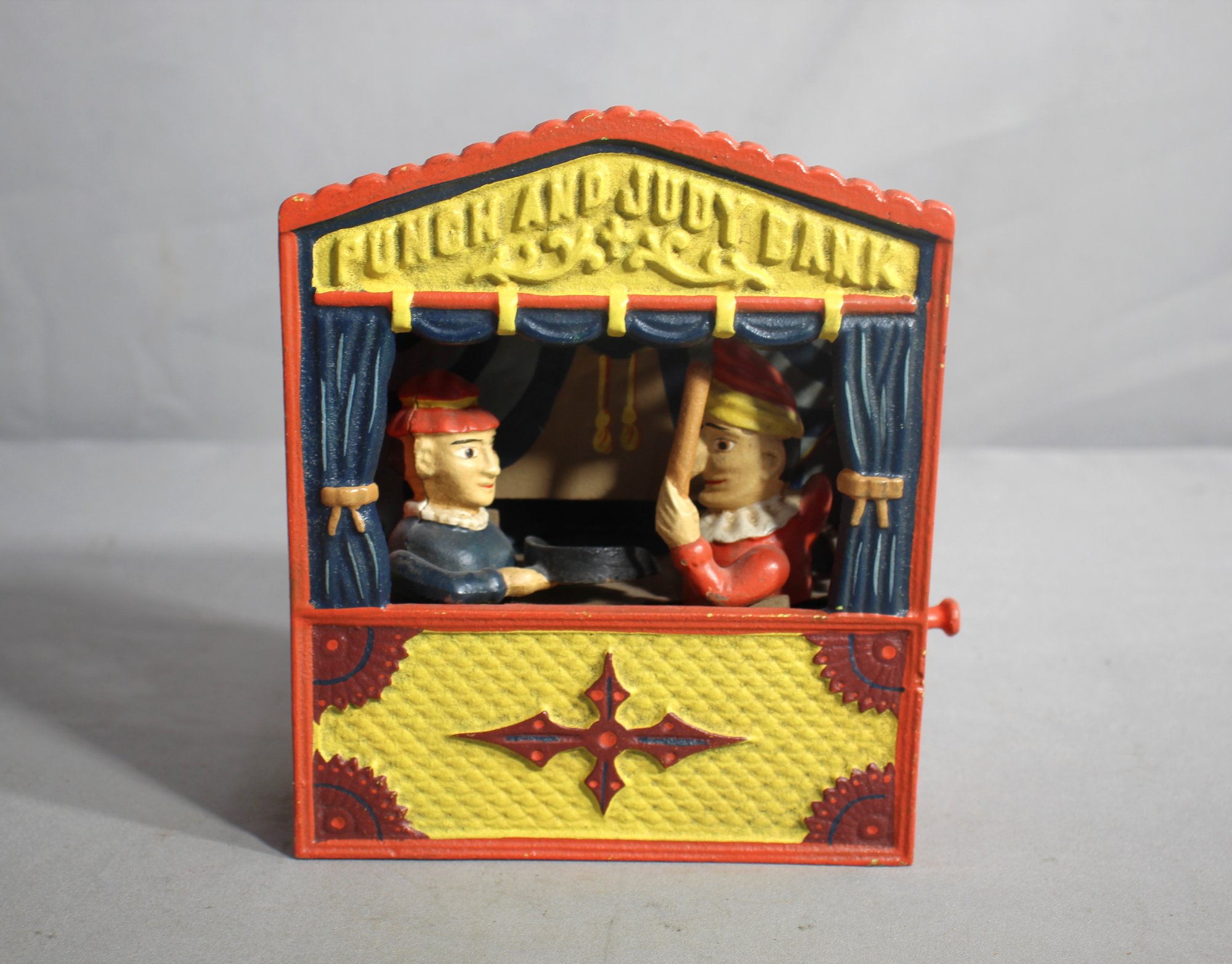 This nostalgic piece captures the essence of traditional British seaside entertainment, now transformed into a collectible item. The vibrantly painted cast-iron façade, adorned with rich colors of red and gold, is sure to catch the eye of both young and old. It showcases Punch and Judy characters in their puppet booth, ready to perform their next skit. This bank is not only a delightful nod to yesteryear's amusements but also a functional piece to teach the value of saving in a fun and interactive way.
