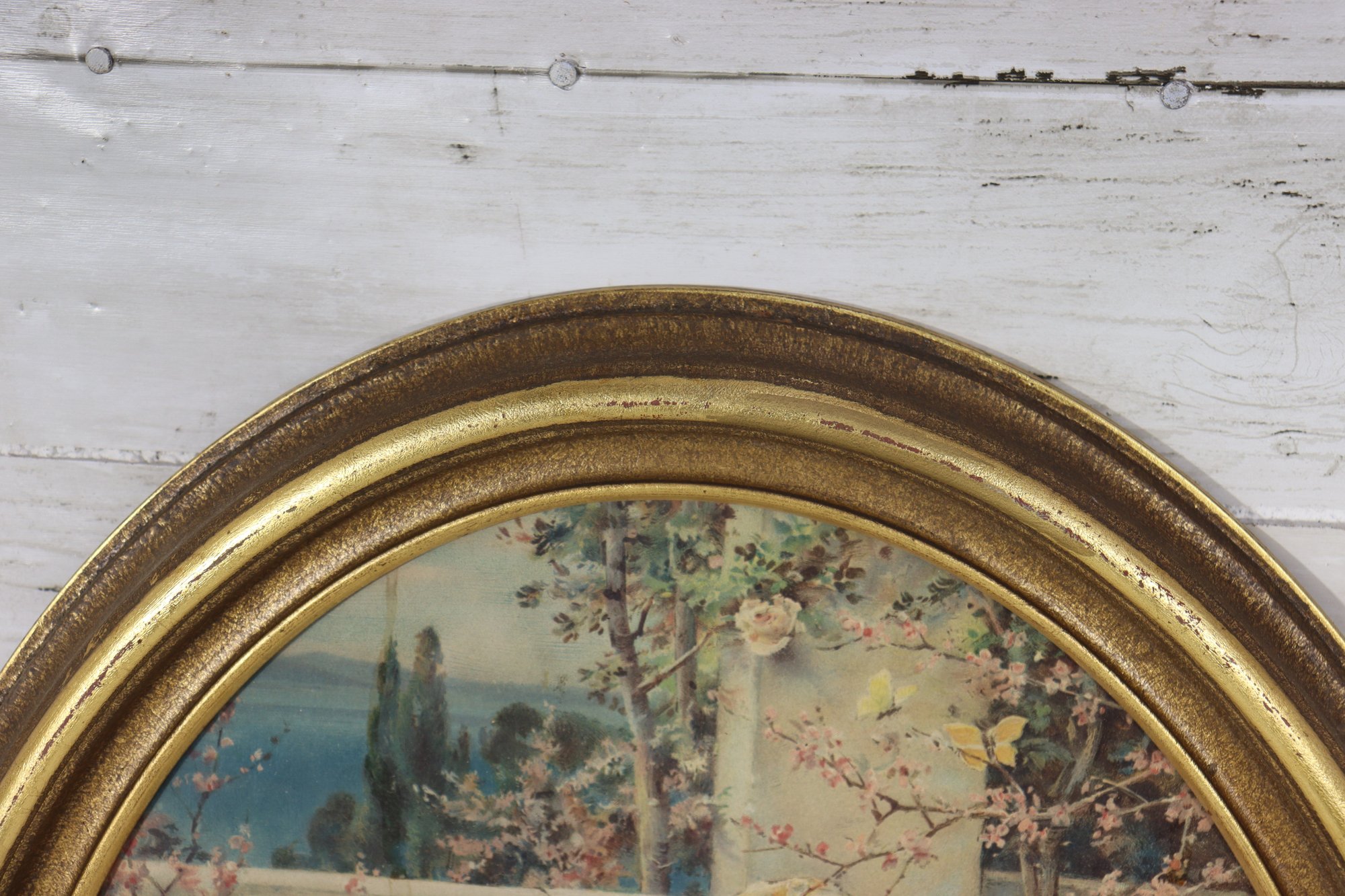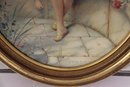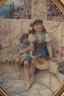 The artwork is housed in a classic oval gilt frame, which enhances the romantic, period aesthetic and makes the piece immediately ready for display. The image reflects the popular late 19th- to early 20th-century taste for sentimental childhood scenes and decorative interior art.