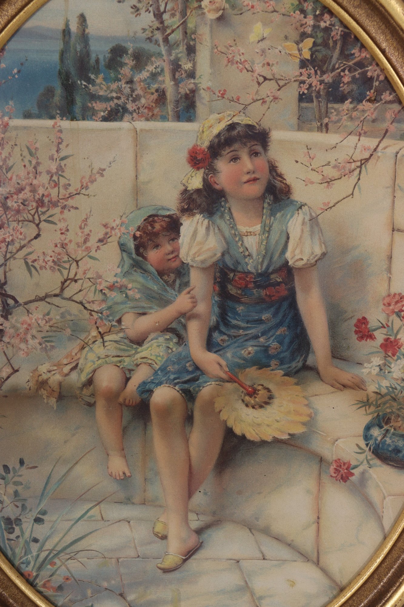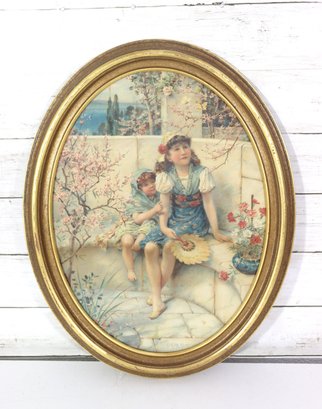 a beautifully presented oval framed print depicting a tender Victorian-era garden scene, featuring two children seated on a stone bench surrounded by flowering branches and soft architectural details. The composition captures a moment of quiet innocence, rendered in gentle pastel tones with fine attention to costume, setting, and expression.