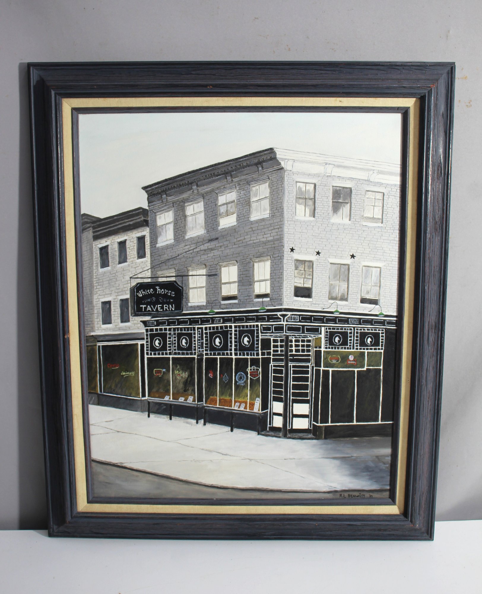 This is a signed painting by artist R.L. Benwitt, completed in 1993, depicting the iconic White Horse Tavern in a charming urban streetscape. The artwork captures the architectural details of the historic tavern with a strong black-and-white contrast, accented by subtle pops of color in the signage and windows. The detailed rendering of the building and its surroundings gives the painting a nostalgic and timeless feel.