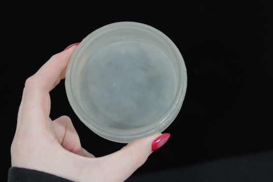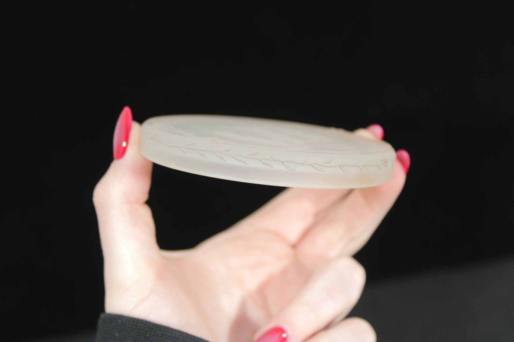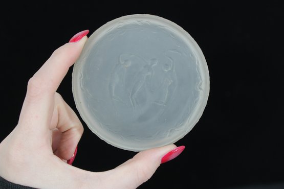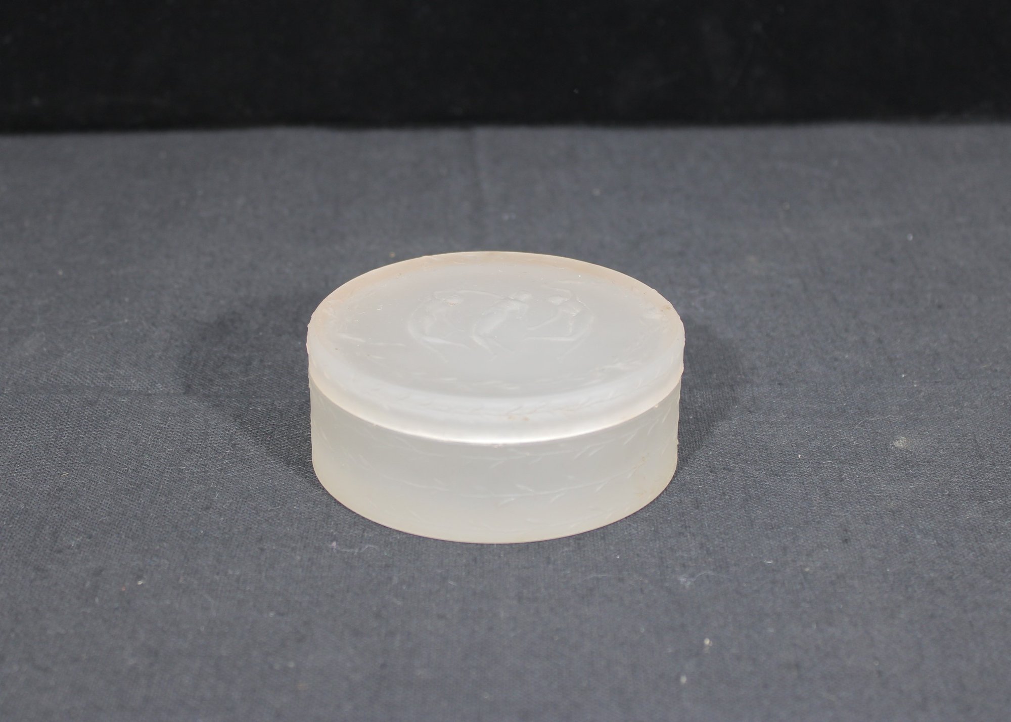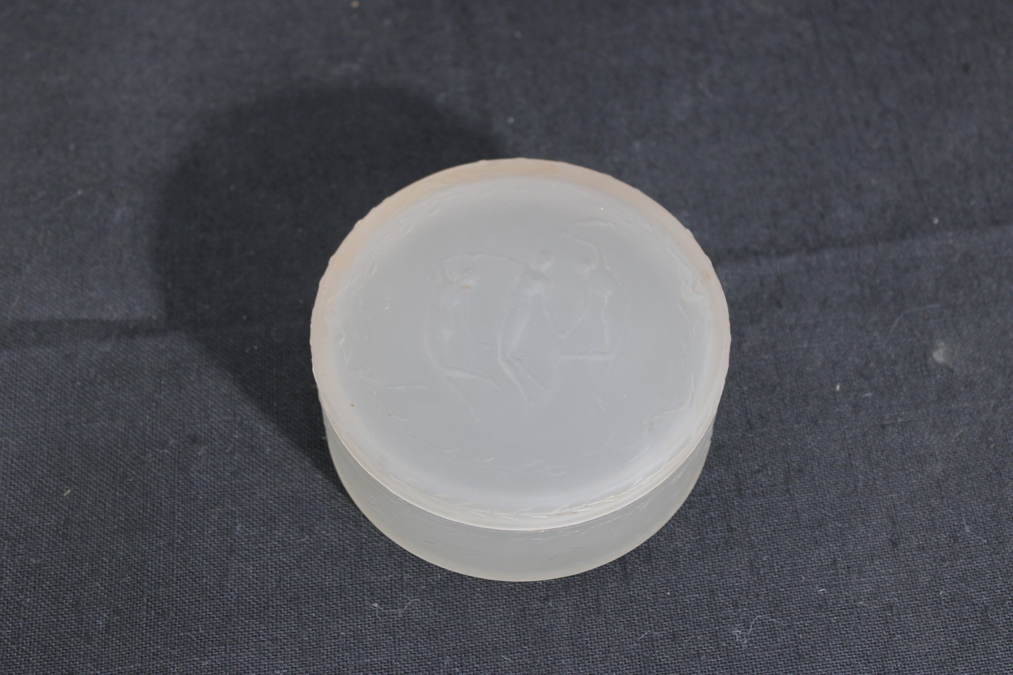 an elegant R. Lalique frosted glass round box in the iconic “Trois Figurines (Trois Nus)” / D’Orsay pattern, featuring beautifully molded dancing nude female figures in relief.