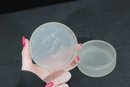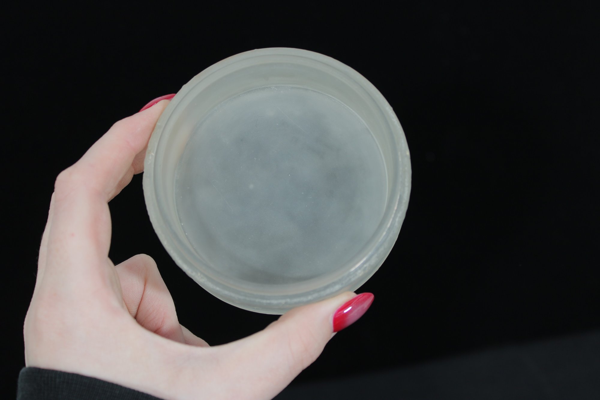 The box measures approximately 3.75 inches in diameter and consists of a fitted lid and base, making it ideal as a trinket box, dresser jar, or display piece.