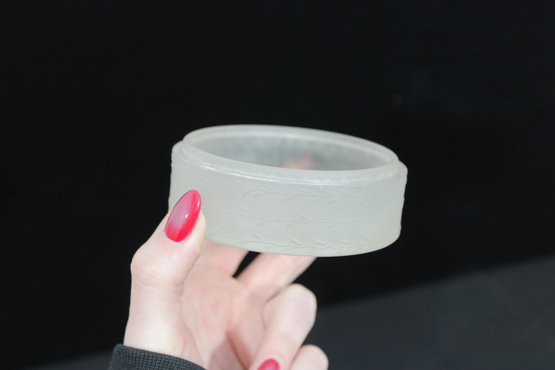 This piece showcases Lalique’s signature soft satin-frosted finish, with delicate sculptural detail visible across the lid. The classical motif of intertwined dancers reflects the refined Art Deco aesthetic for which René Lalique is renowned.