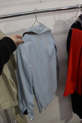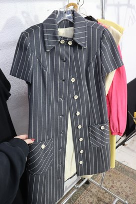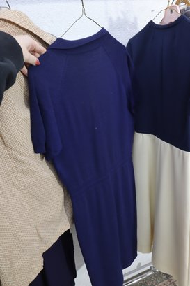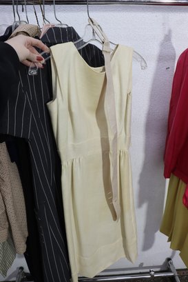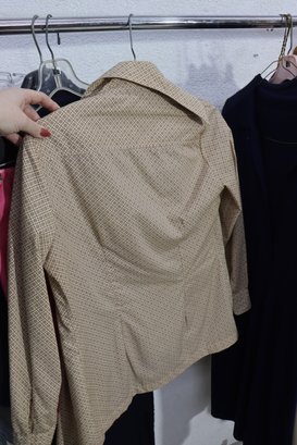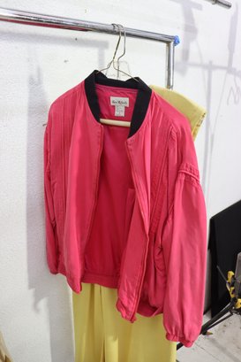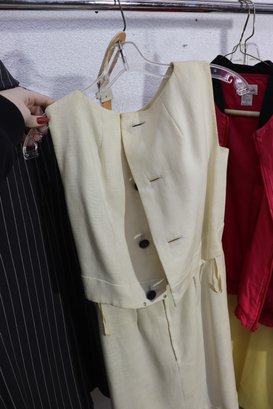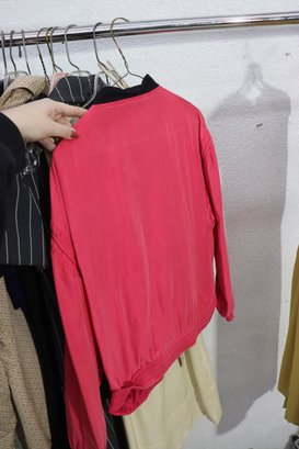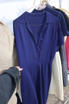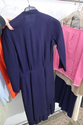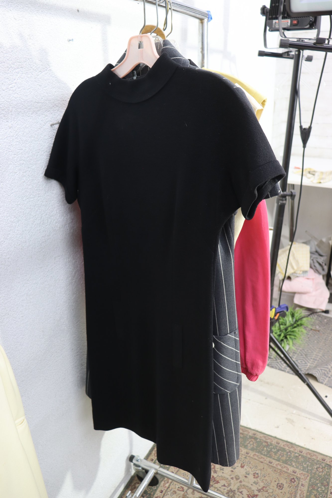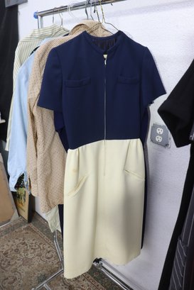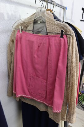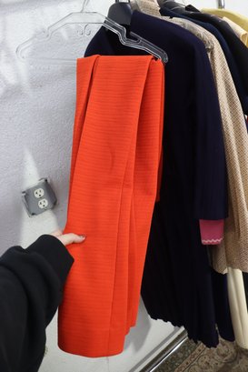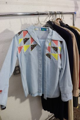 a mixed rack of vintage women’s clothing, featuring an eye-catching assortment of dresses, jackets, tops, and coordinated pieces. This lot showcases distinctive colors, patterns, and silhouettes commonly associated with mid-to-late 20th century fashion.