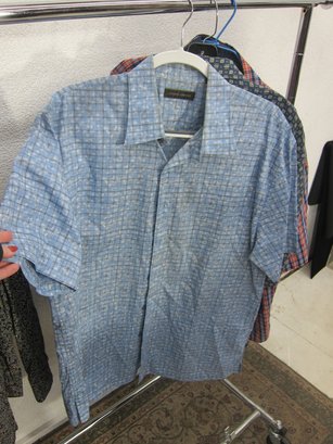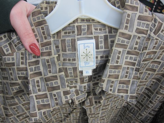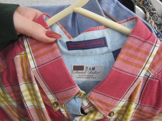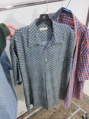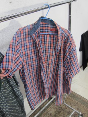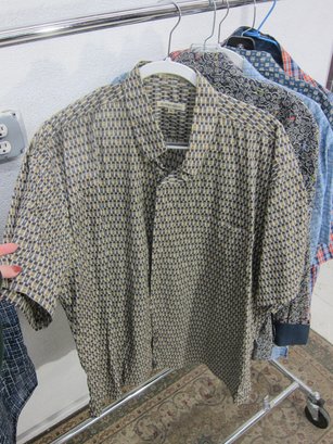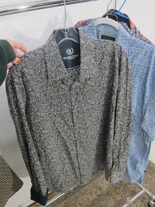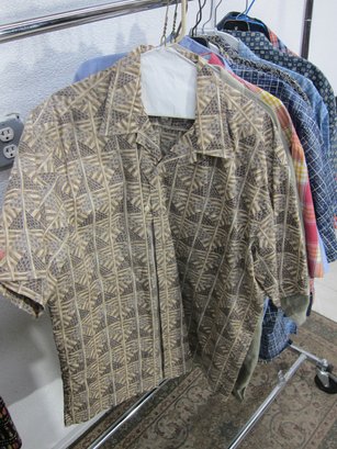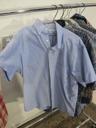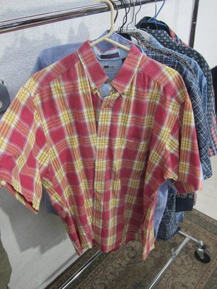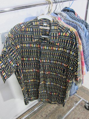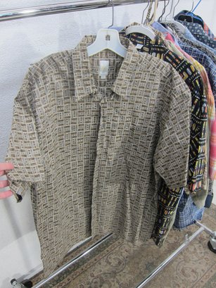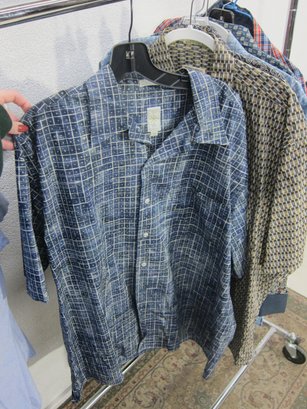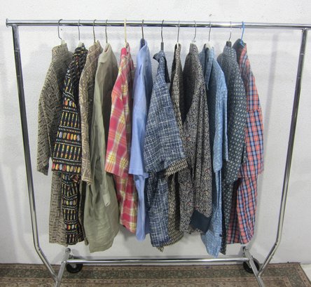 a group lot of men’s button-down shirts featuring a wide variety of colors, patterns, and styles. The lot includes plaid, geometric, and solid designs, offering a great mix for work, casual wear, or resale.