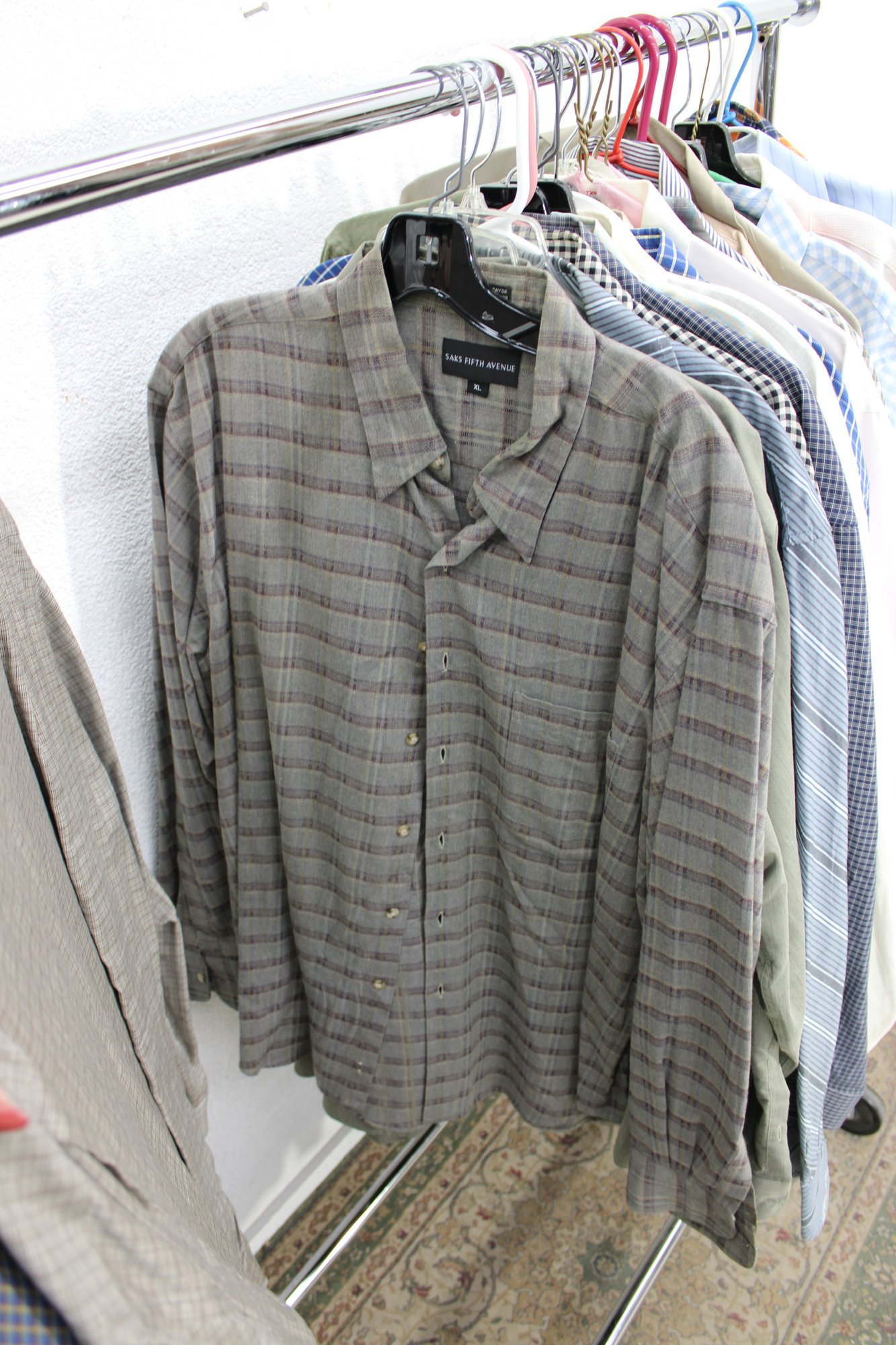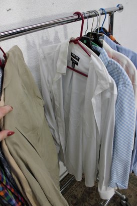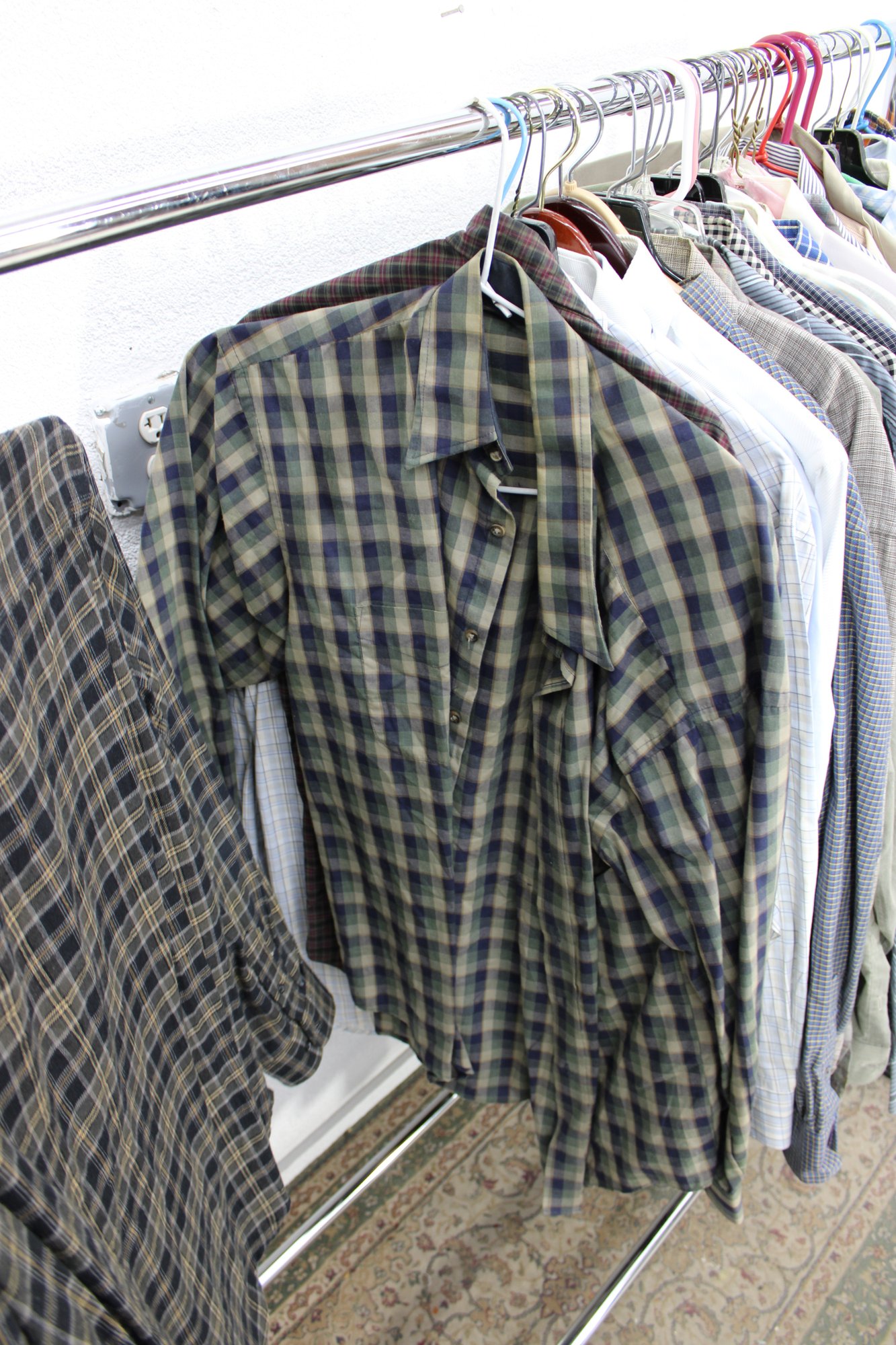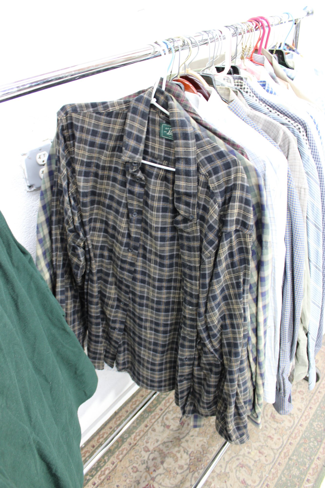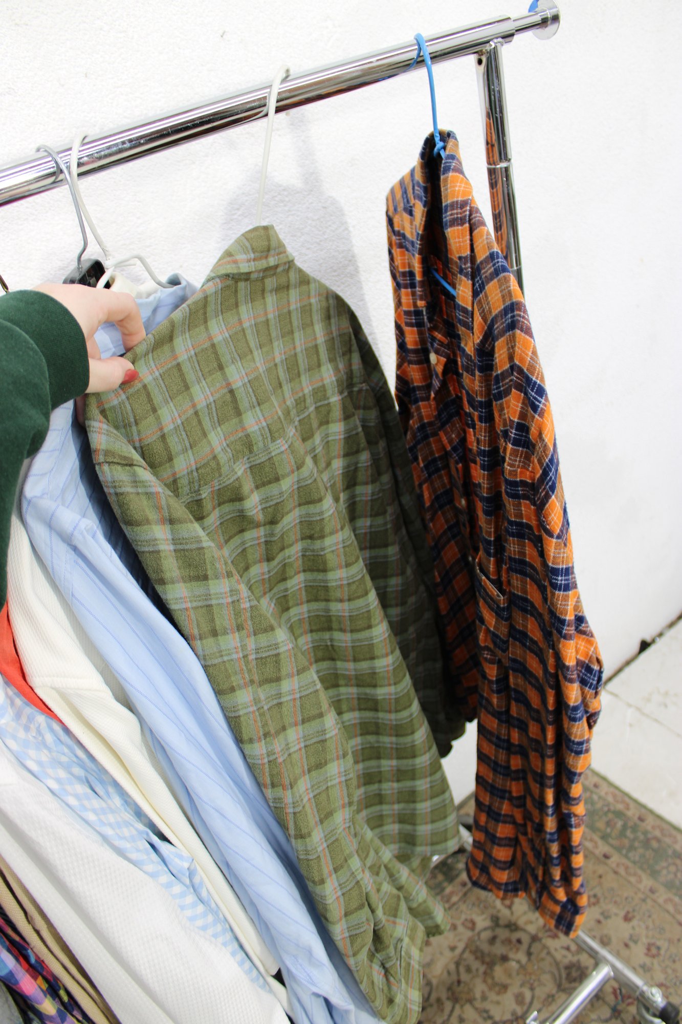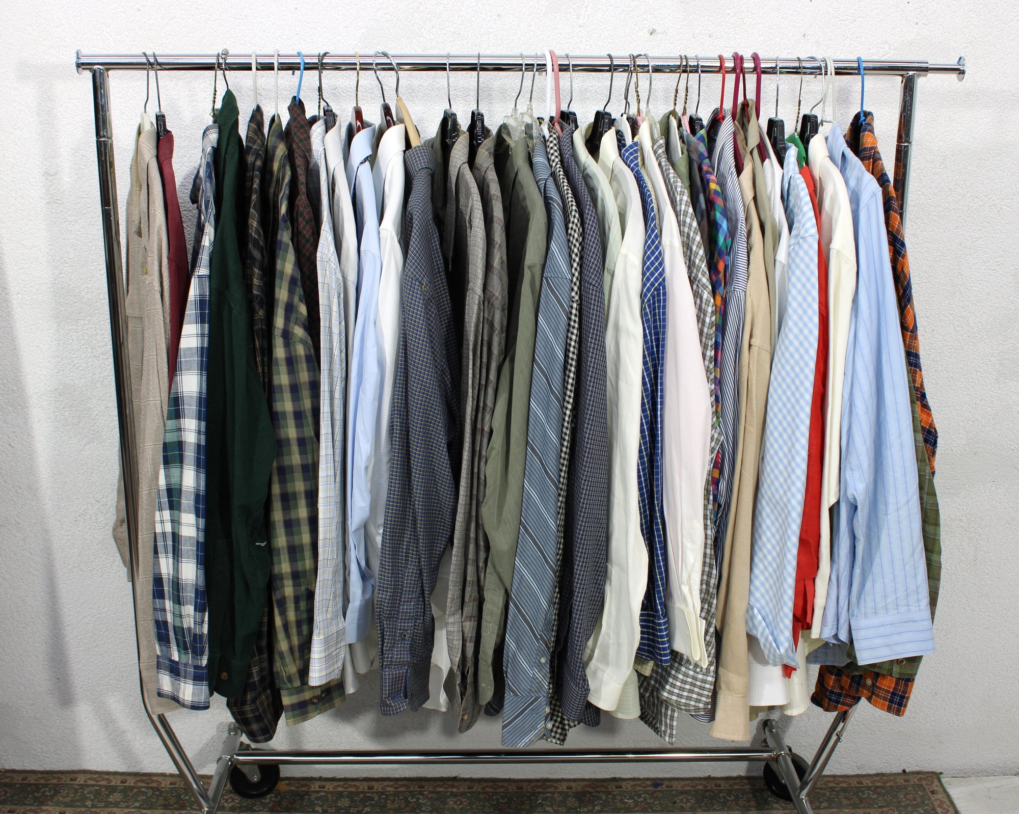 a full rack lot of men’s tops featuring a wide assortment of shirts in mixed colors, patterns, and styles. The rack includes button-downs, casual shirts, and everyday wear pieces suitable for work, leisure, or resale.