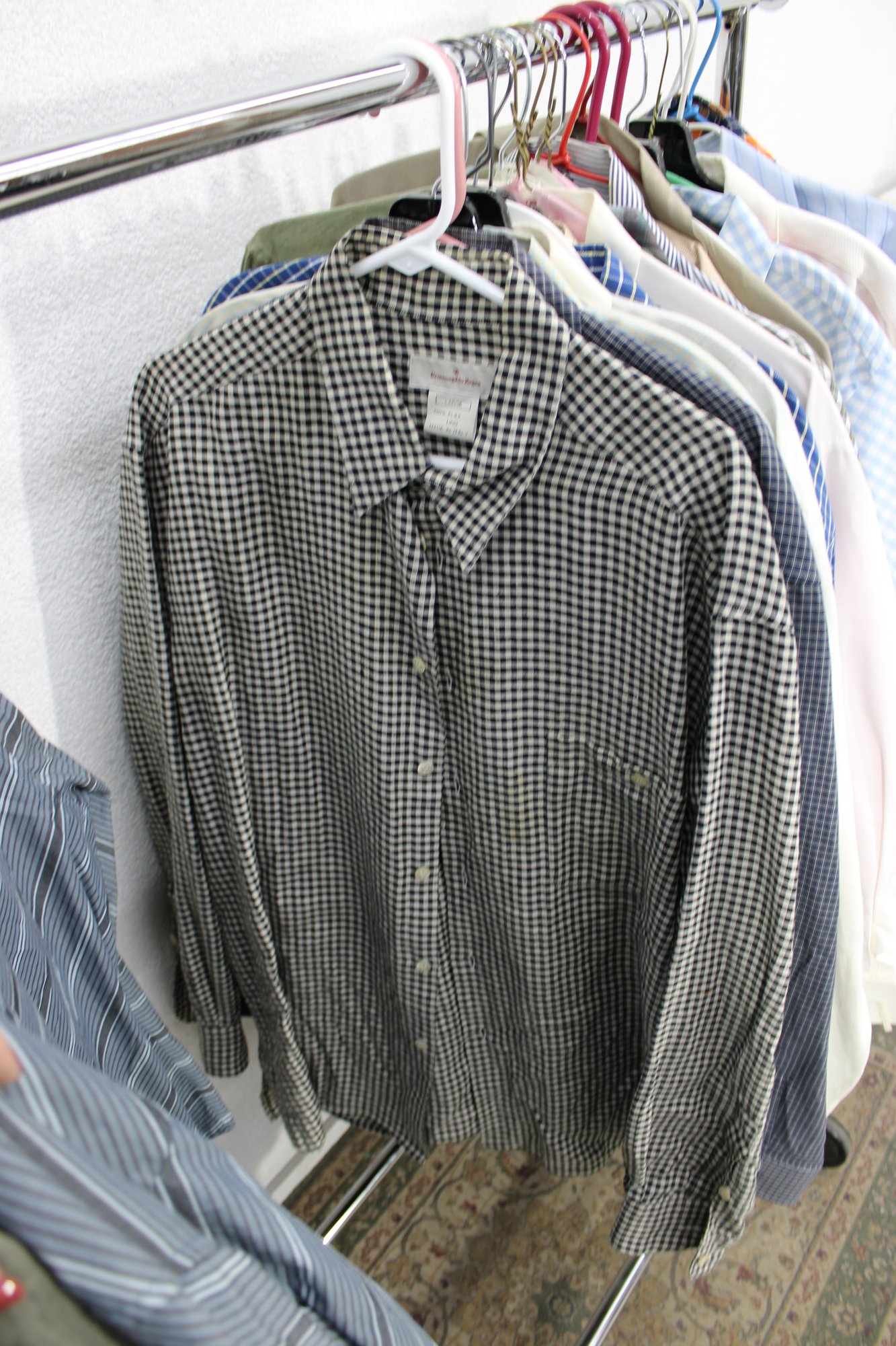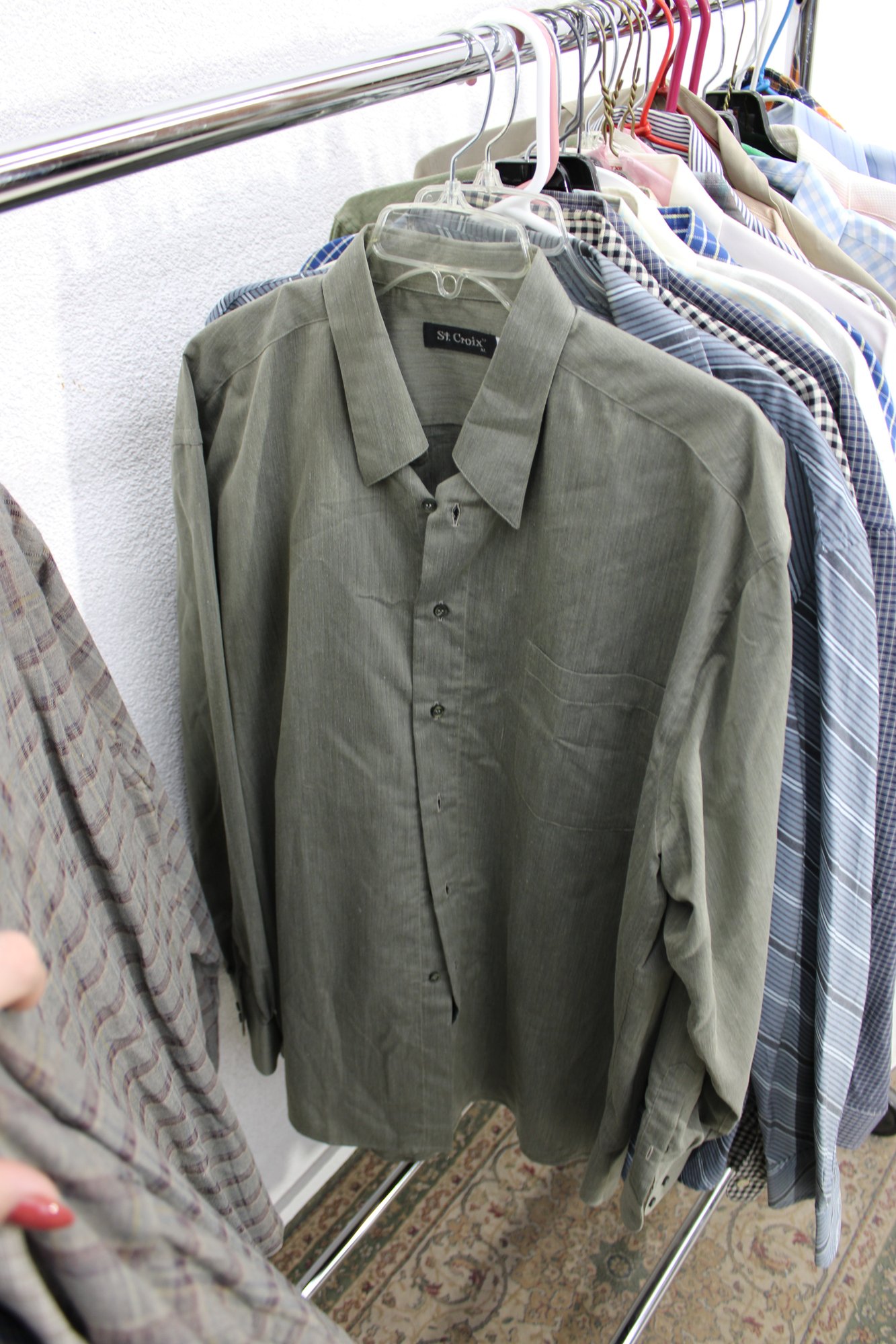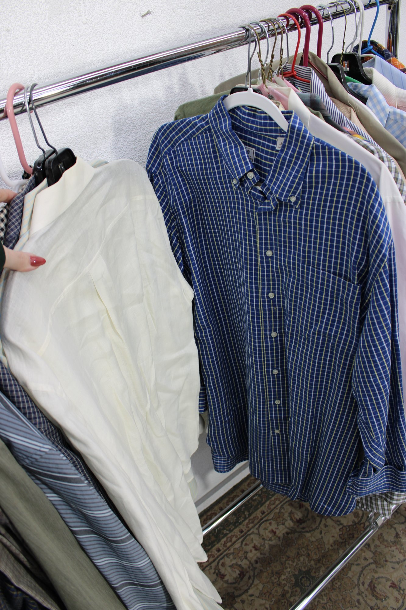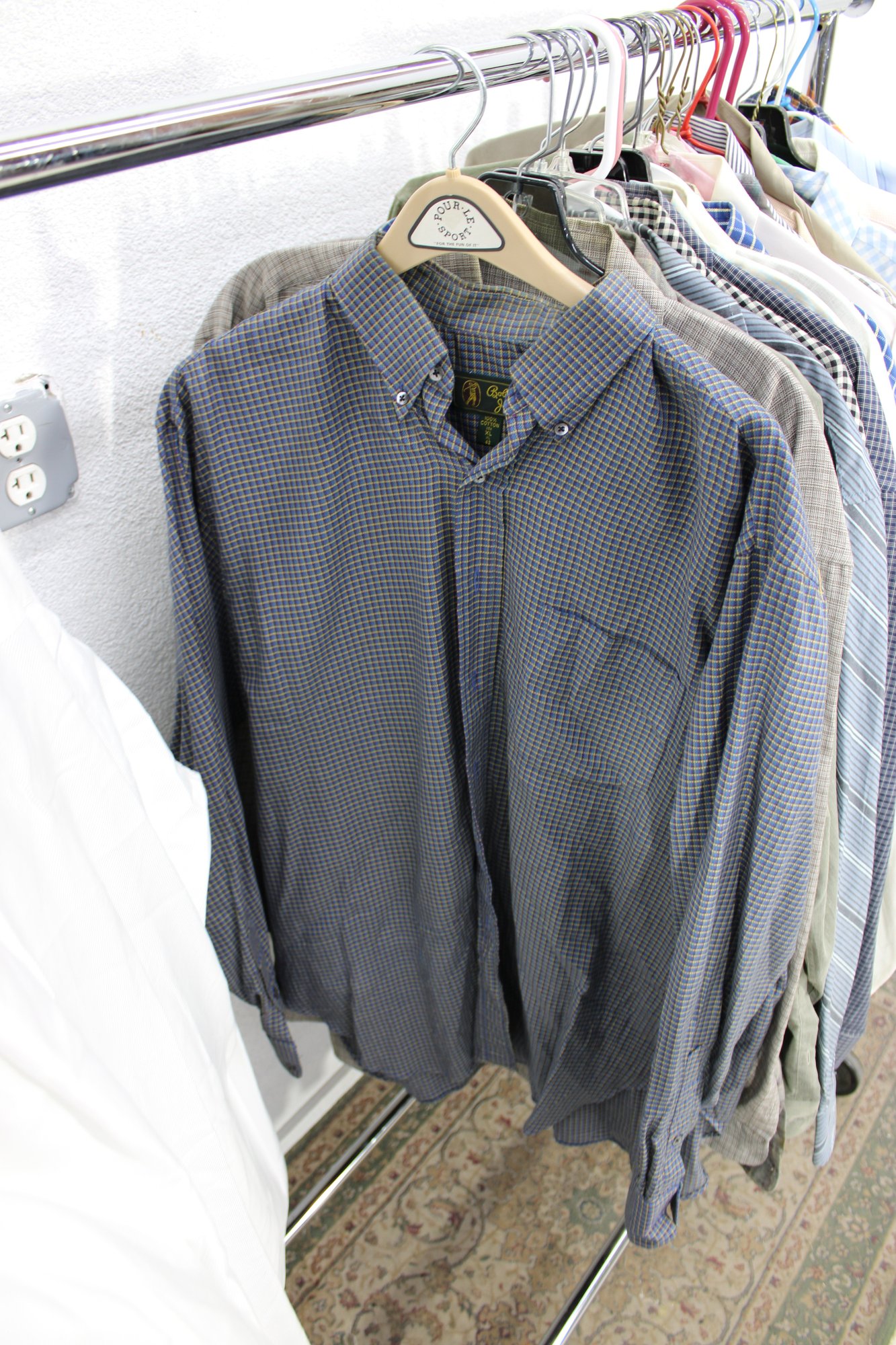 a full rack lot of men’s tops featuring a wide assortment of shirts in mixed colors, patterns, and styles. The rack includes button-downs, casual shirts, and everyday wear pieces suitable for work, leisure, or resale.