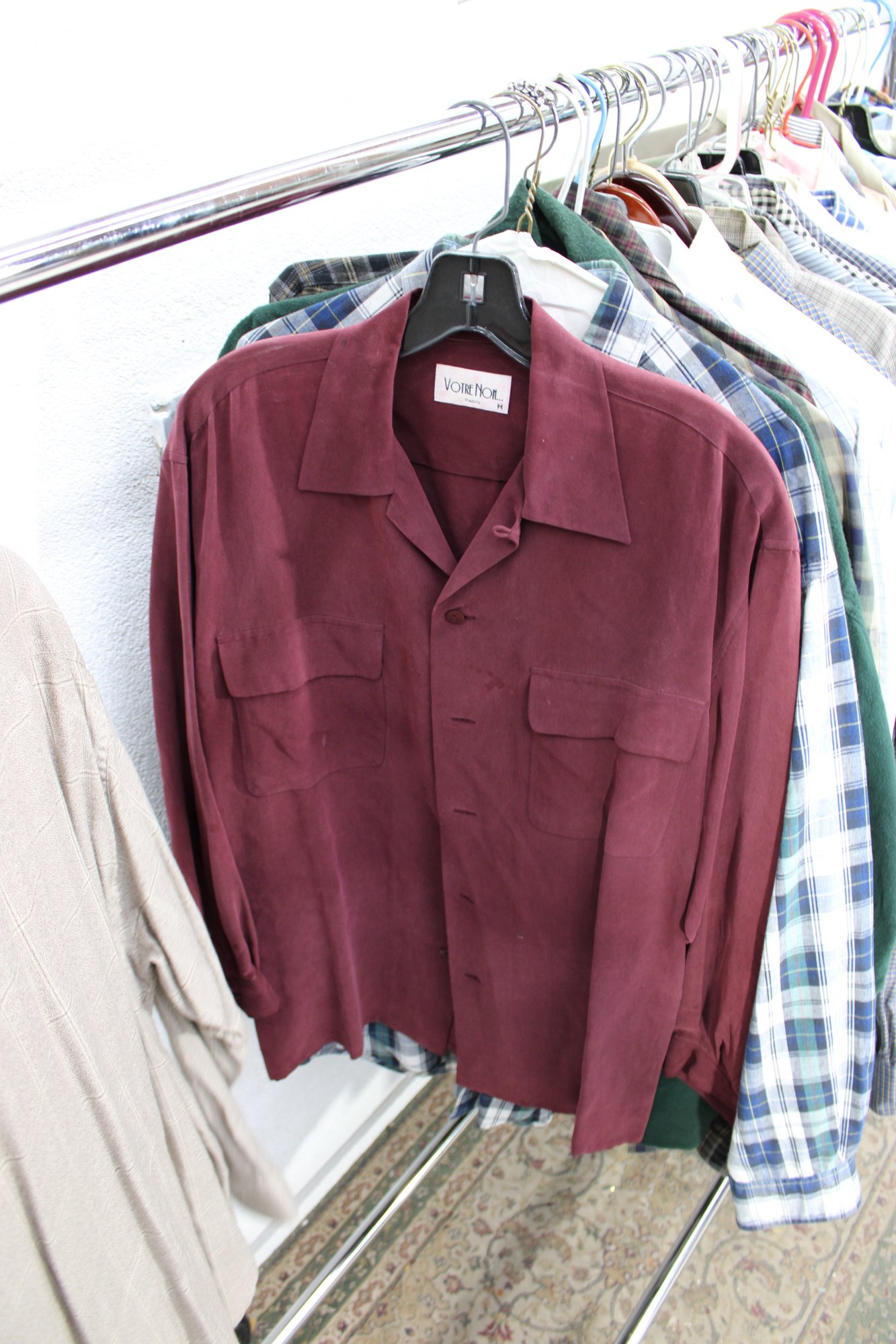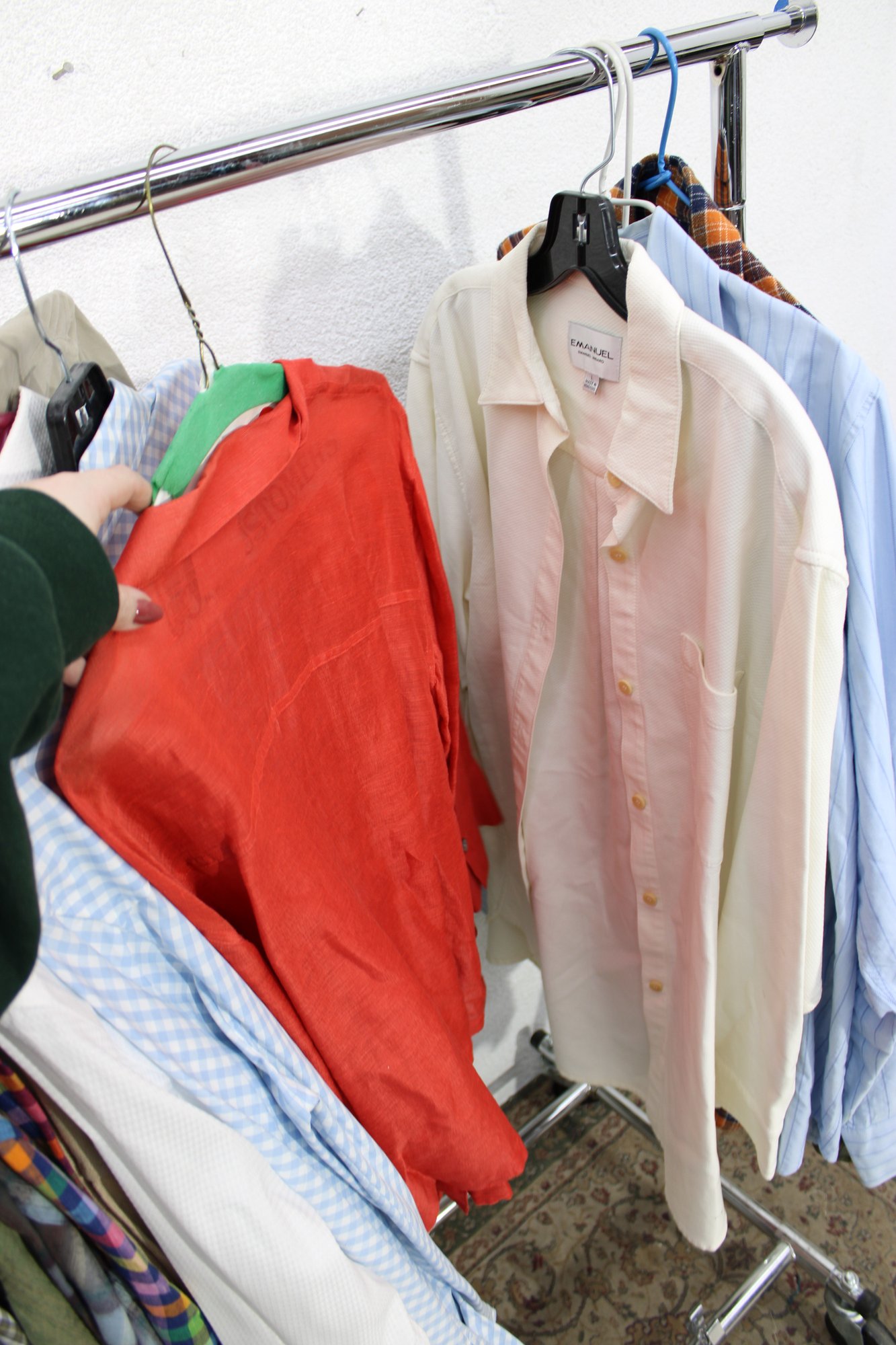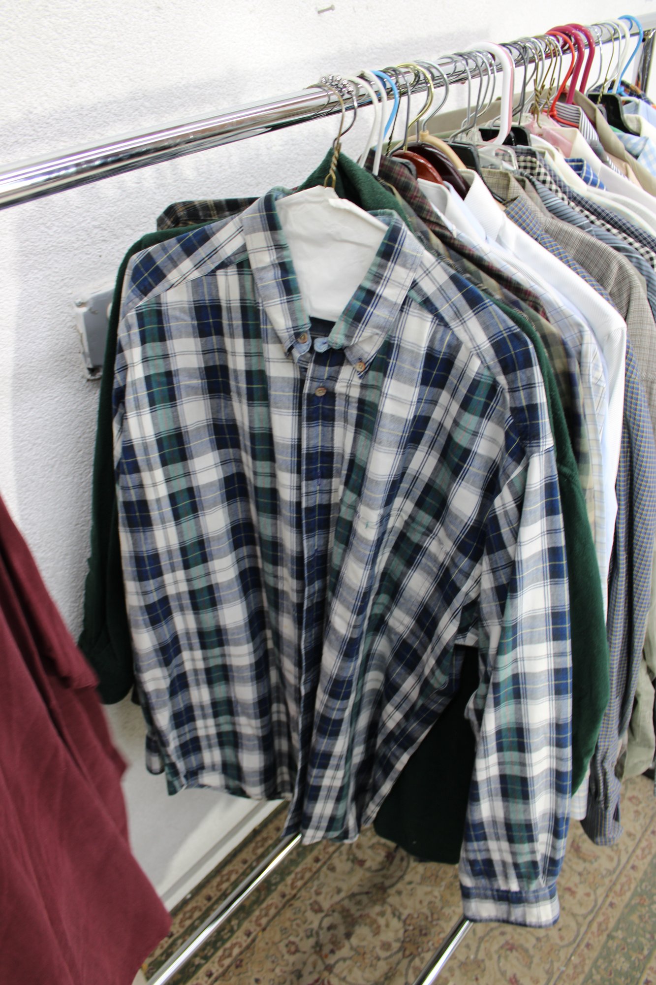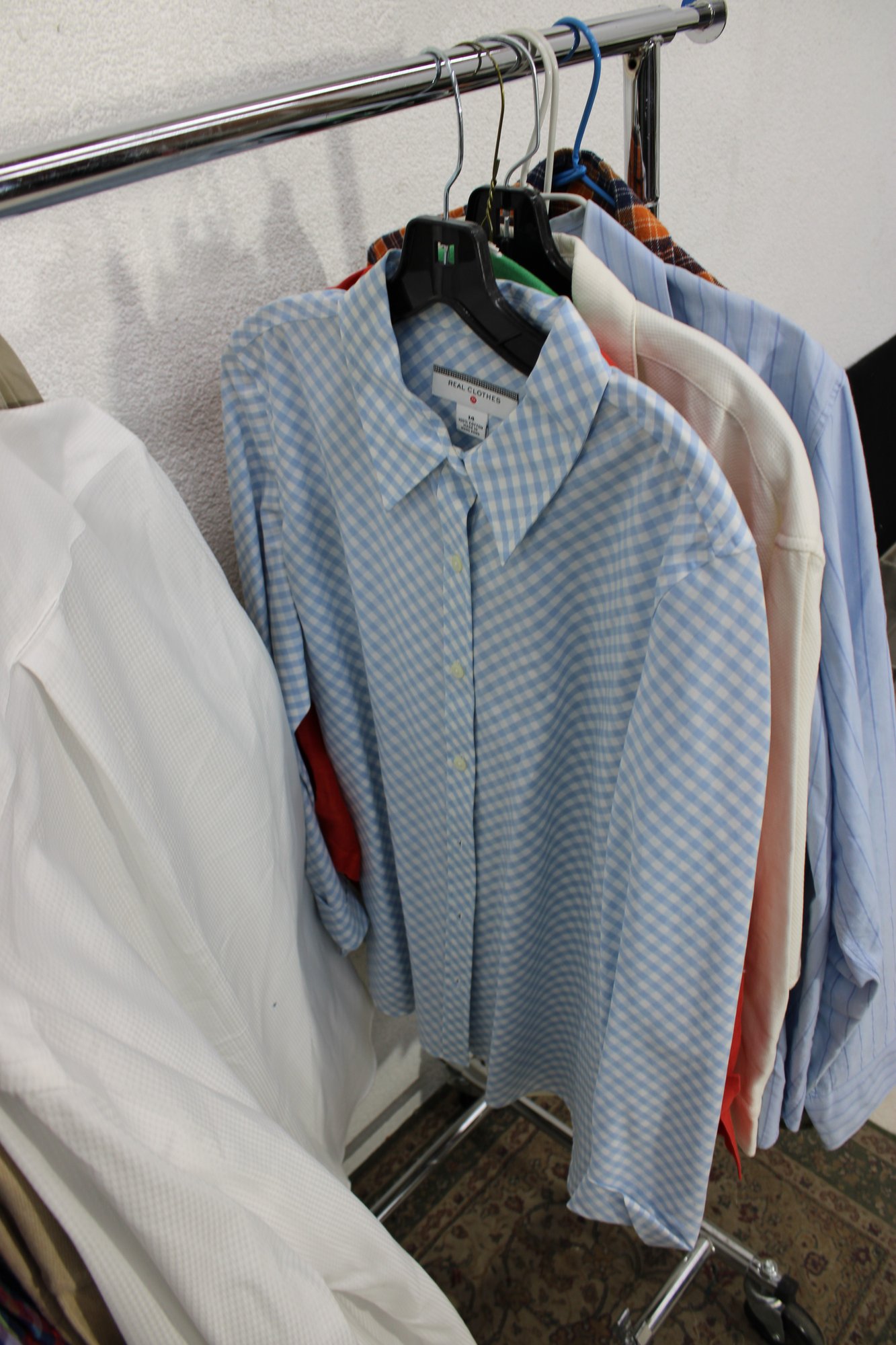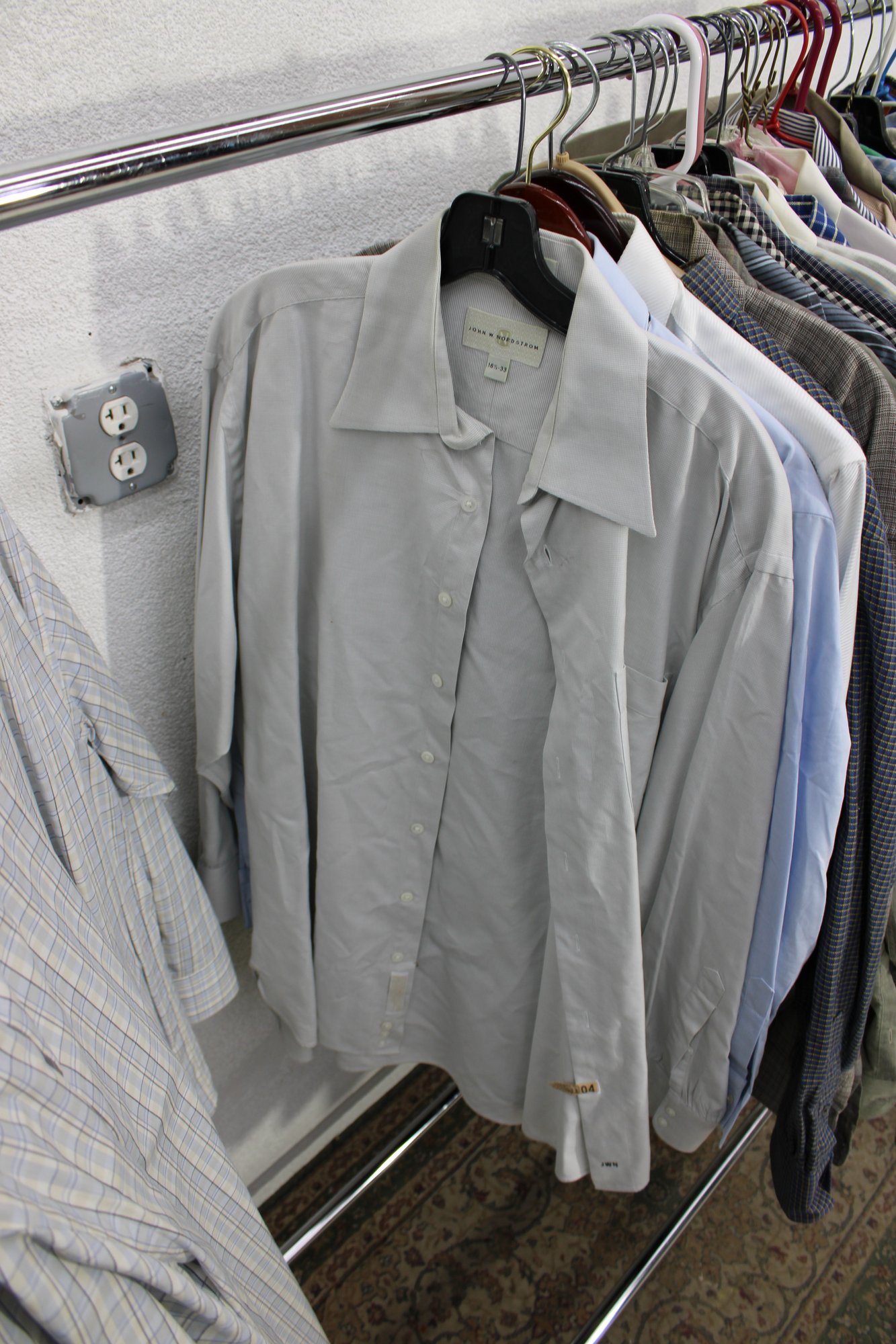 a full rack lot of men’s tops featuring a wide assortment of shirts in mixed colors, patterns, and styles. The rack includes button-downs, casual shirts, and everyday wear pieces suitable for work, leisure, or resale.