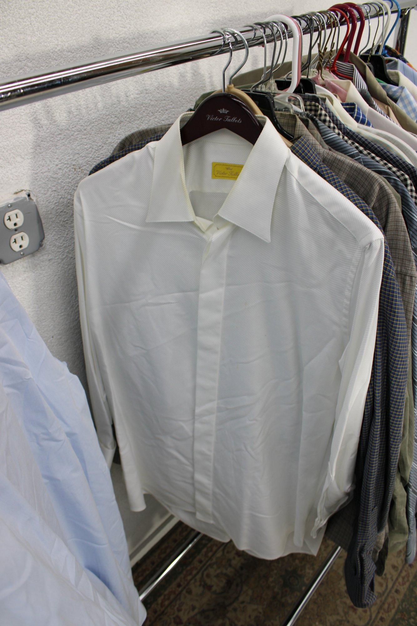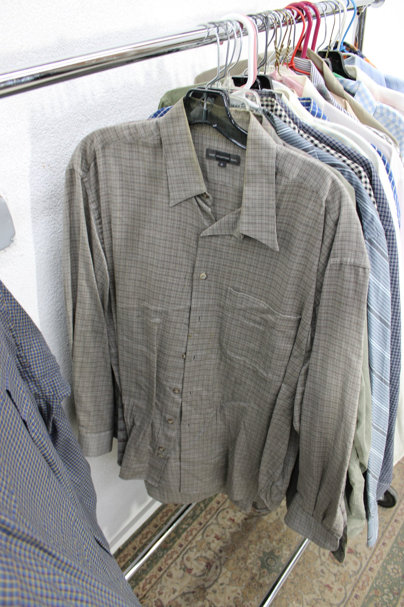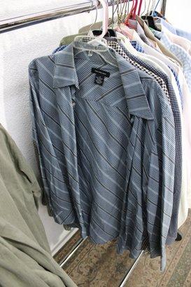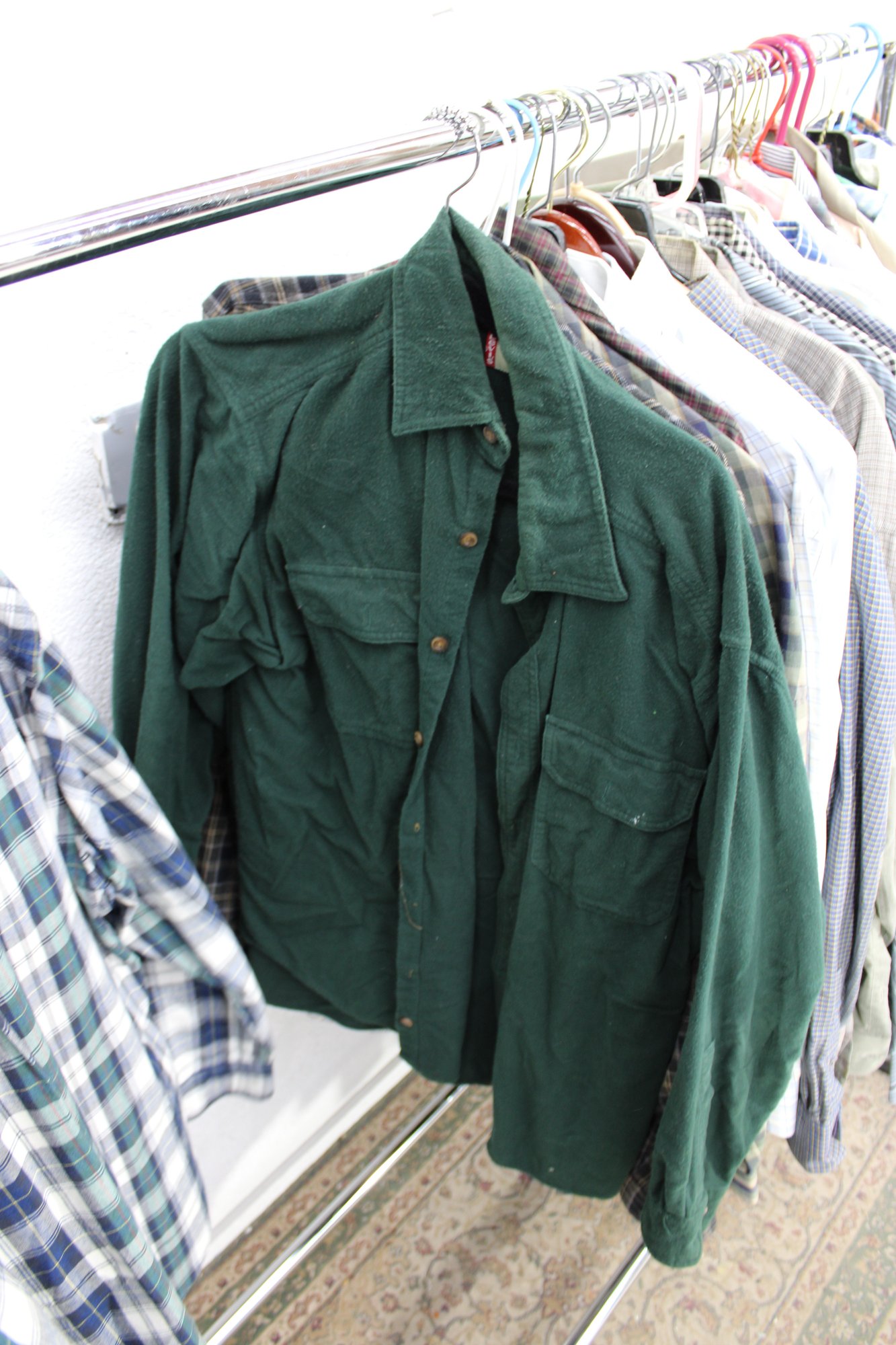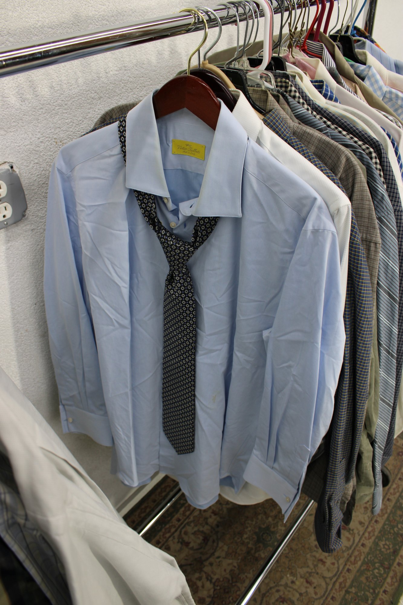 a full rack lot of men’s tops featuring a wide assortment of shirts in mixed colors, patterns, and styles. The rack includes button-downs, casual shirts, and everyday wear pieces suitable for work, leisure, or resale.