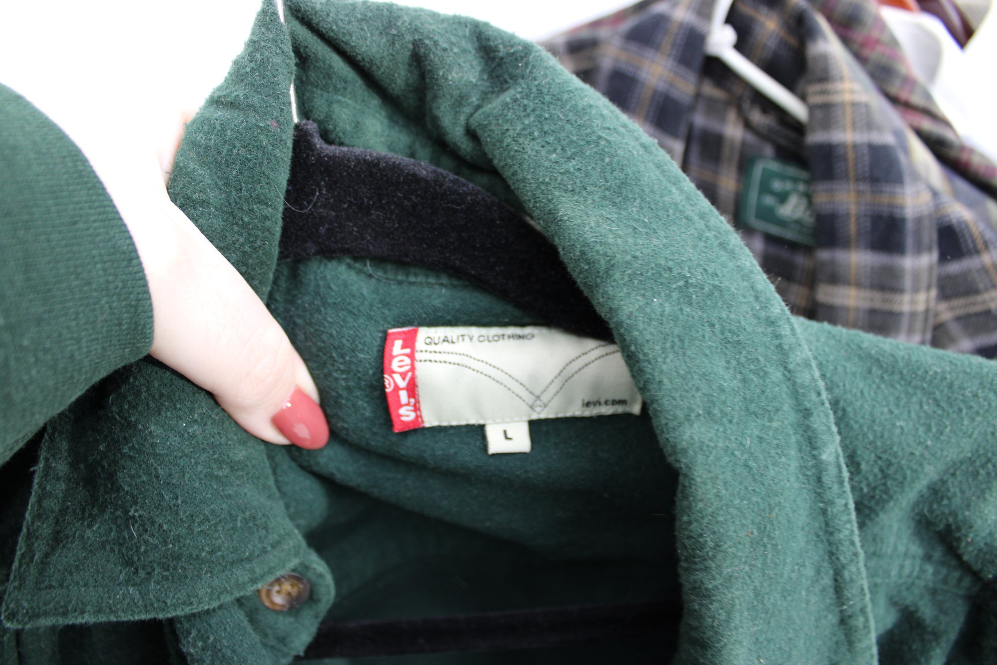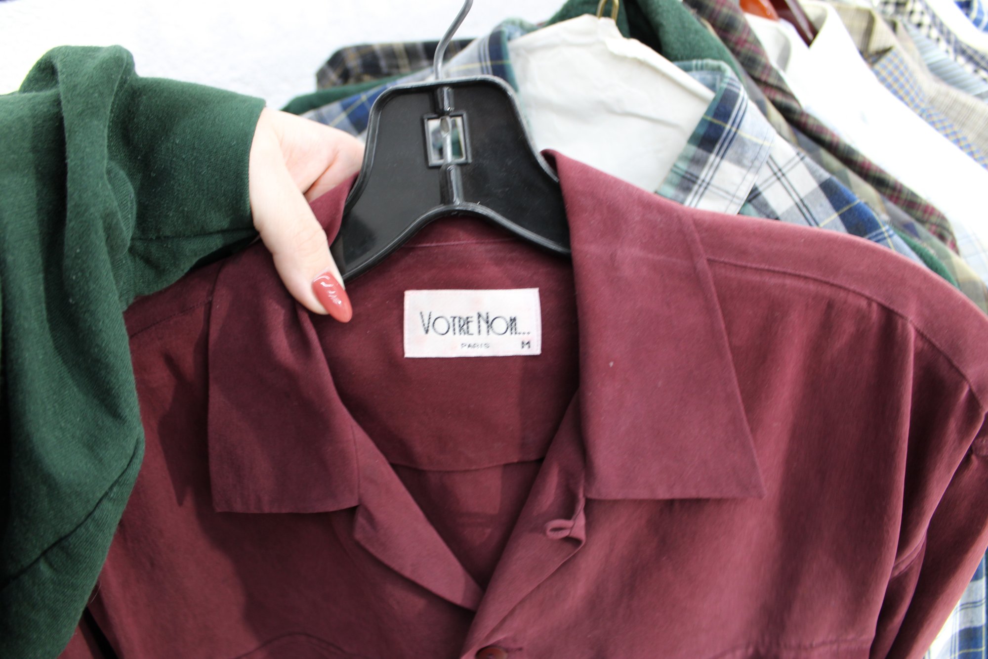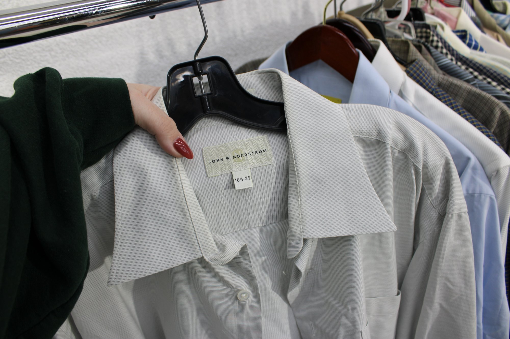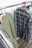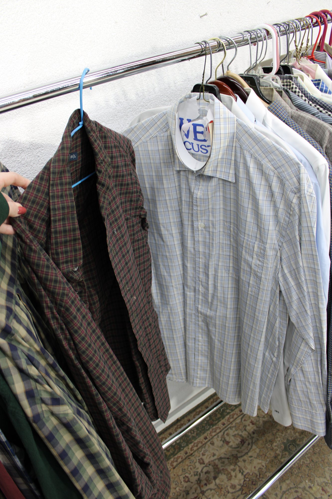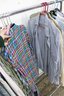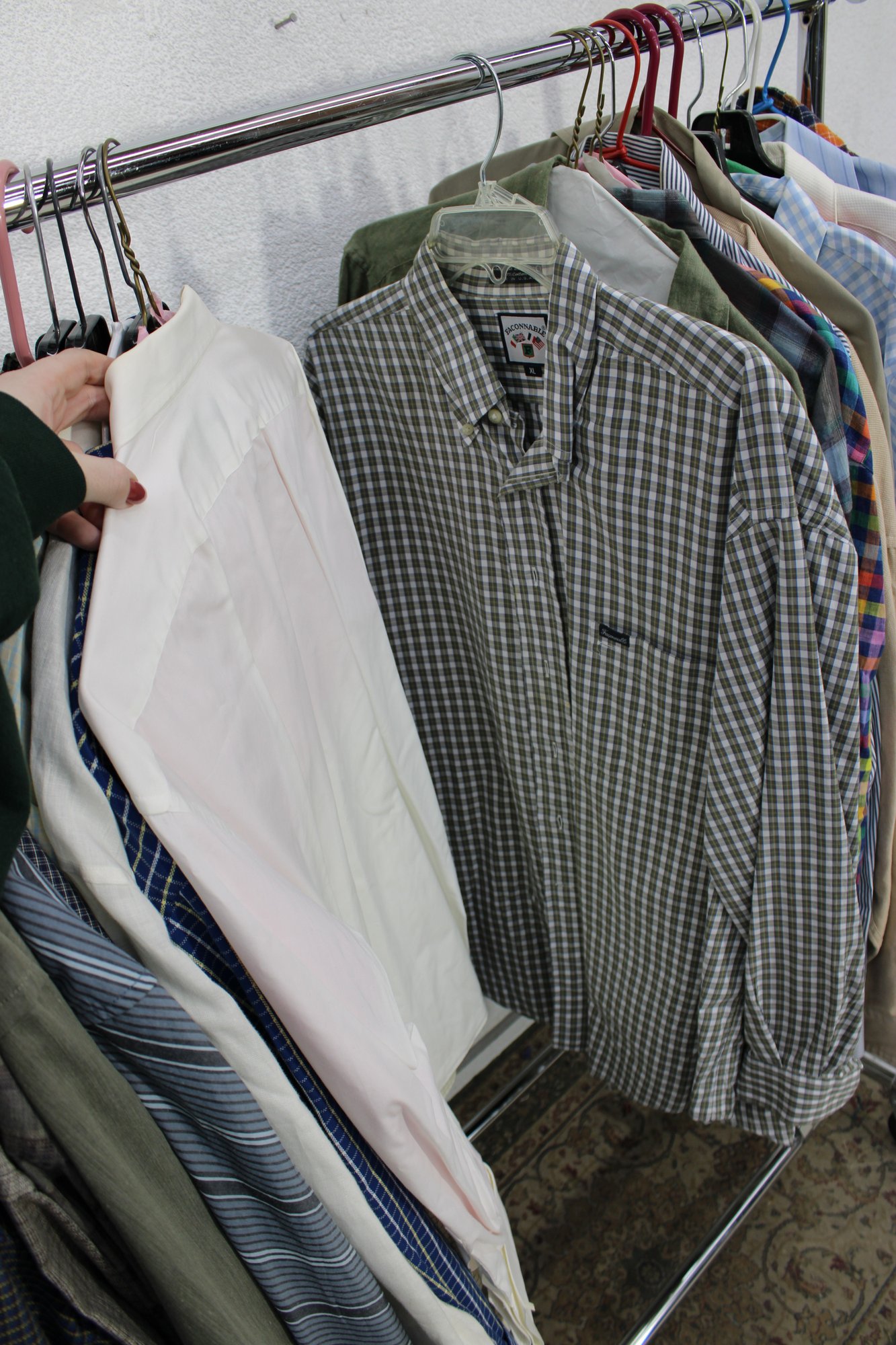 a full rack lot of men’s tops featuring a wide assortment of shirts in mixed colors, patterns, and styles. The rack includes button-downs, casual shirts, and everyday wear pieces suitable for work, leisure, or resale.