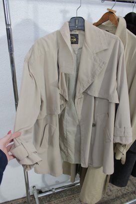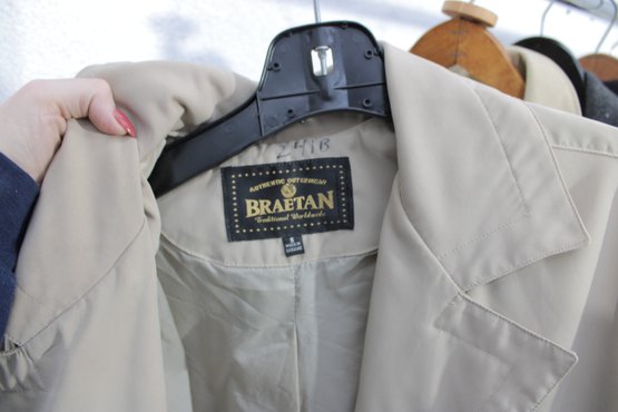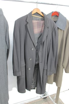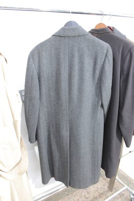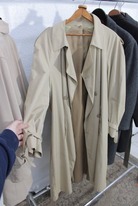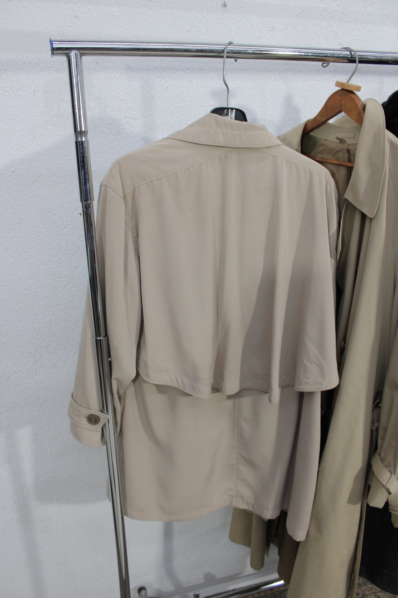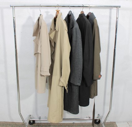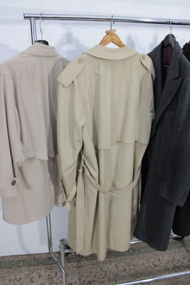 Nice group lot of men’s coats featuring classic trench coats and tailored overcoats in timeless neutral tones. This collection includes structured long coats and lightweight trench styles, ideal for fall and winter wear, resale, costume use, or wardrobe building.