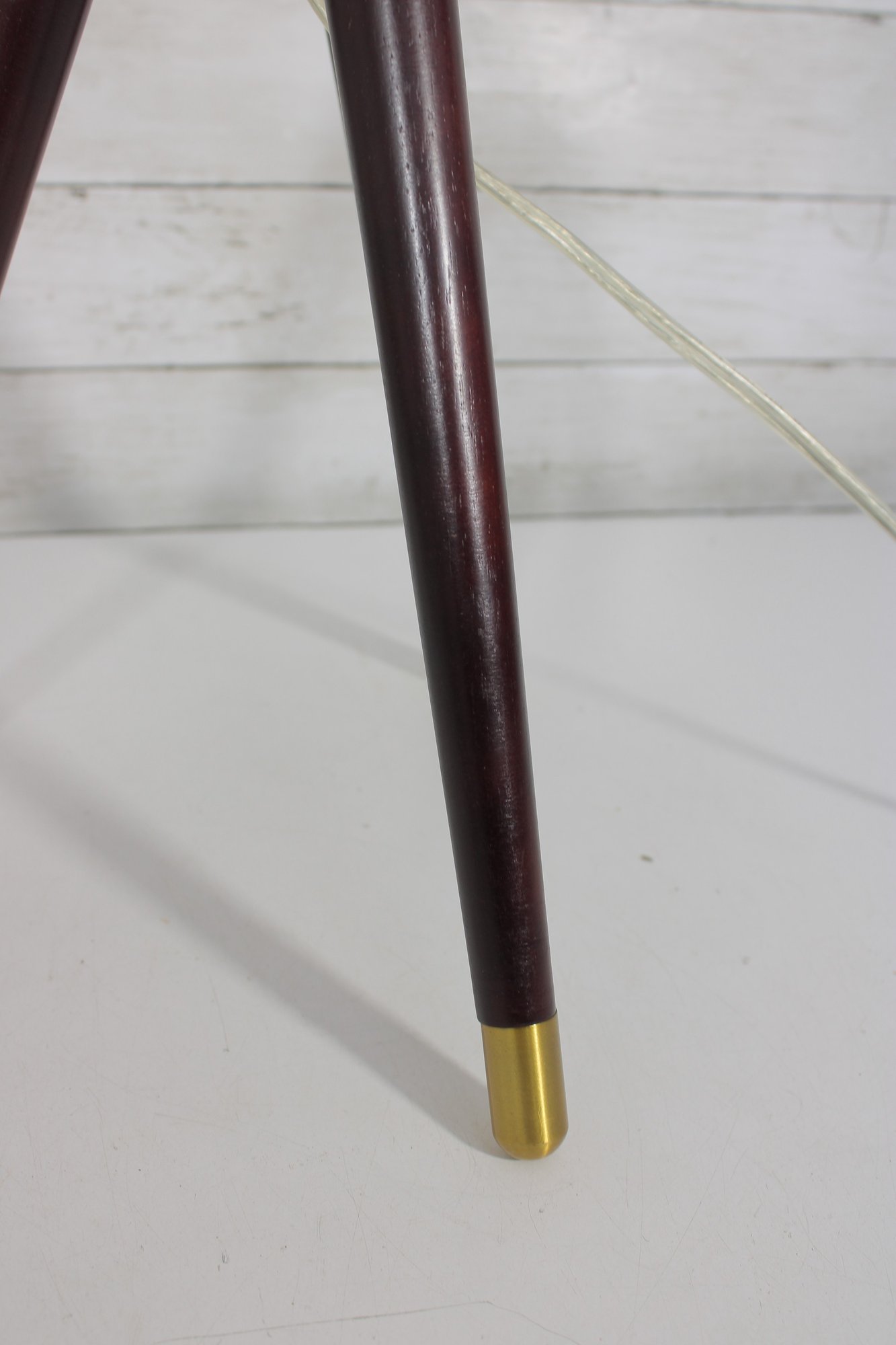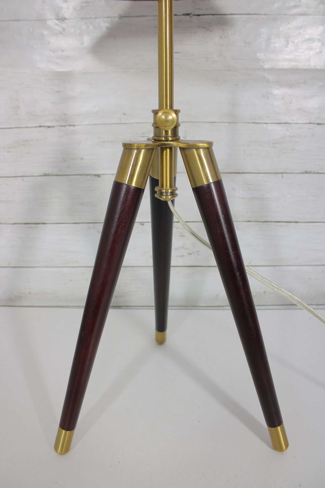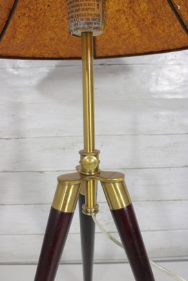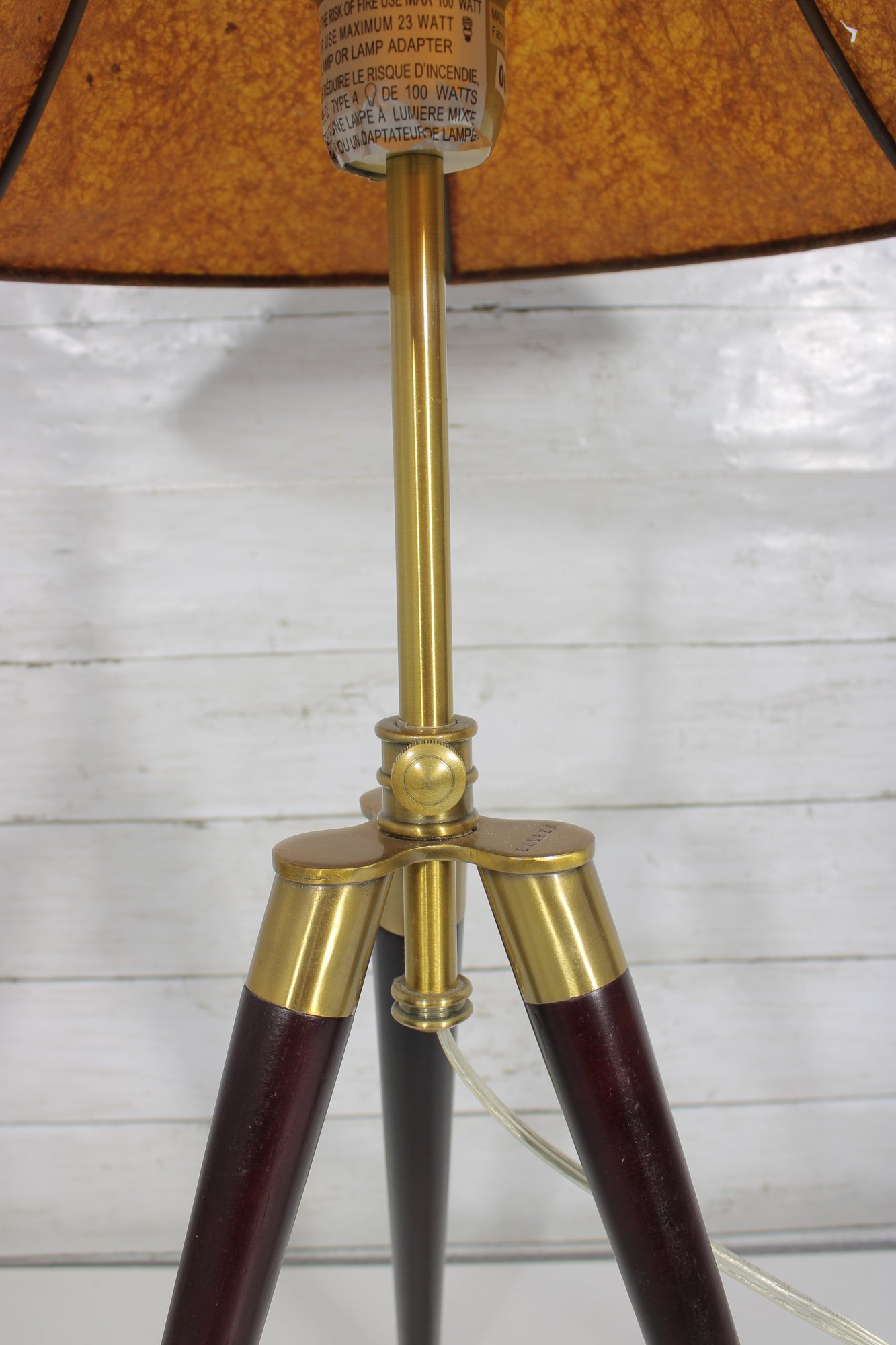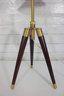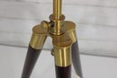 The lamp is marked “Lauren” and is constructed with quality materials, including solid wood legs and a brass central column. It has been tested and is in working condition.
