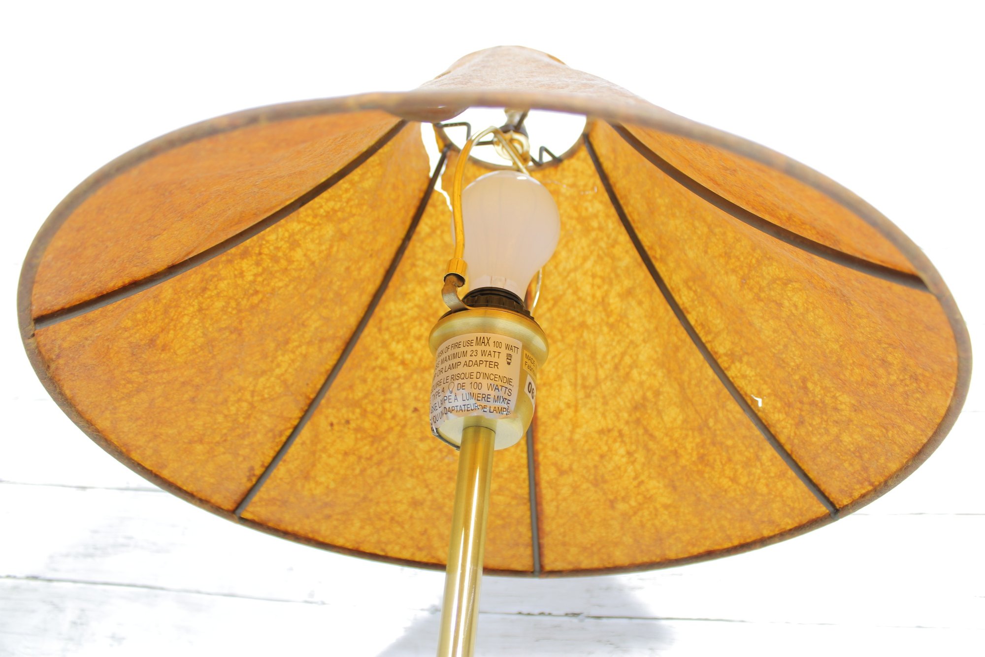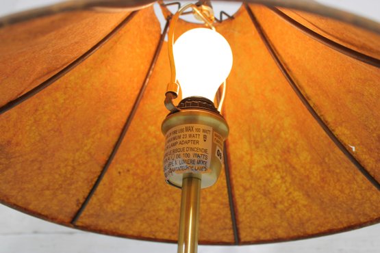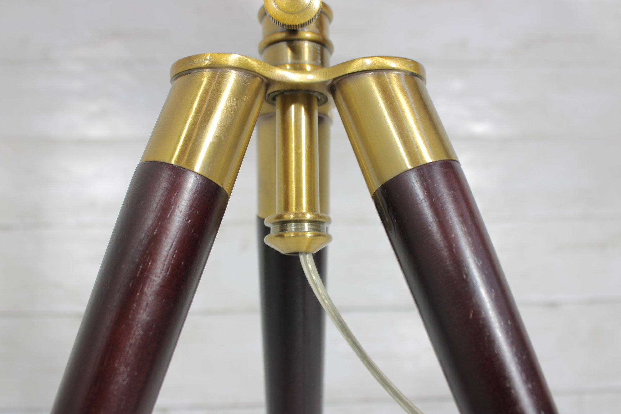 The lamp is marked “Lauren” and is constructed with quality materials, including solid wood legs and a brass central column. It has been tested and is in working condition.