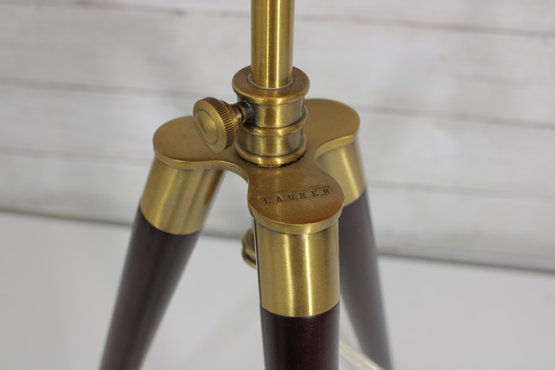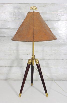 this Ralph Lauren tripod table lamp features a classic design combining warm wood legs with polished brass accents. Standing approximately 32 inches tall, the lamp showcases a sturdy tripod base with a refined, upscale look that fits perfectly in traditional, transitional, or modern interiors.