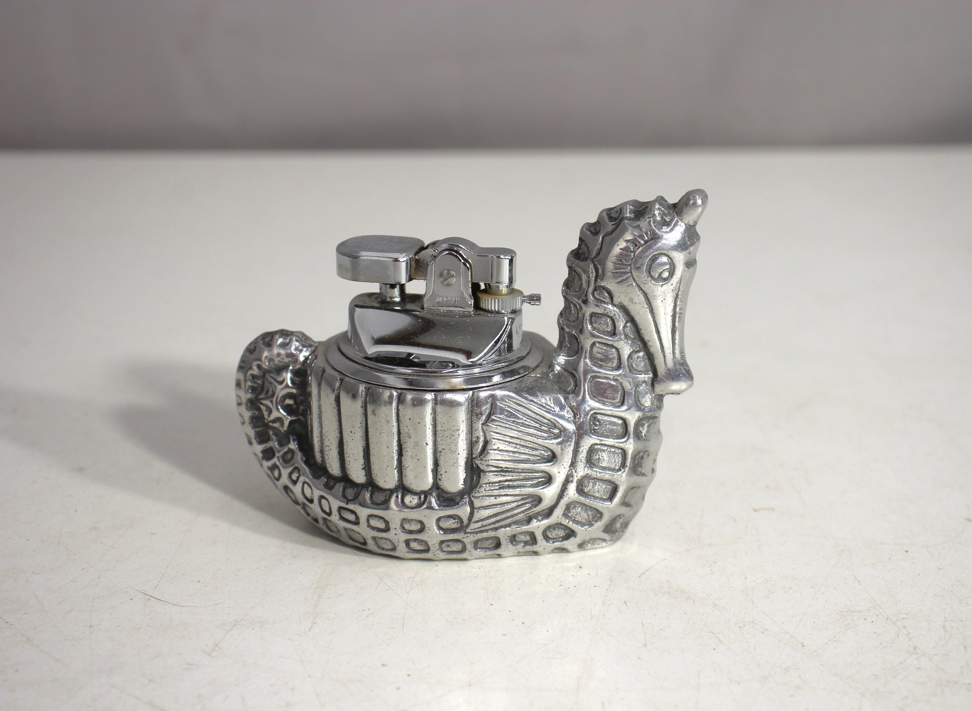 a rare and highly collectible 1950s Georges Briard seahorse table lighter. This intricately designed chrome-finished metal lighter features a sculpted seahorse motif, showcasing Briard’s signature artistry and mid-century charm.