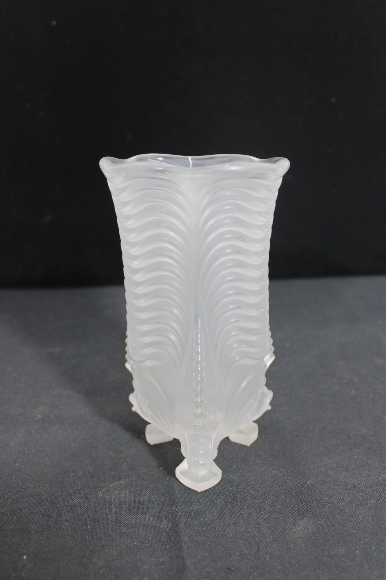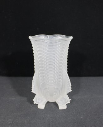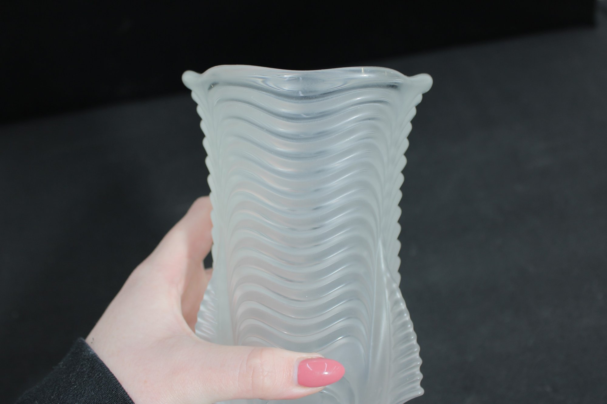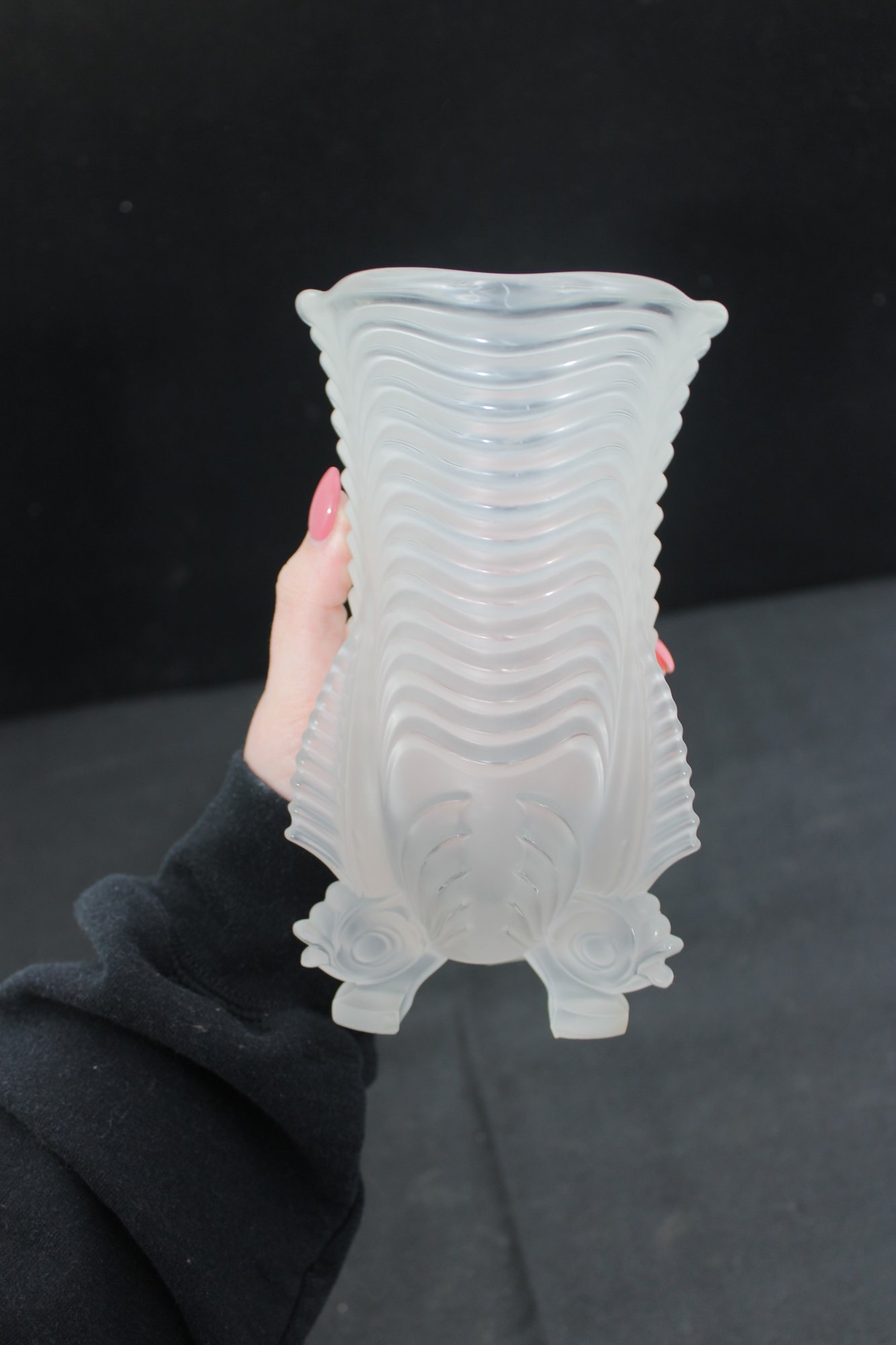 Rare and highly collectible Art Deco Barolac pressed glass vase, designed by Rudolf Schröter. This striking piece features a beautifully molded satin (frosted) finish with flowing, wave-like vertical patterns that create depth and movement.