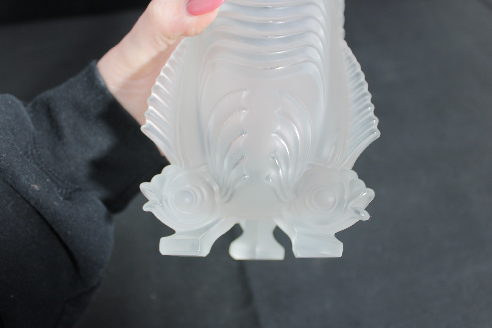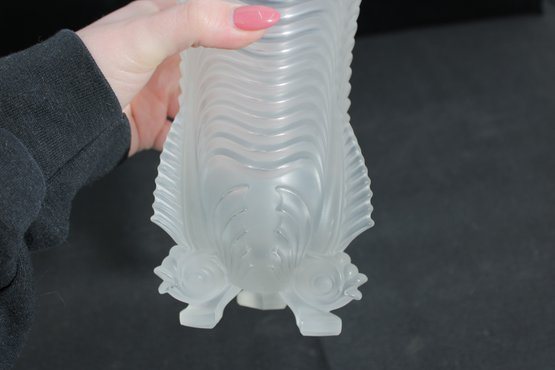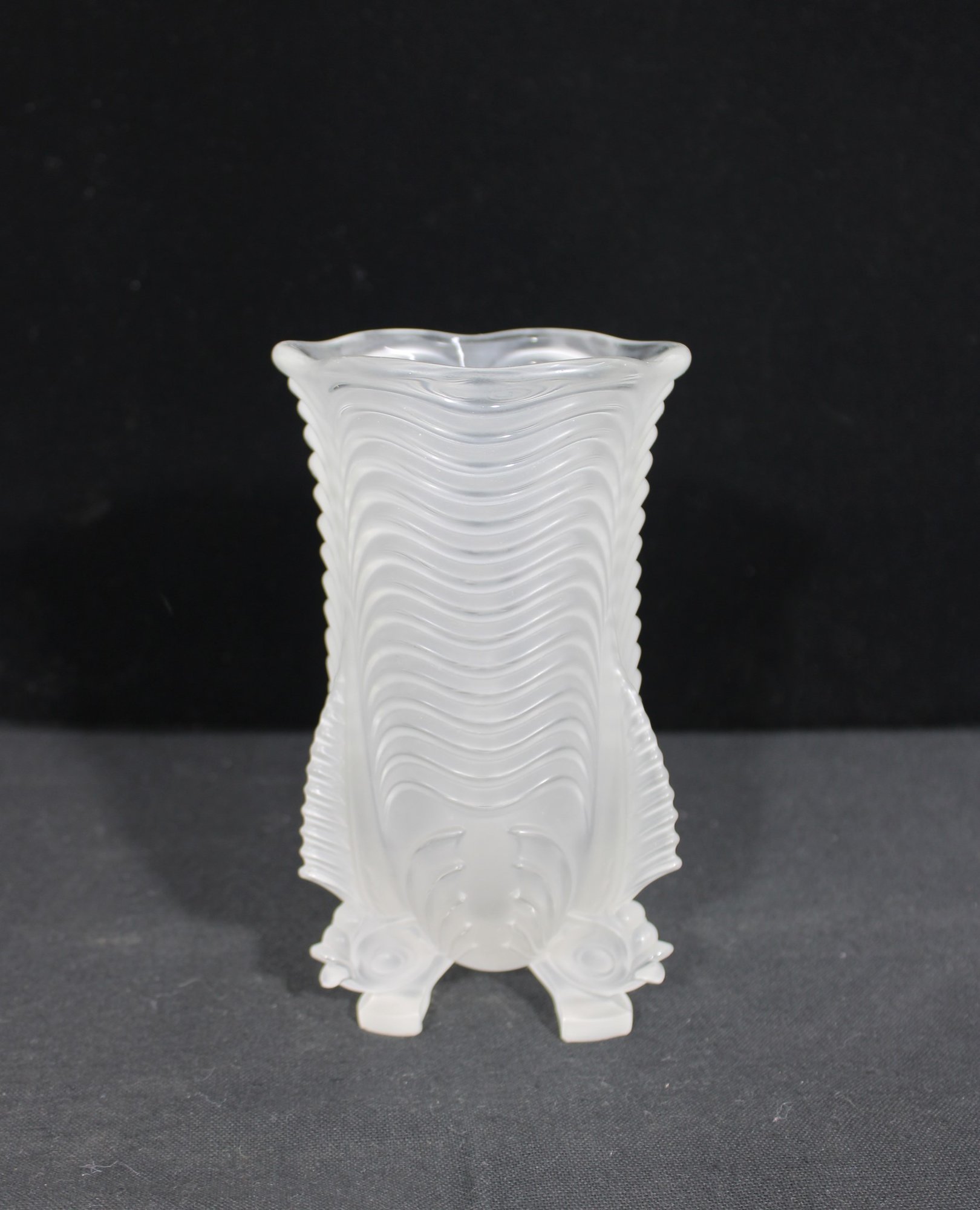 Rare and highly collectible Art Deco Barolac pressed glass vase, designed by Rudolf Schröter. This striking piece features a beautifully molded satin (frosted) finish with flowing, wave-like vertical patterns that create depth and movement.