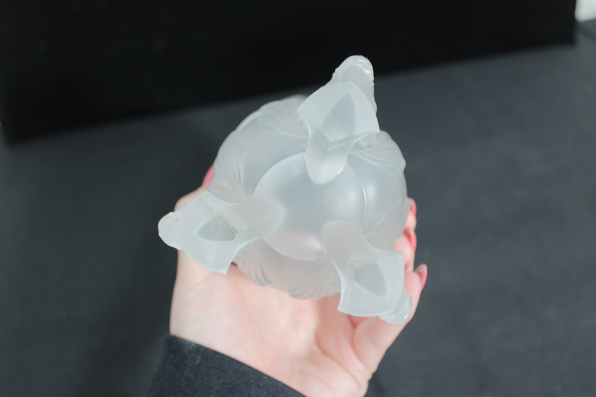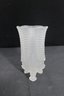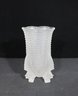 The vase stands on three stylized feet and has a softly scalloped rim, embodying the elegant and sculptural qualities of classic Art Deco design. The matte satin surface enhances the intricate molded details, giving it a refined, almost ethereal appearance.