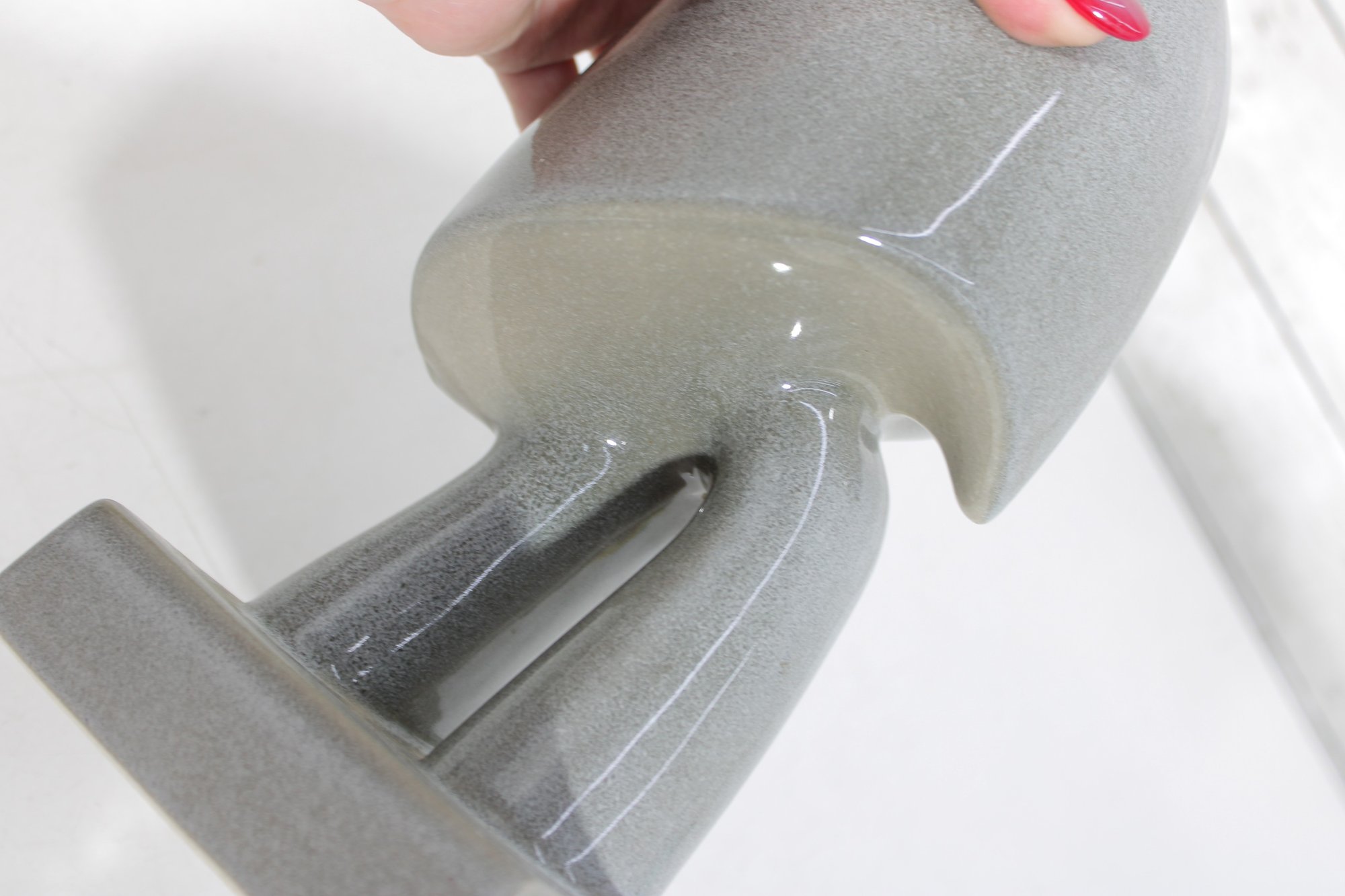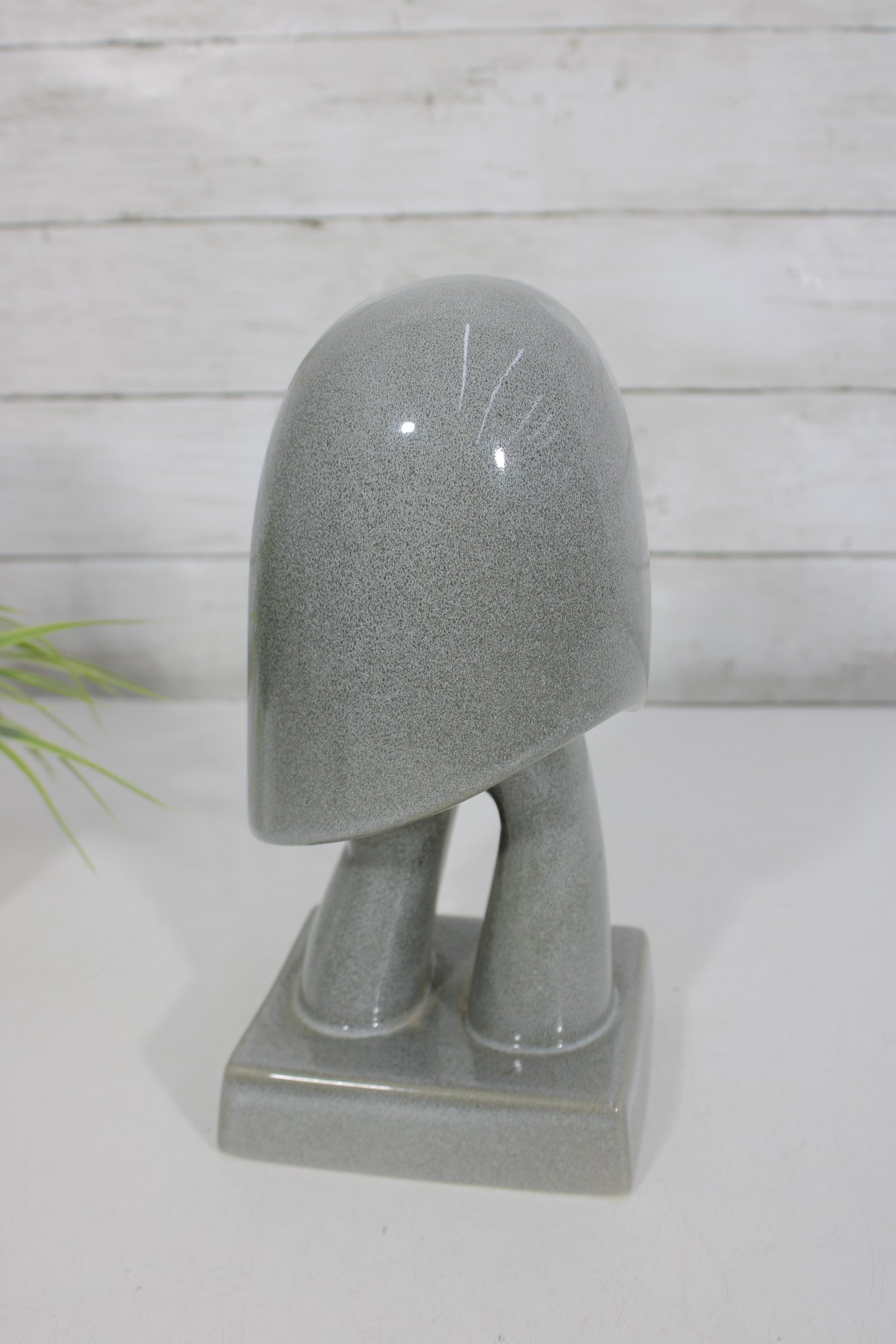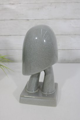 Finished in a soft speckled gray glaze, the surface has a subtle sheen that enhances its modern, understated elegance. The form is both artistic and architectural, making it a standout display piece.